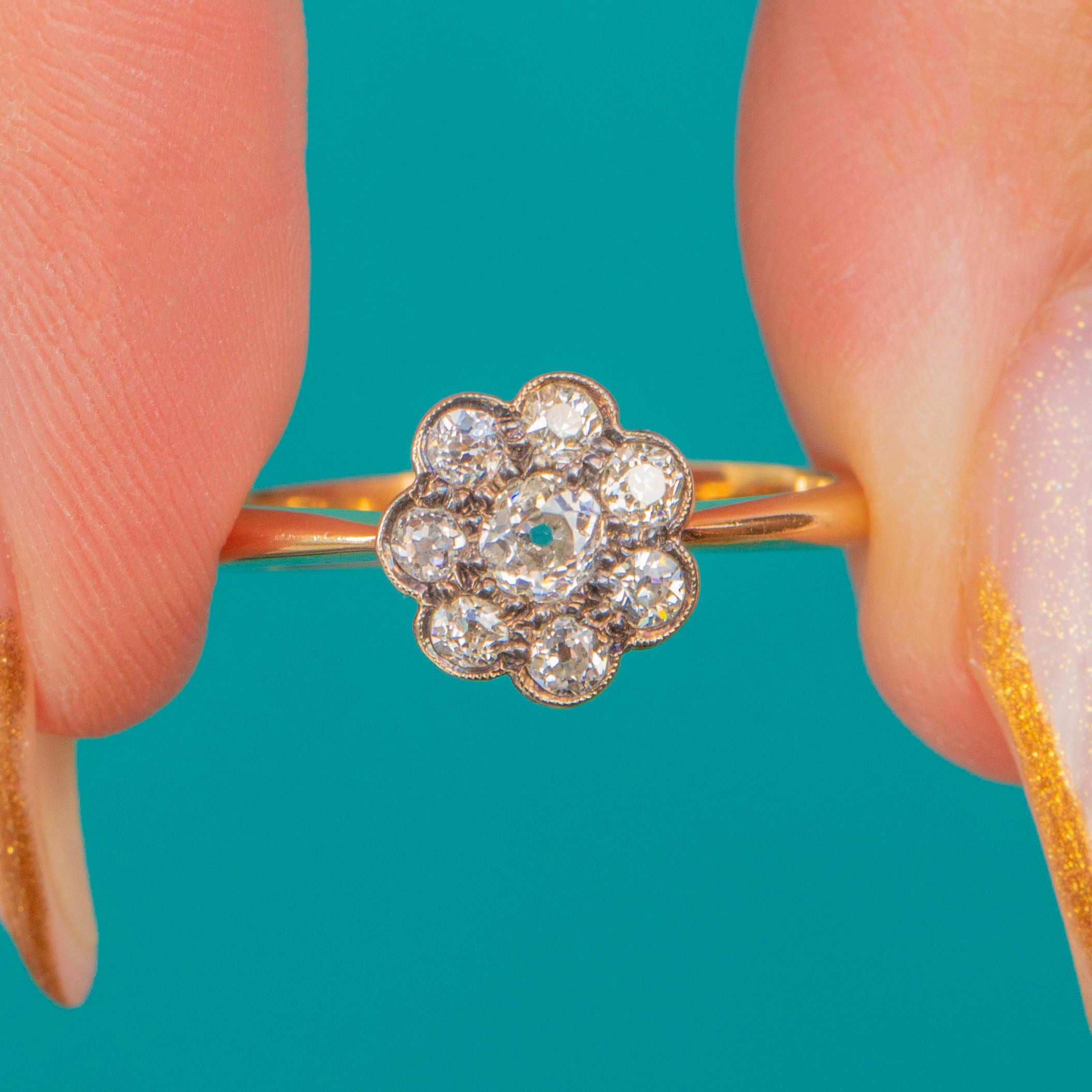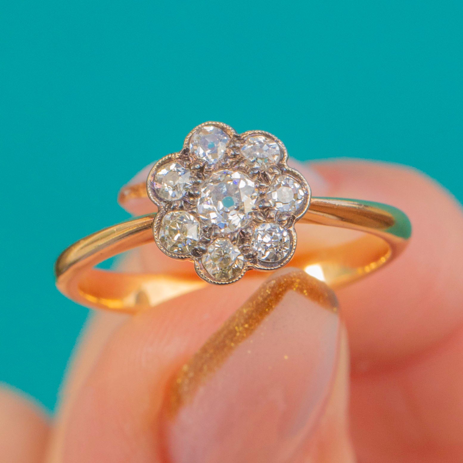 A beautiful Victorian Diamond cluster ring crafted in rich 18ct Gold with classic Silver milgrain settings, dating to the late 19th century. The central Diamond sparkles brightly, surrounded by a halo of matching old-cut stones that create a romantic, timeless cluster—an iconic choice for an antique engagement ring.