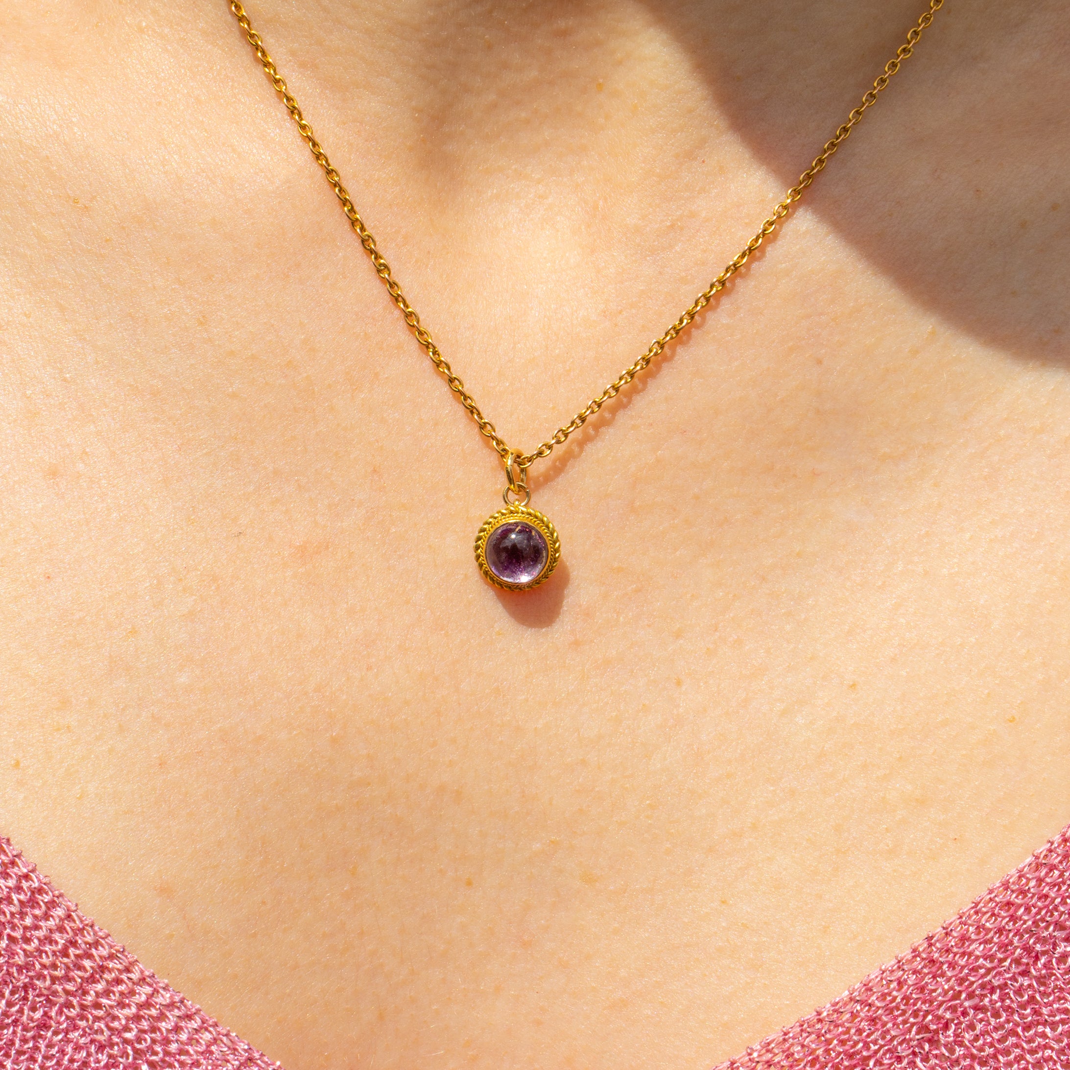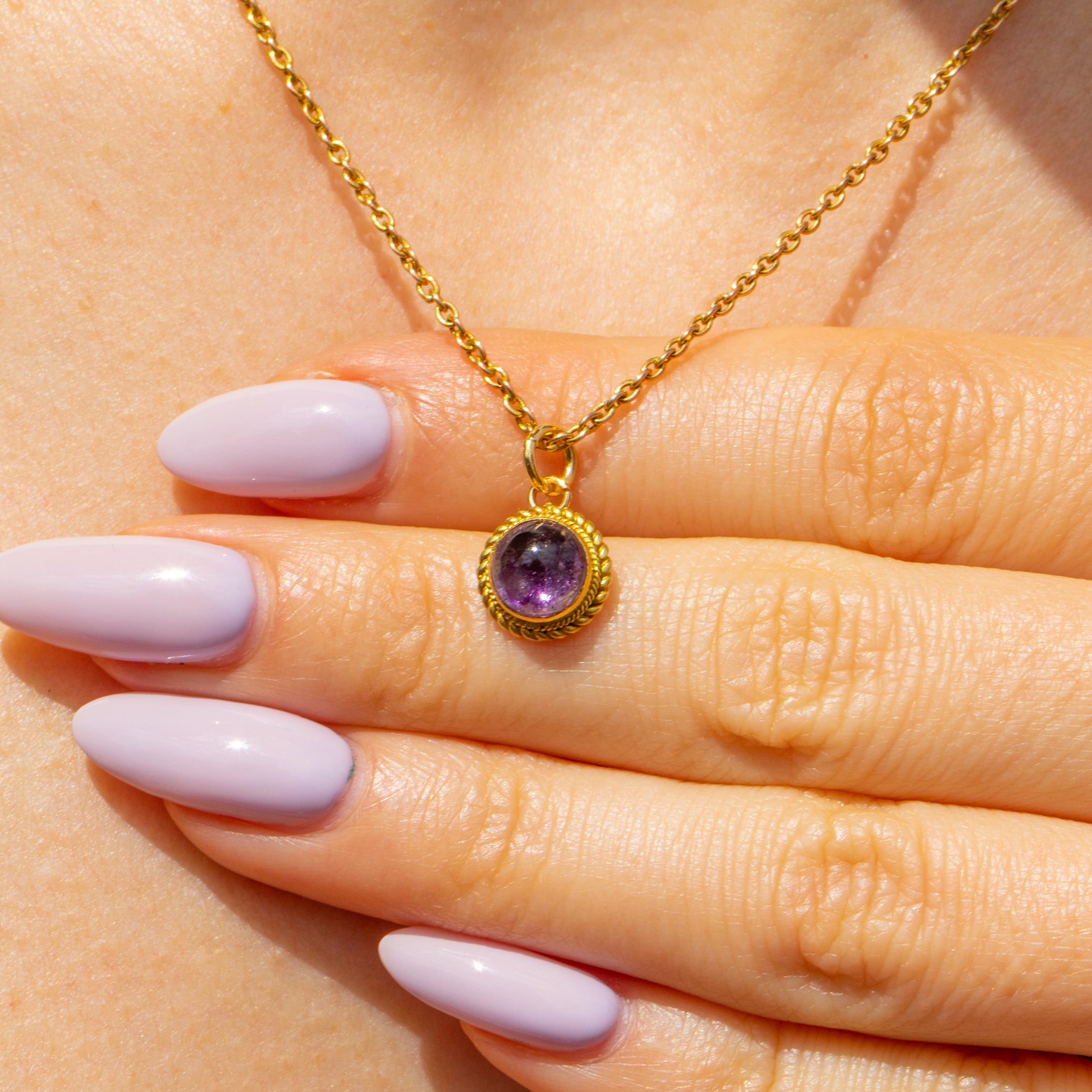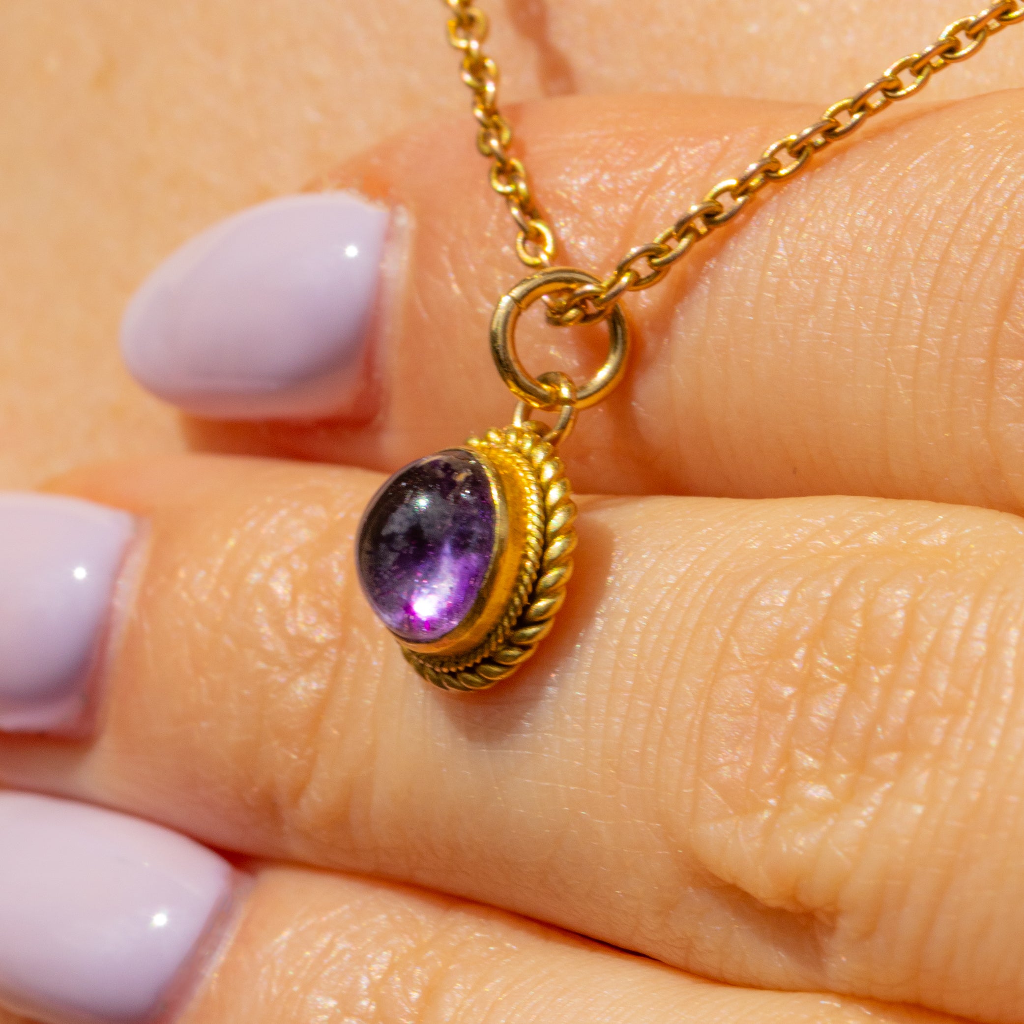 Deep violet hues sit at the core of her Amethyst cabochon, encased by a buttery 18ct Gold setting. Once suspended from an antique Gold chain, she will become a firm favourite within your jewellery collection!