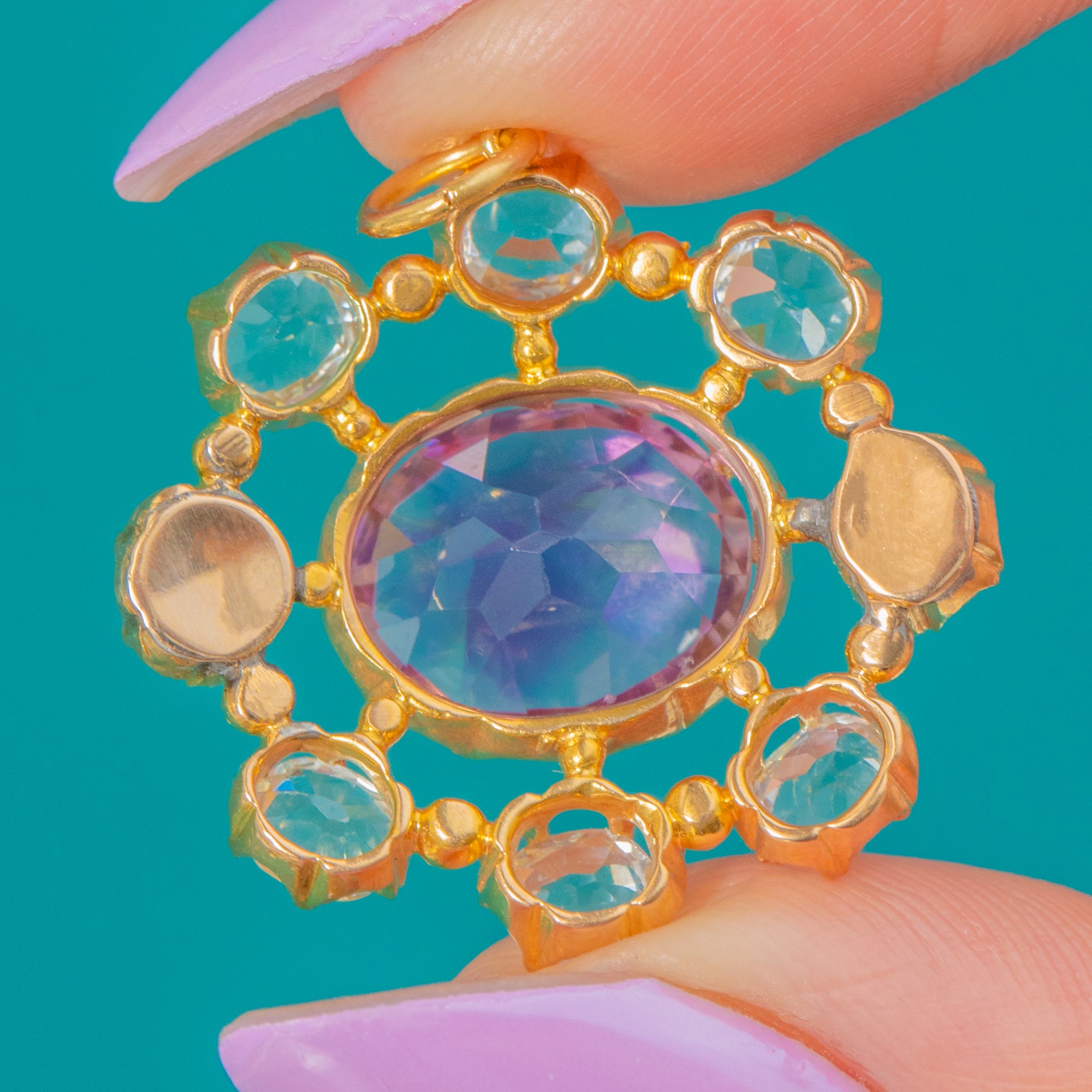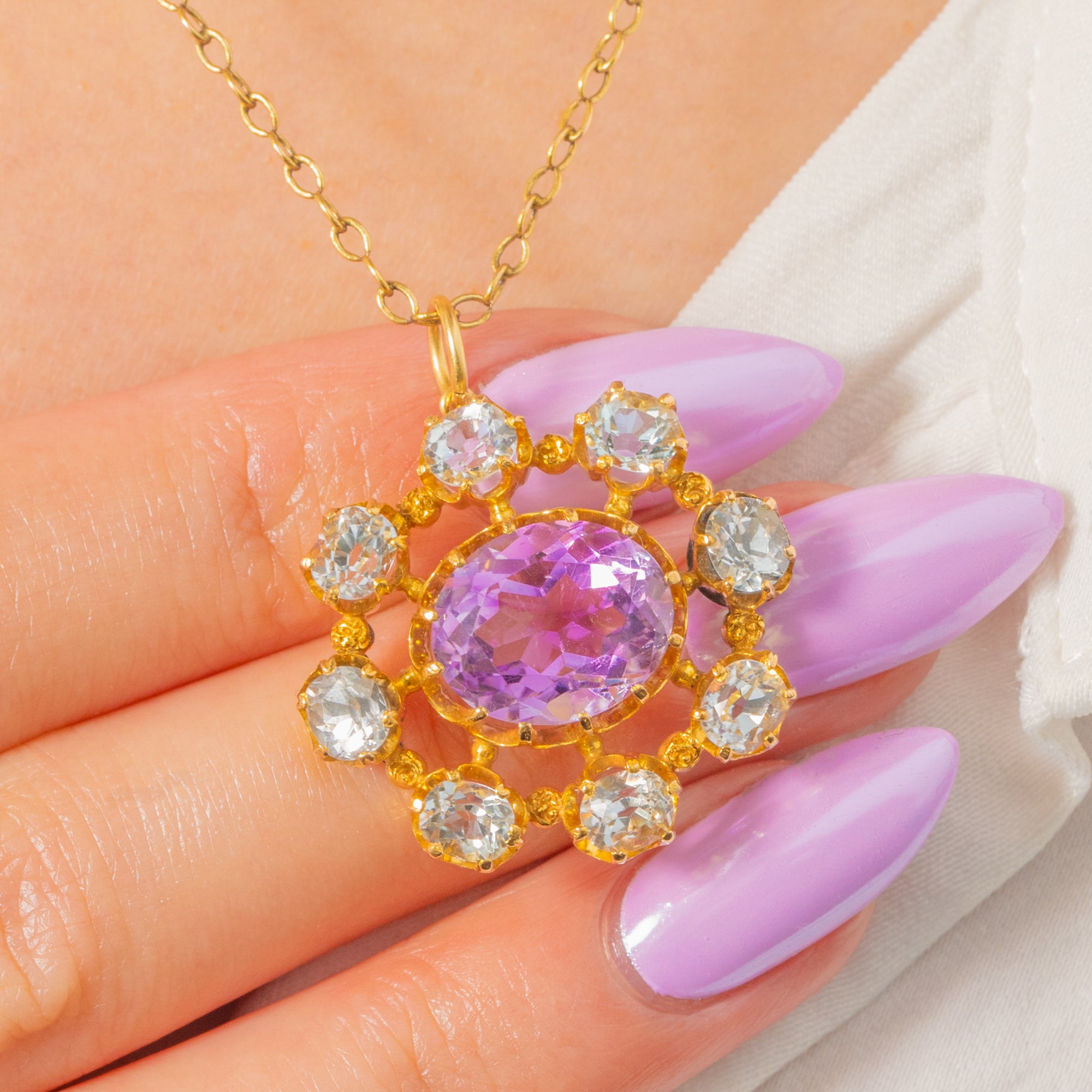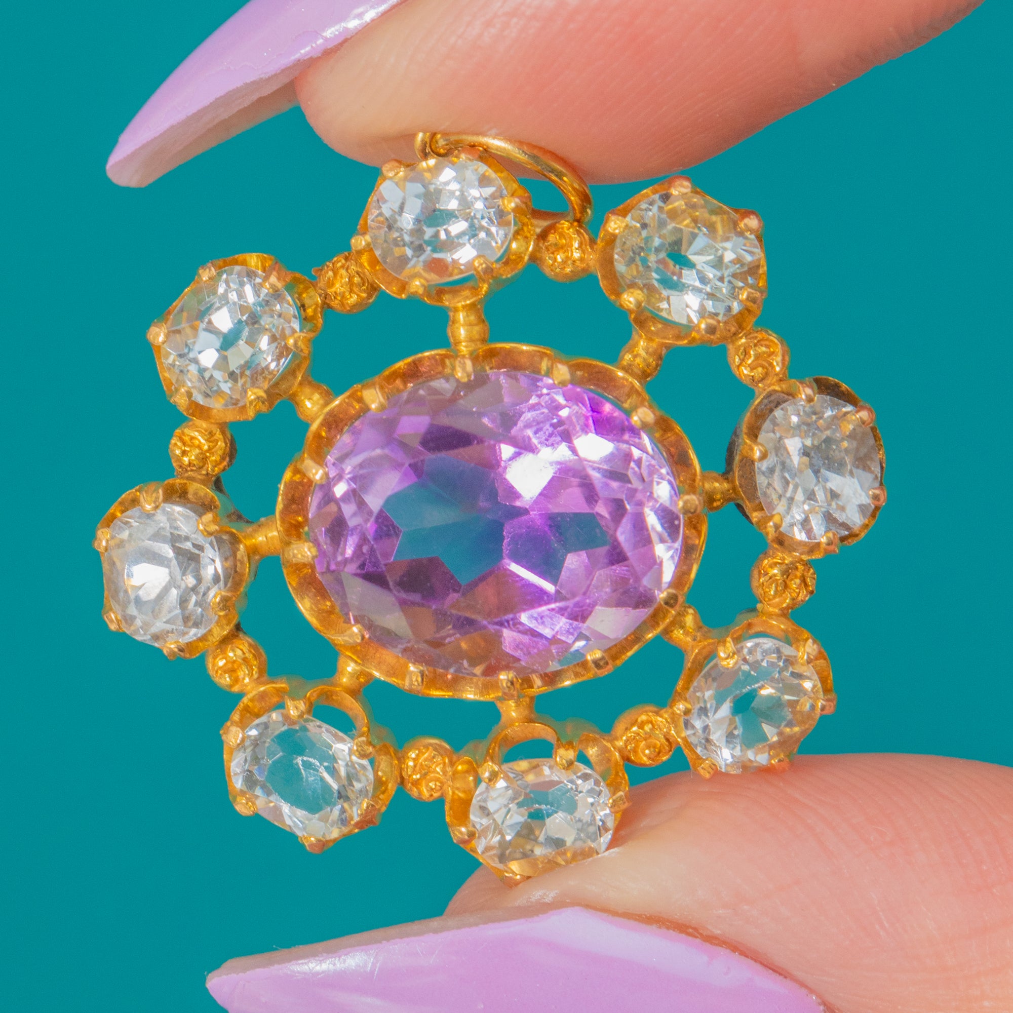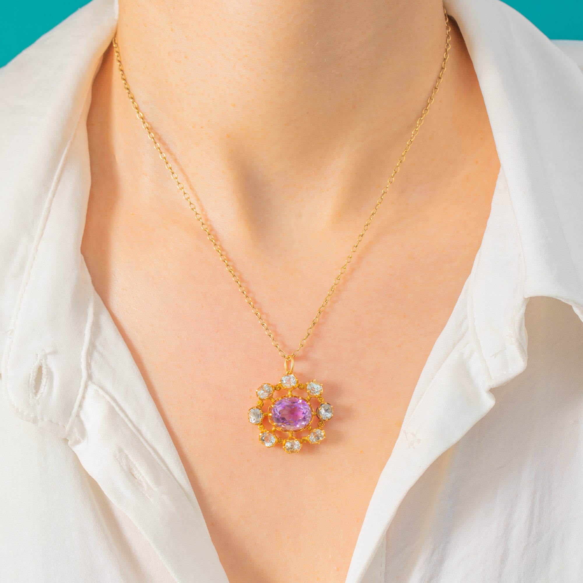 Imbued with the romance of the Victorian era, this 18ct Gold pendant showcases a sumptuous oval Amethyst encircled by sparkling Rock Crystals in a classic halo rosette. The regal purple heart stone glows beautifully against the warm hue of high-carat Gold, while the surrounding Rock Crystals add a bright, scintillating lift.