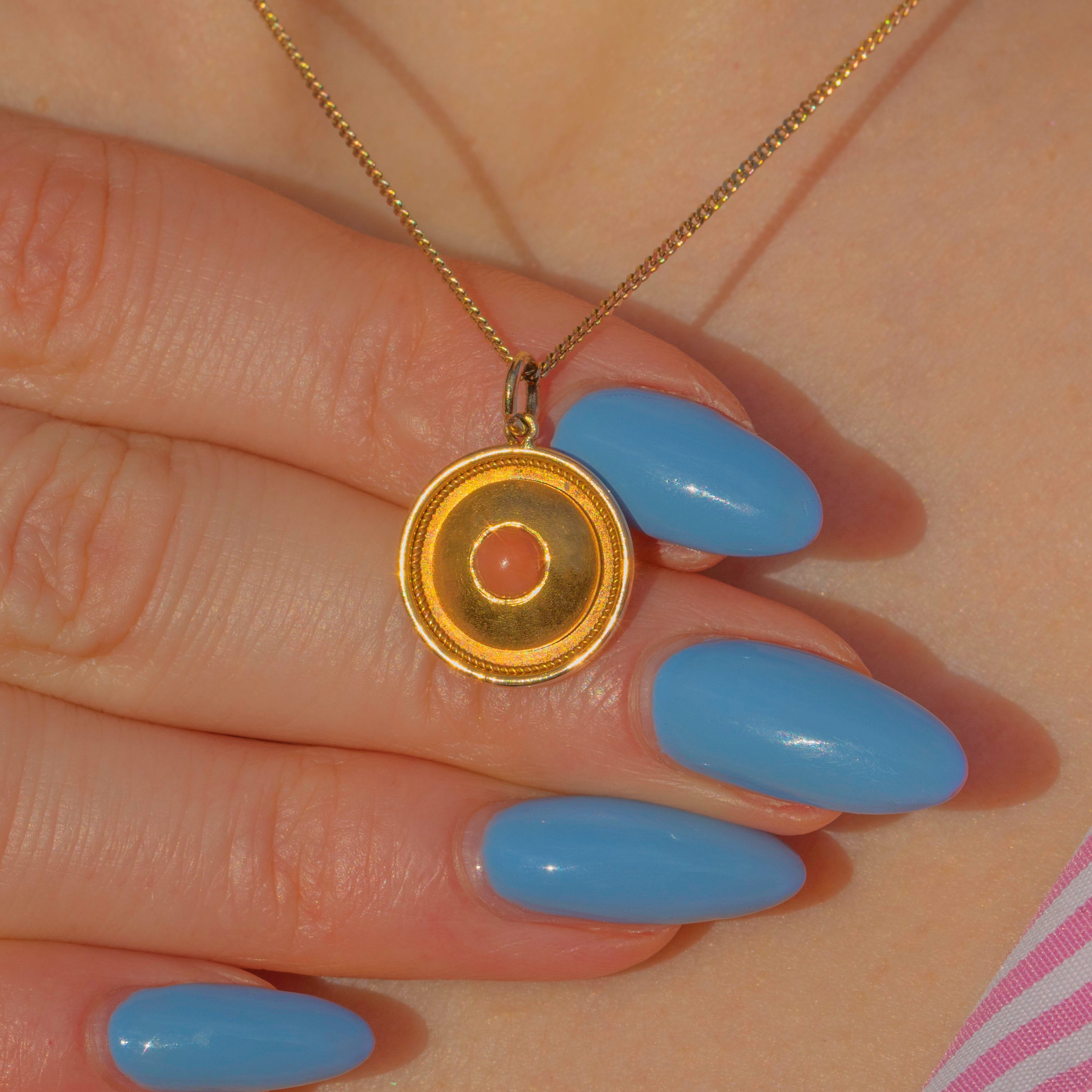 This Victorian 18ct Gold Coral button charm will make a lovely adornment for your favourite Gold chain! This antique pendant is a curvaceous little treat, crafted from saturated 18ct Gold with a satisfying satin finish and inlaid with a pastel-hued natural Coral cabochon.