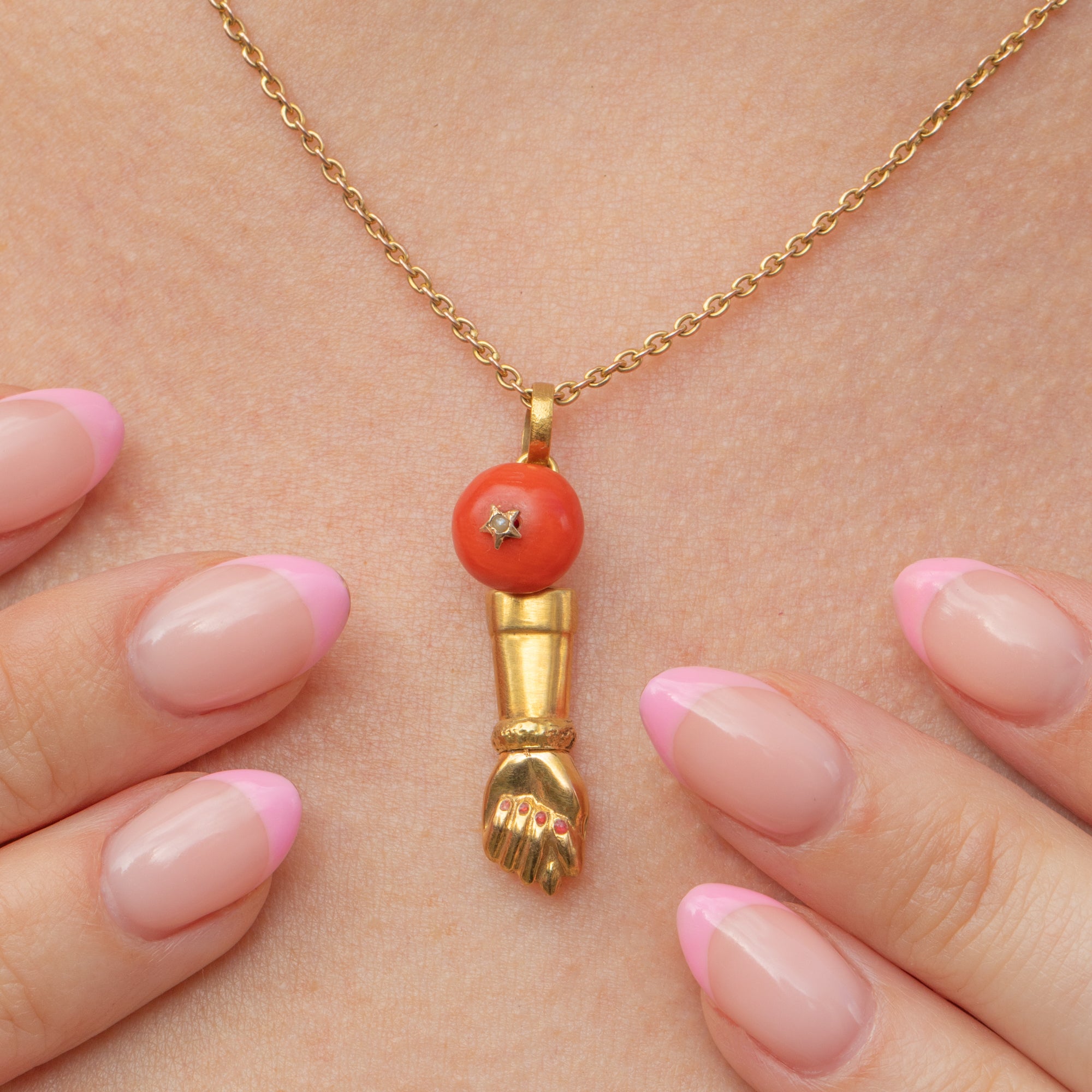 EXCELLENT. This unique antique 18ct Gold Coral Figa hand charm is in wonderful condition. It has kept incredibly well and is free from any chips or surface wear. Overall, she is a lovely antique item, and truly a one-off piece!