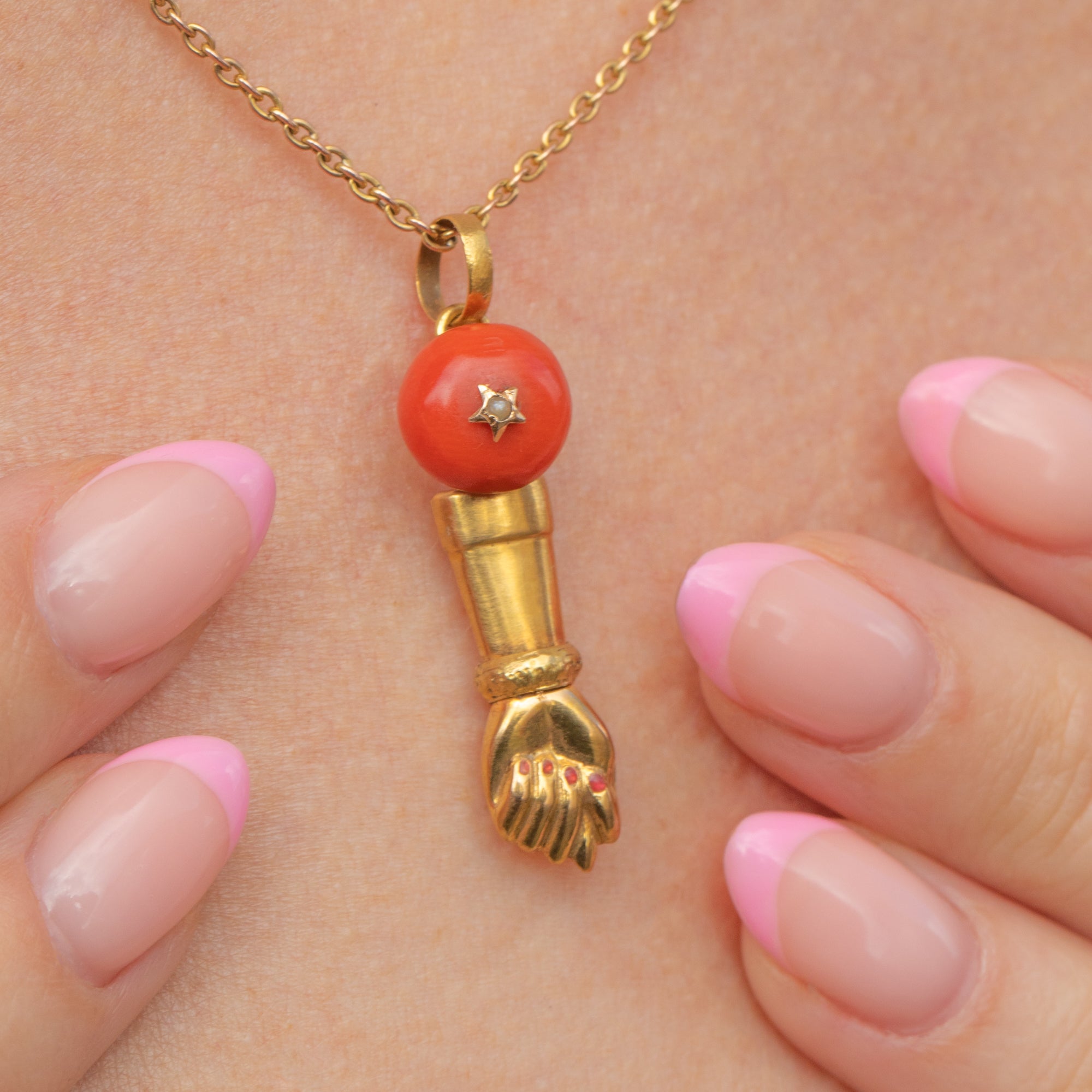 You'll never see anything else quite like this antique 18ct Gold Coral Figa hand charm! This Victorian pendant is composed of rich buttery Gold forming her intricate Figa hand, with a radiant Coral and a tiny star-set Pearl for luck! She will bring undeniable power to your antique jewellery collection!