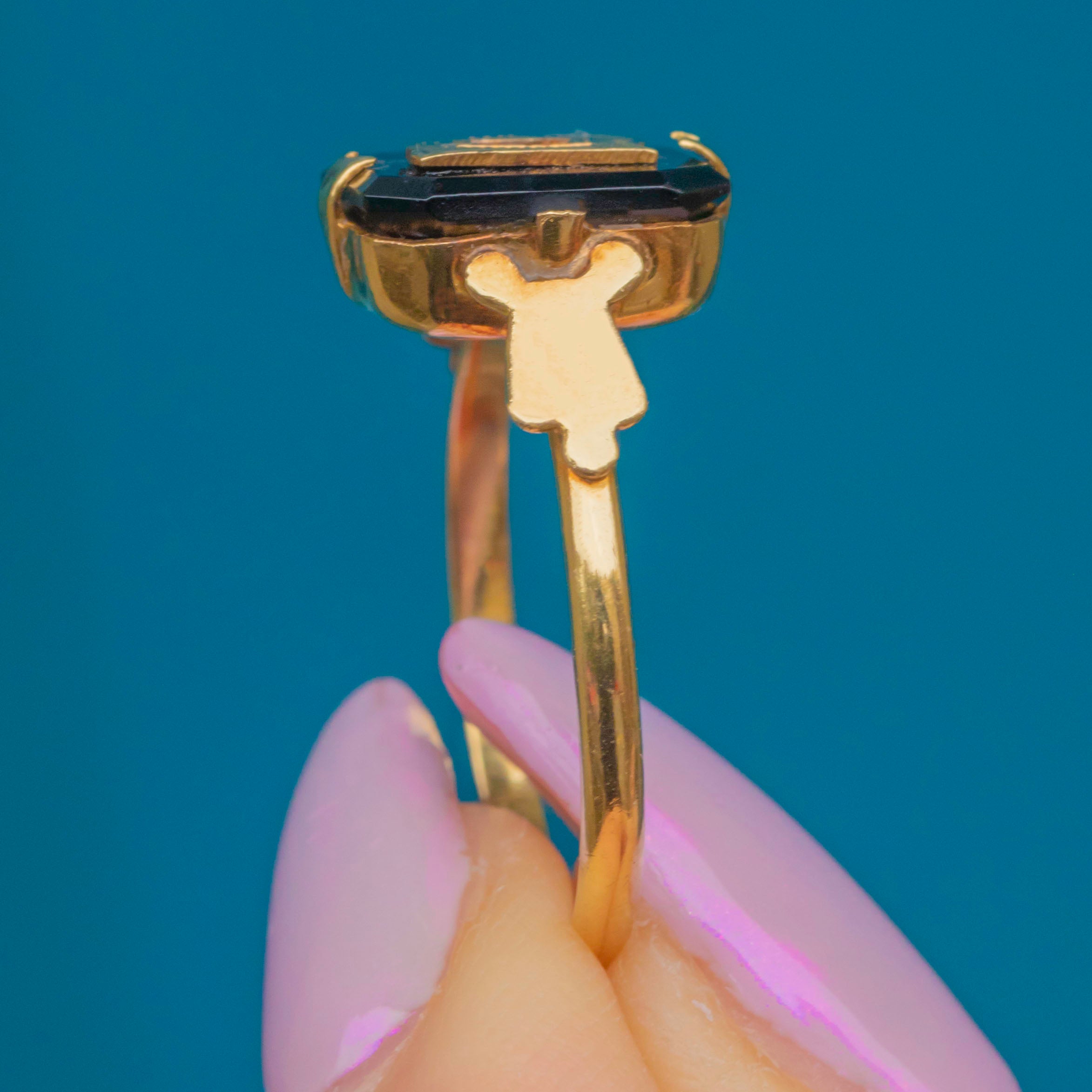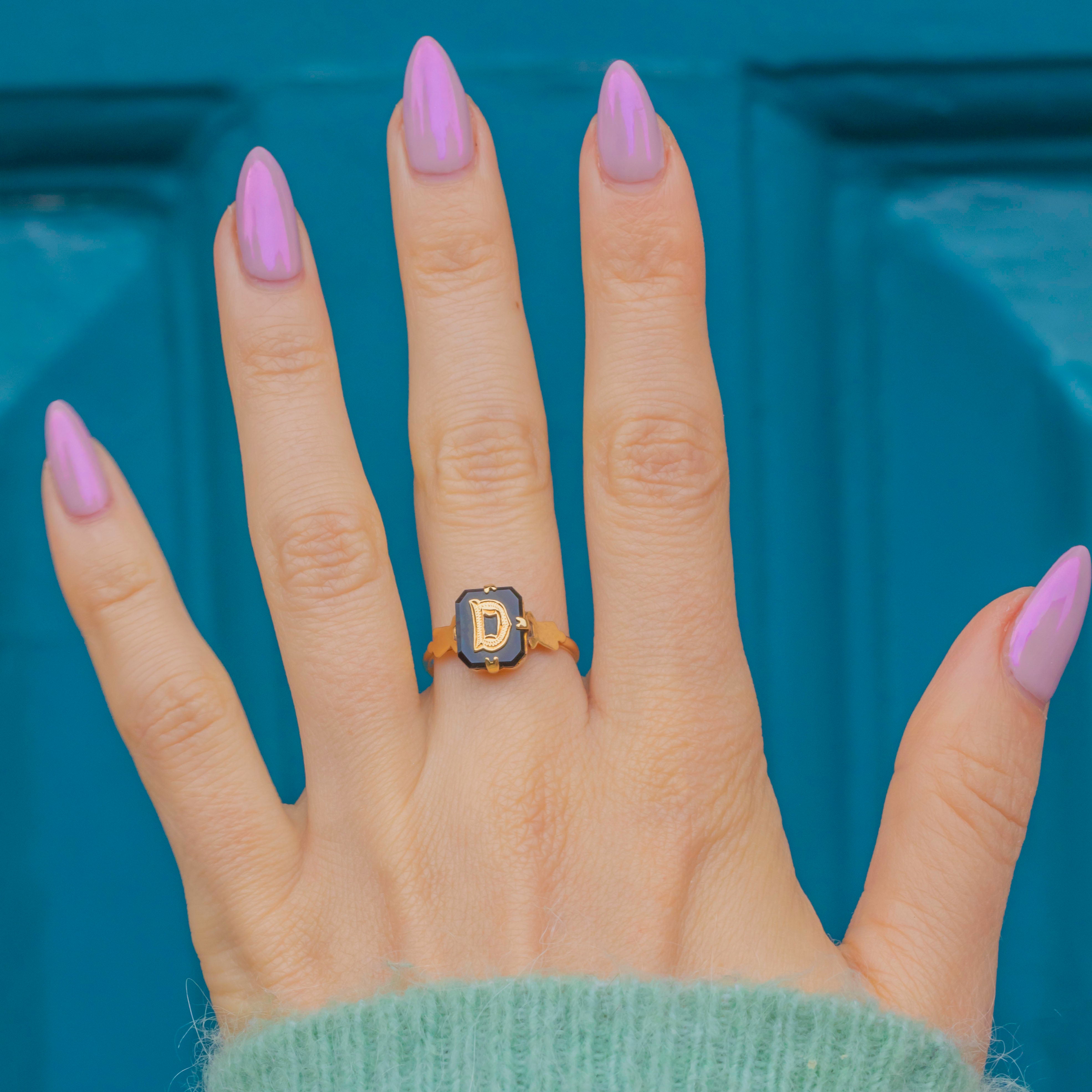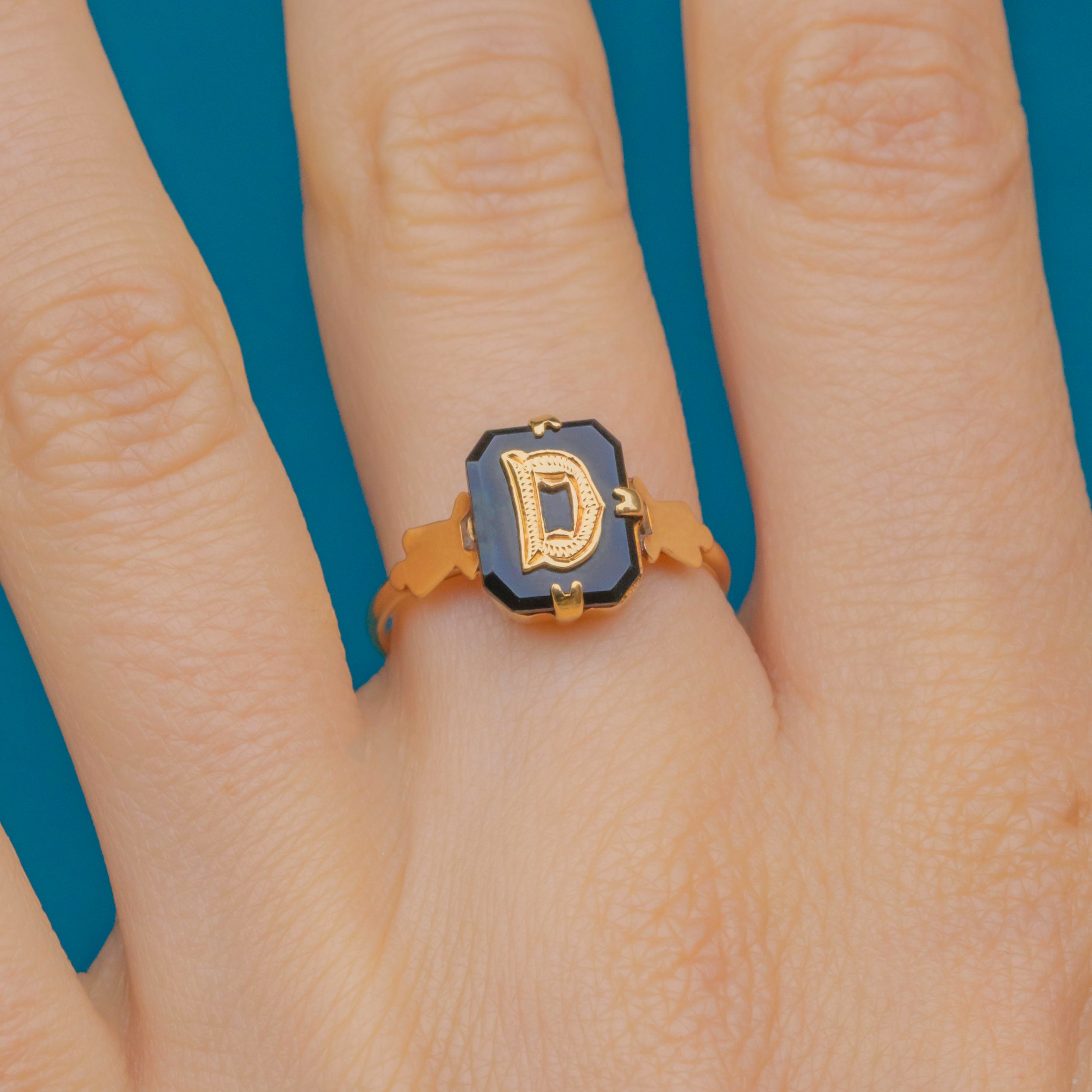 This elegant Victorian mourning ring is crafted in rich 18ct Gold and set with a polished black Onyx panel engraved with the letter “D”. The bold contrast between gleaming Gold and glossy black Onyx is timeless, embodying both sentiment and refinement.