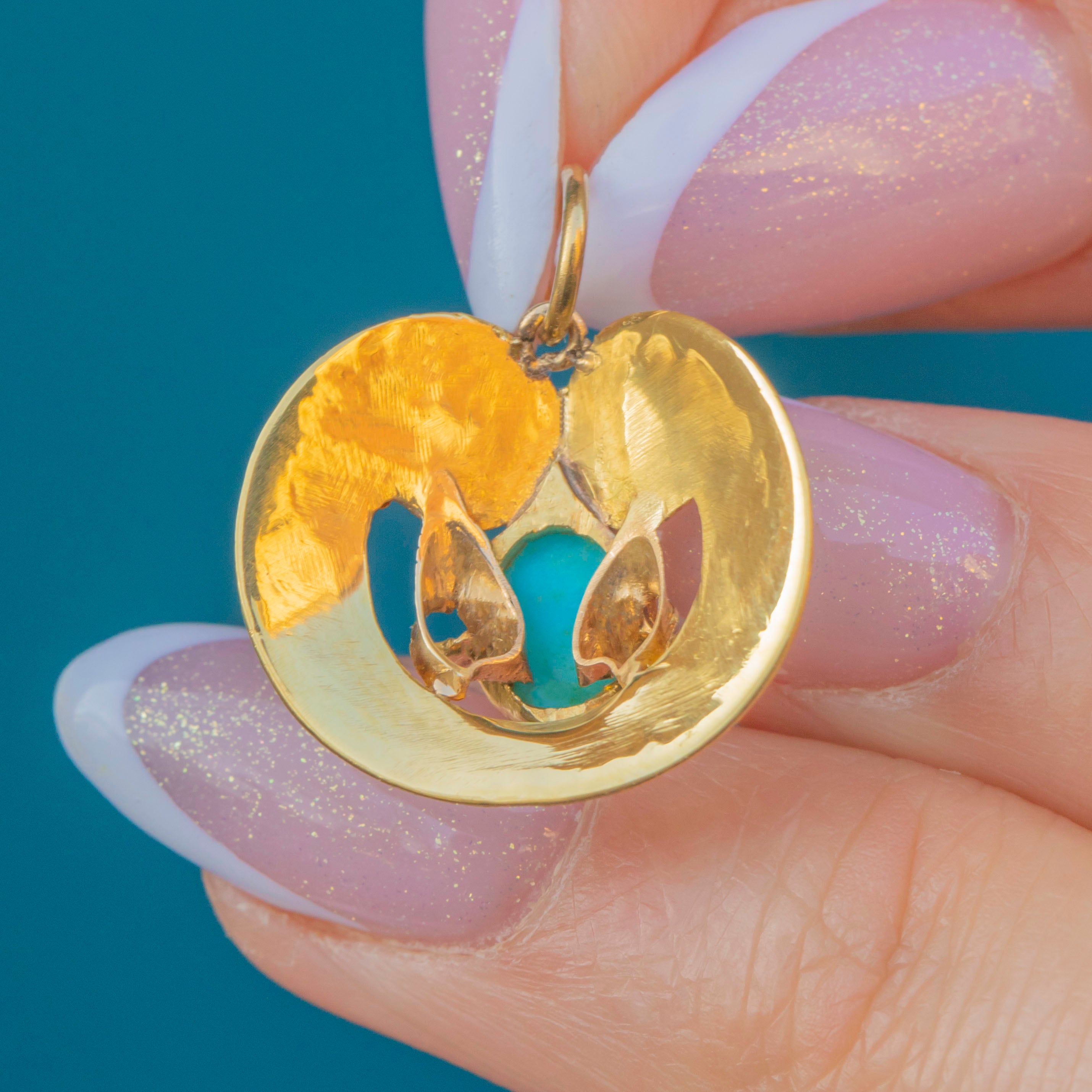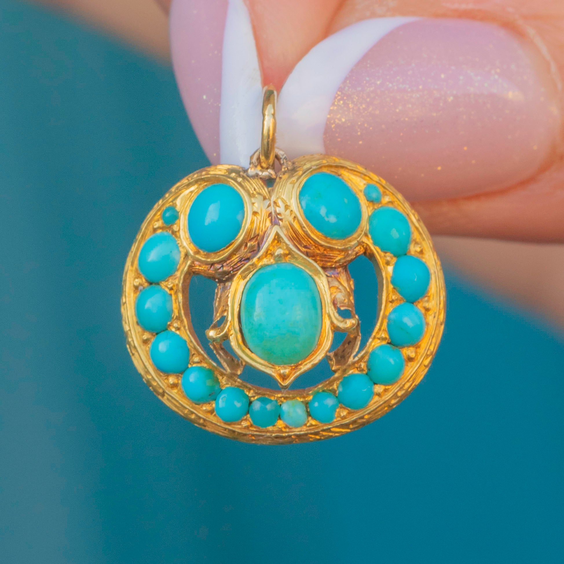 VERY GOOD-EXCELLENT: This Victorian 18ct Gold engraved Turquoise cluster pendant is in wonderful condition. The Gold is brightly saturated and the details have all remained defined. Under close inspection, there is some mild wear to some of the settings, including the central Turquoise where the setting has come away slightly from the stone. However, this does not detract from the beauty of the piece and the Turquoise gems all remain securely set. The jump ring has been soldered shut, so you can wear this Victorian Turquoise pendant with the utmost confidence!