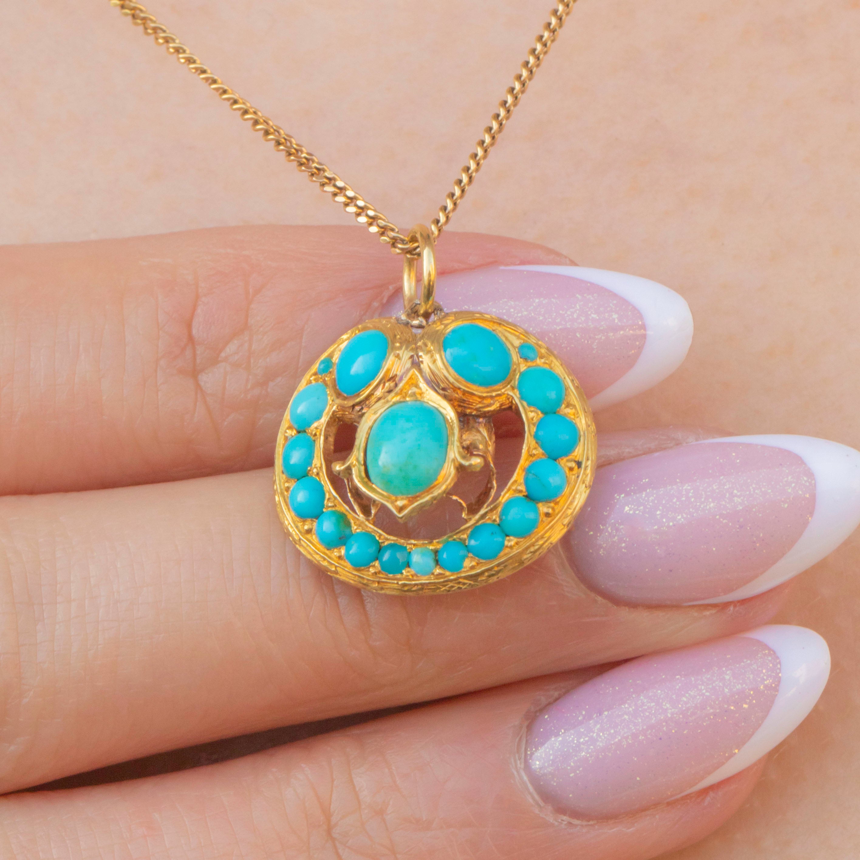 Stand out from the crowd with this exquisite Victorian 18ct Gold engraved Turquoise cluster pendant! Crafted from saturated 18ct Gold, this antique pendant has been inlaid with vibrant Turquoise stones, their bright cyan blue hues complemented by their bright yellow Gold settings, creating a striking contrast.
