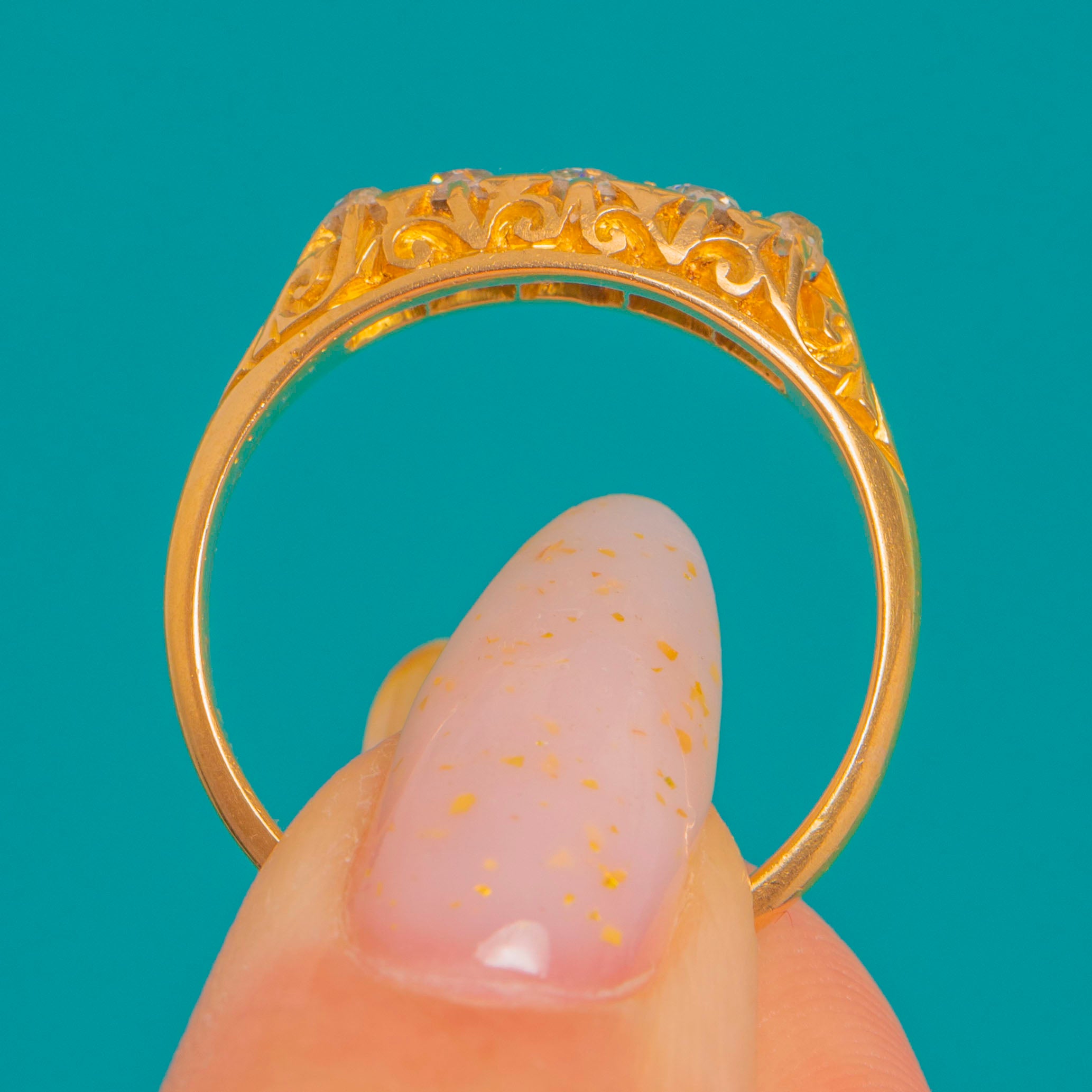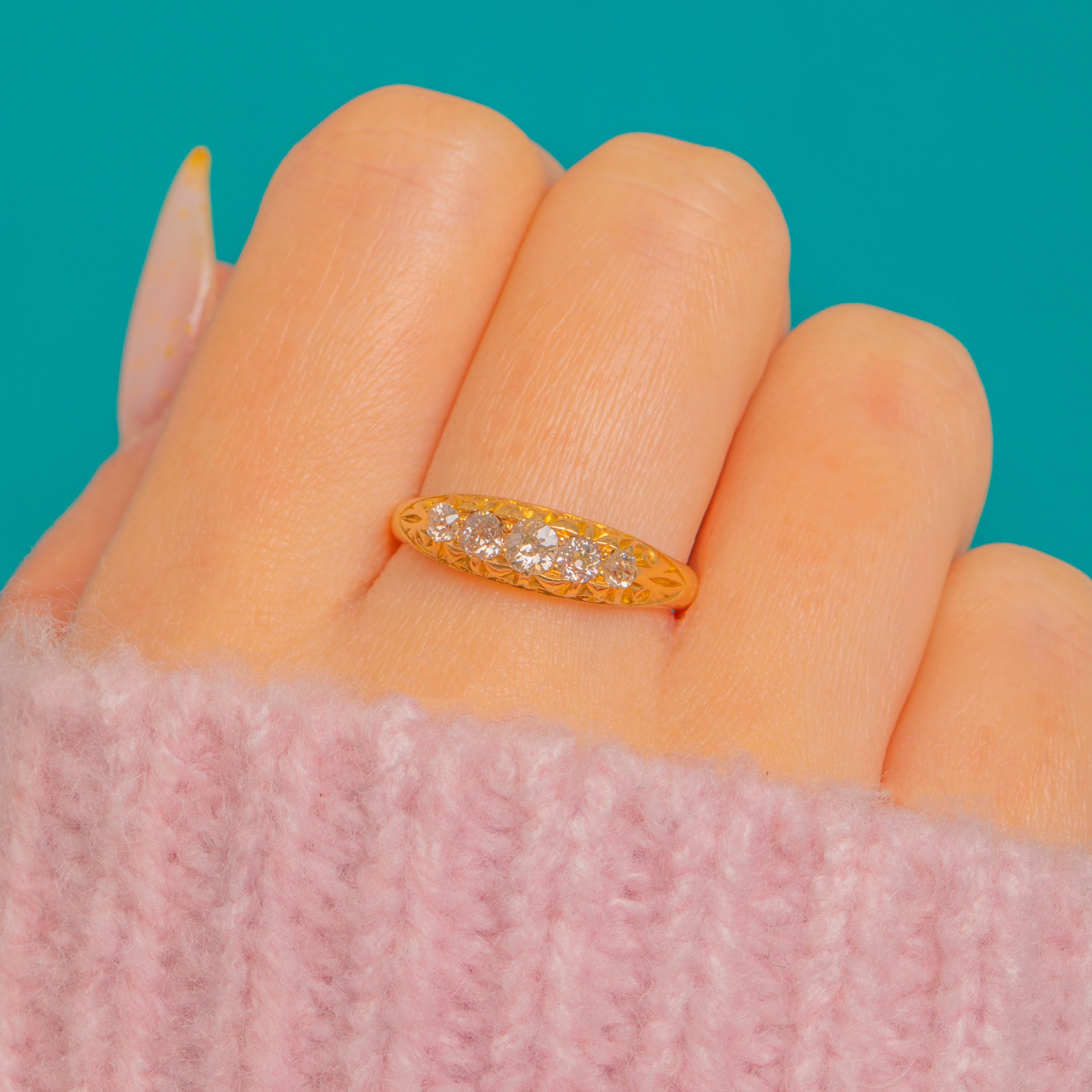 A delicate Victorian five‑stone ring set with graduated old‑mine cut Diamonds in individual collet settings. The low navette top sits above a pierced foliate and scroll gallery, with hand‑cut bright‑cut engraving on the shoulders for an ornate yet restrained finish.