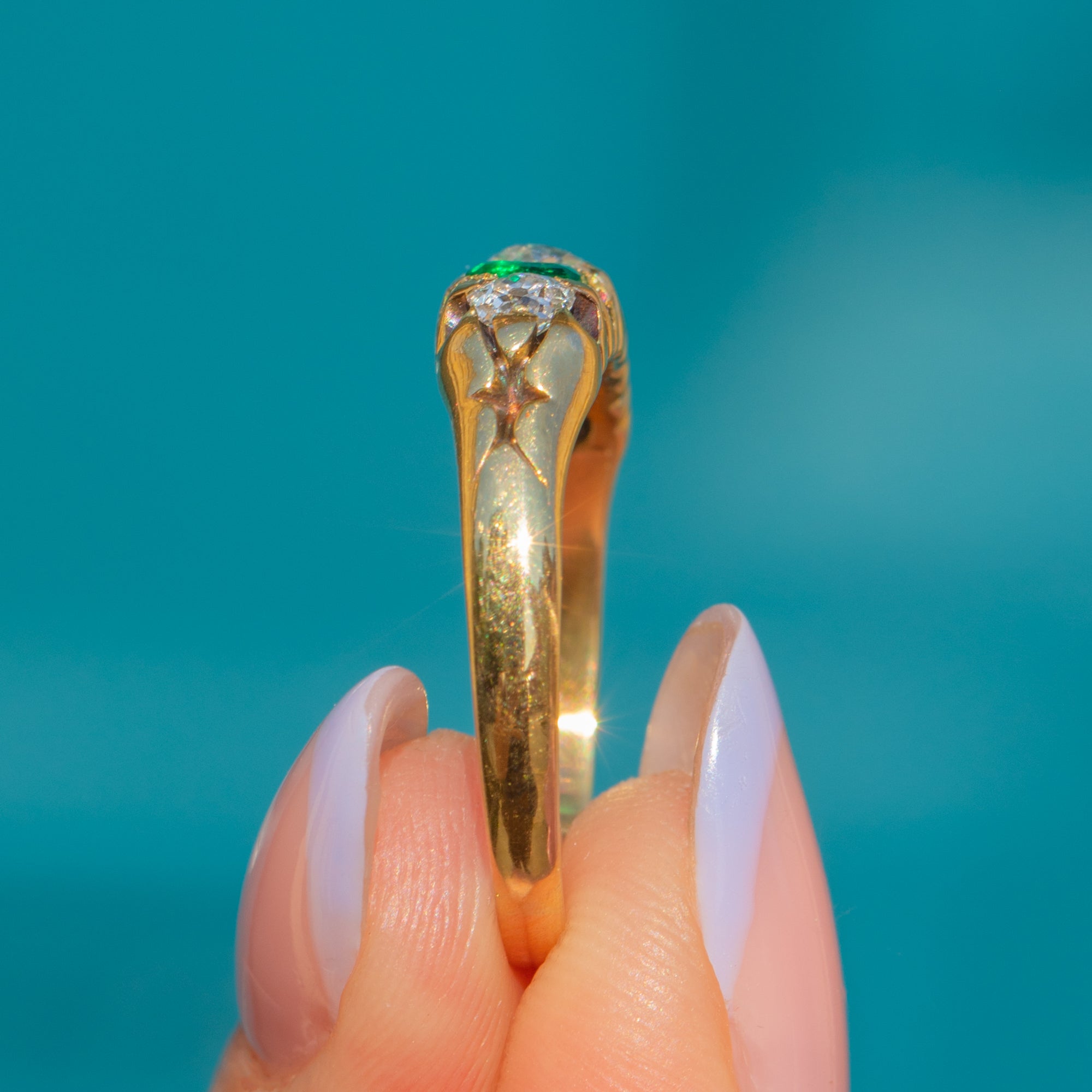 Victorian 18ct Gold Old Mine Cut Diamond Emerald Five Stone Ring, Carved Shoulders Item added