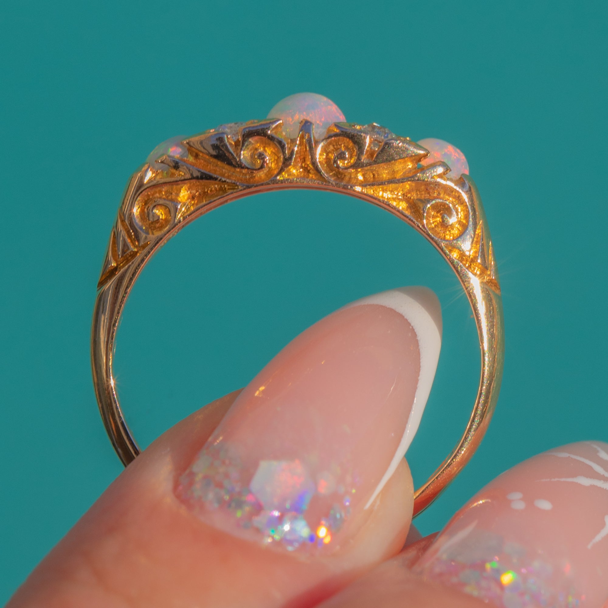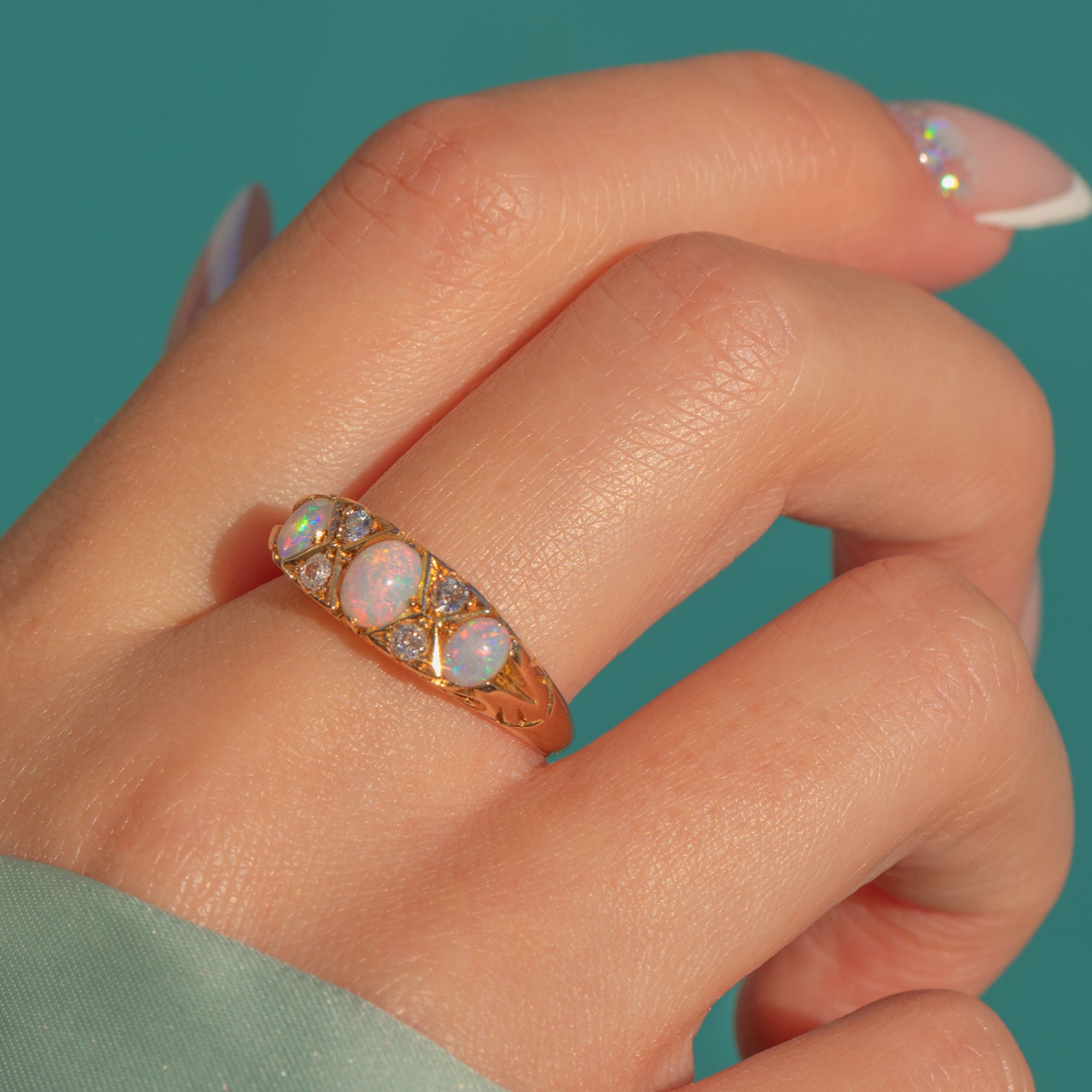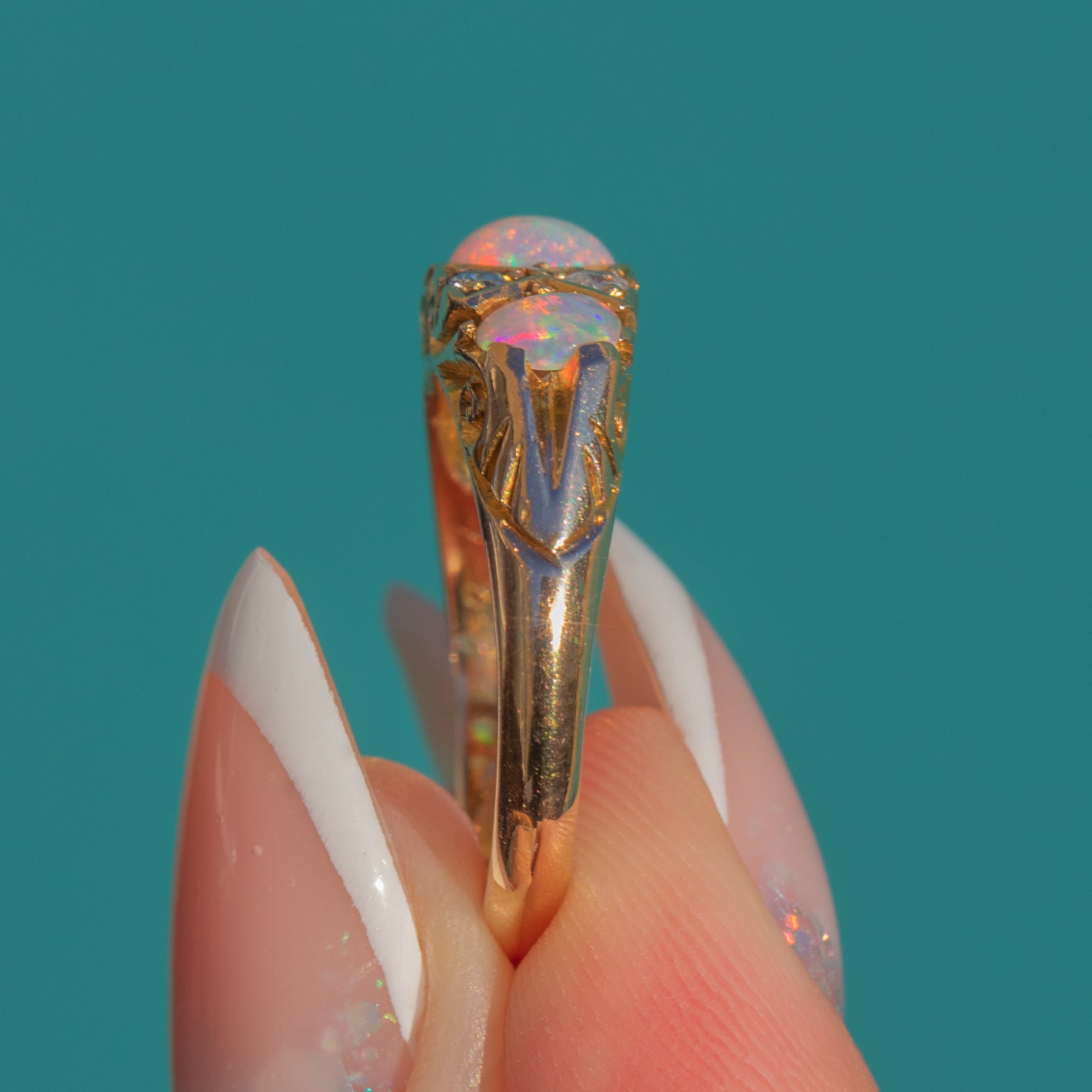VERY GOOD: The Opals and Diamonds are bright and well-matched with no chips visible under close inspection. The carved Gold gallery and band show light wear in keeping with age but retain crisp detail. No evident resize marks; engraving and hallmarks remain legible.