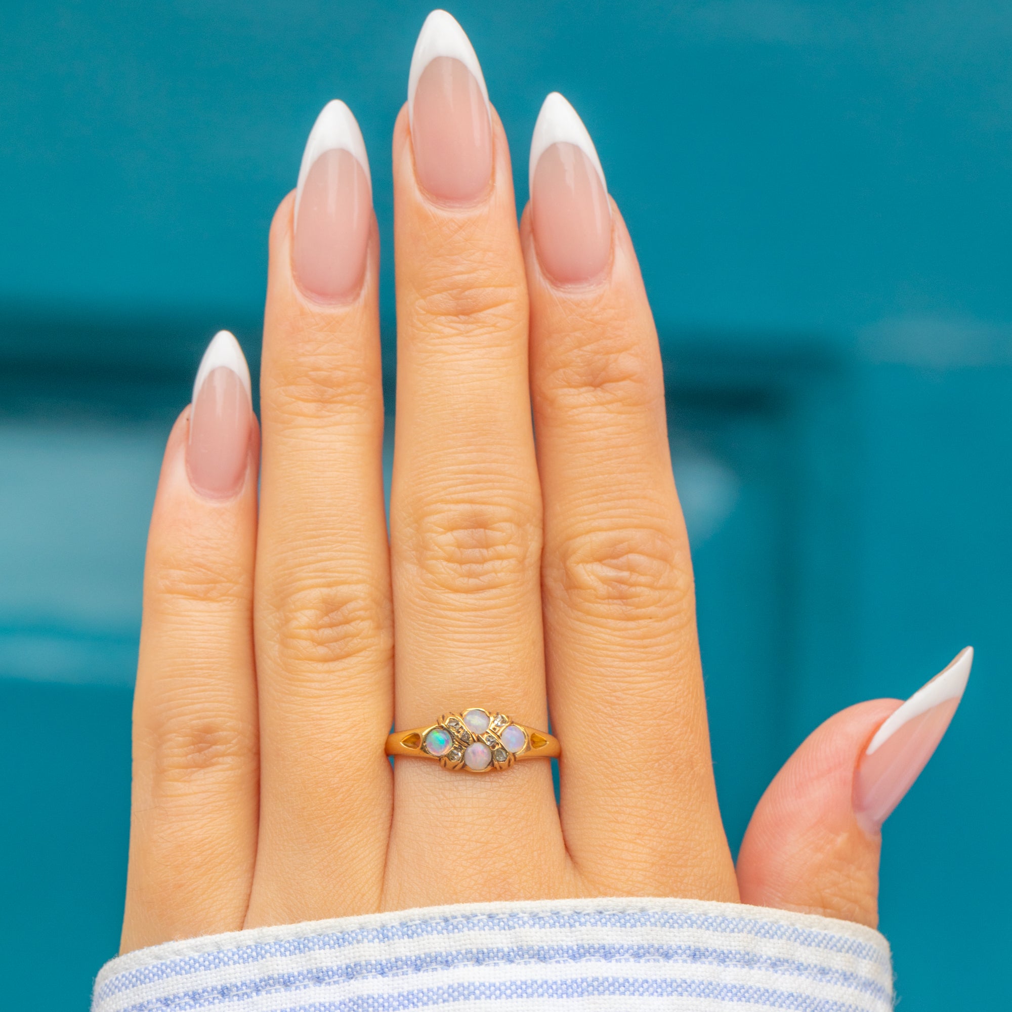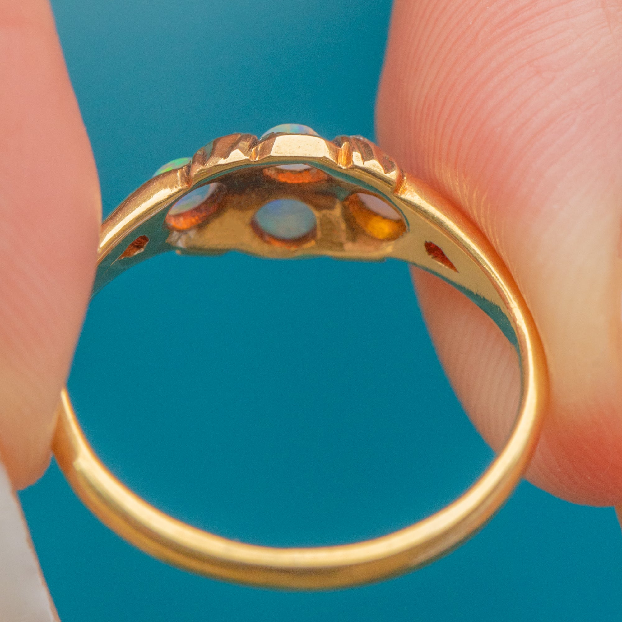 This Antique Victorian ring is crafted in rich 18ct Gold and set with luminous Opals and glittering old-cut Diamonds. The Opals display beautiful play-of-colour, flashing green, orange, and blue, while the Diamonds add a subtle sparkle that enhances the ring’s timeless charm.