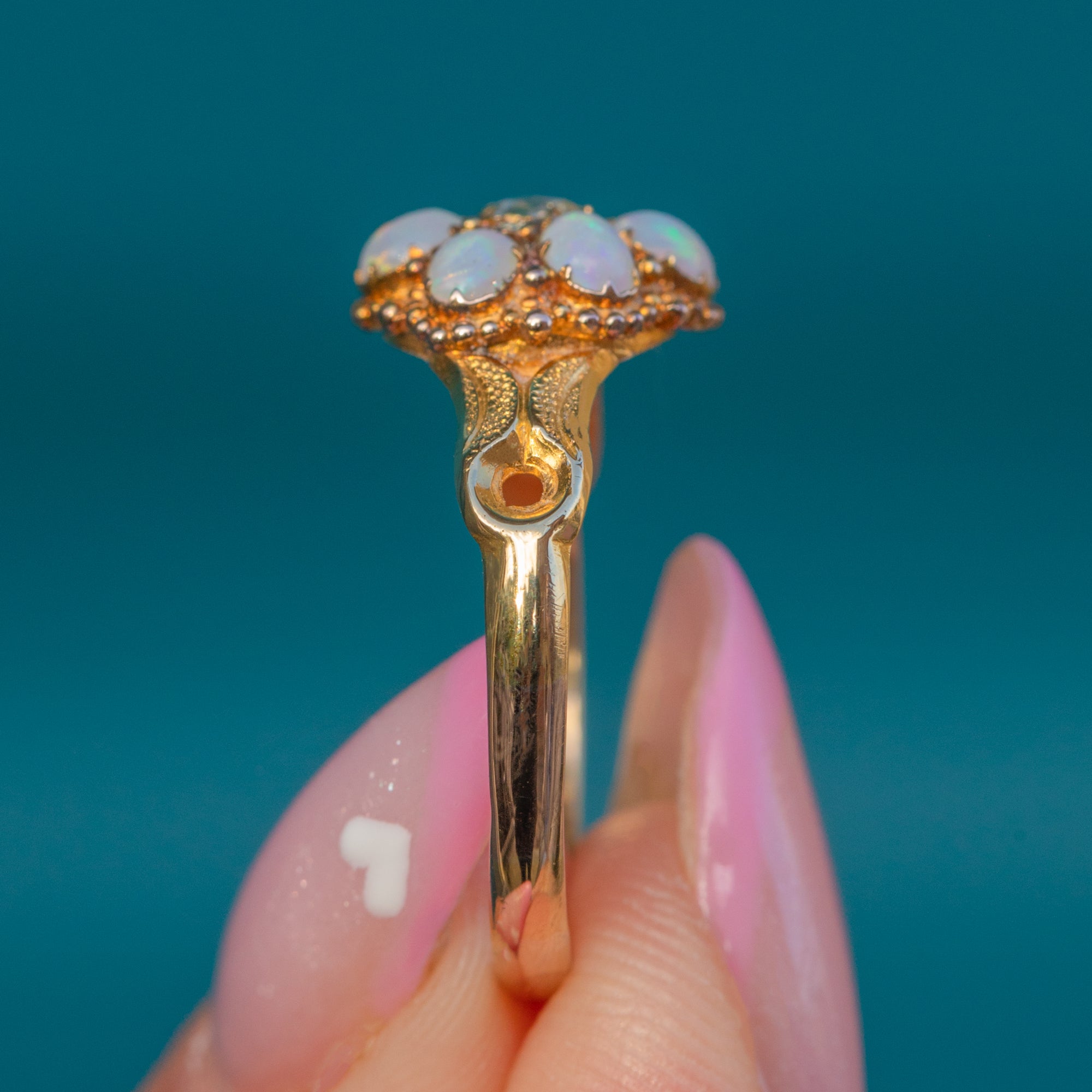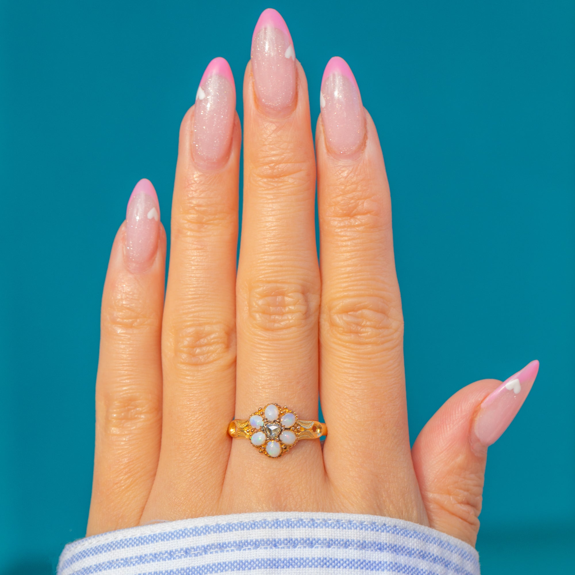 This beautiful Early Victorian flower ring is set with ethereal Opals and a glistening rose-cut Diamond at the centre. The combination of the shimmering Opals and the antique cut Diamond creates a gentle play of light, perfectly capturing the romantic spirit of the 19th century.