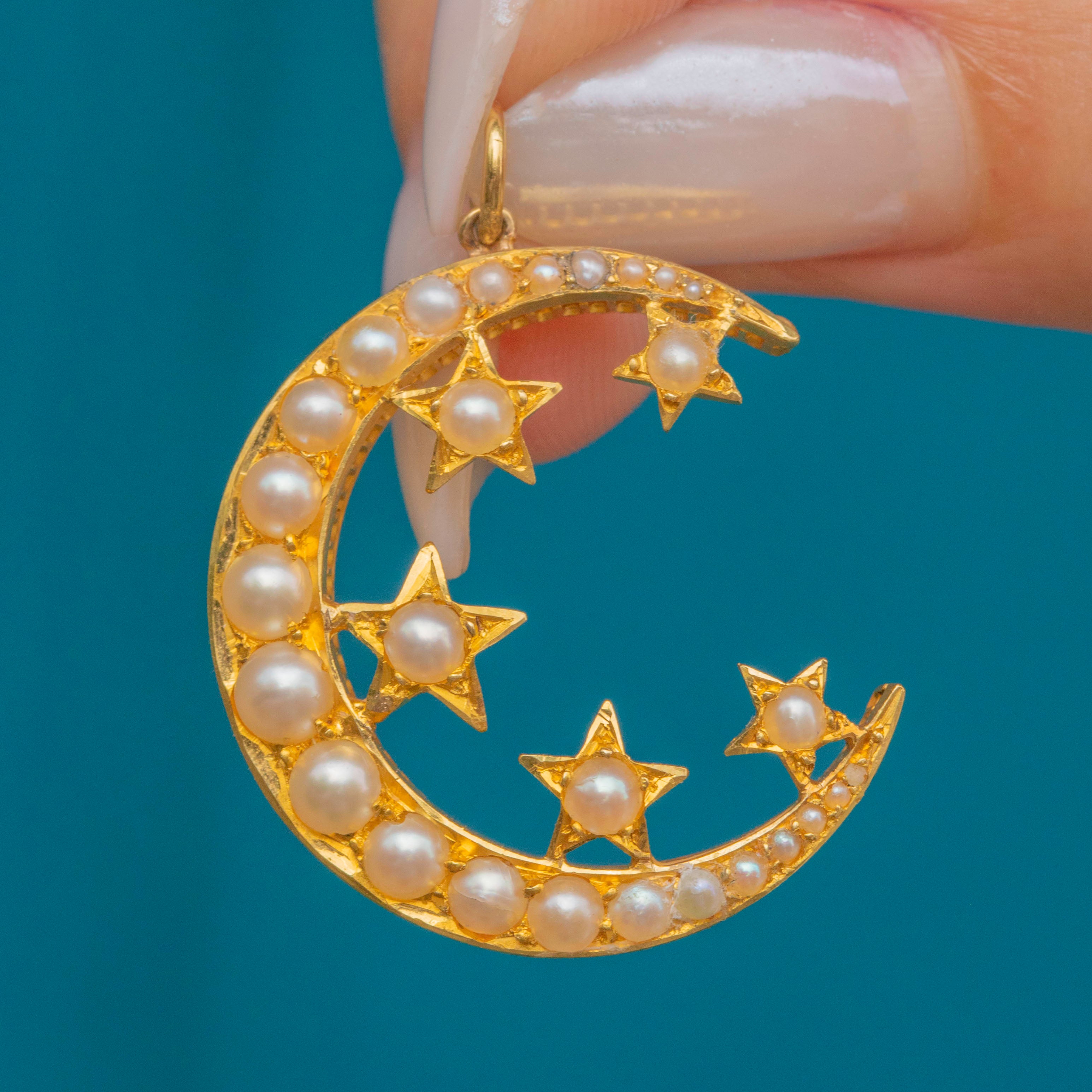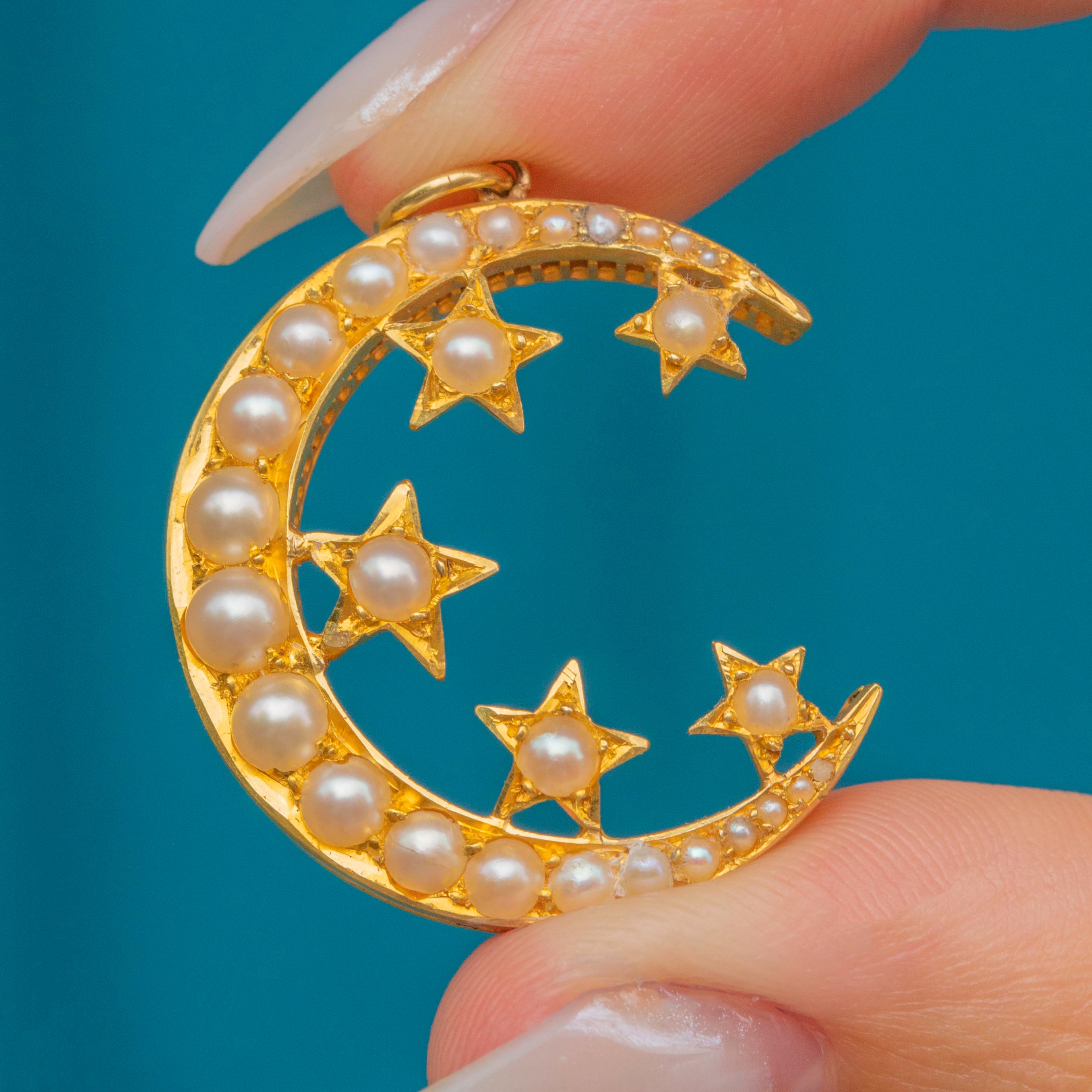 Victorian 18ct Gold Pearl Crescent Moon & Stars Pendant