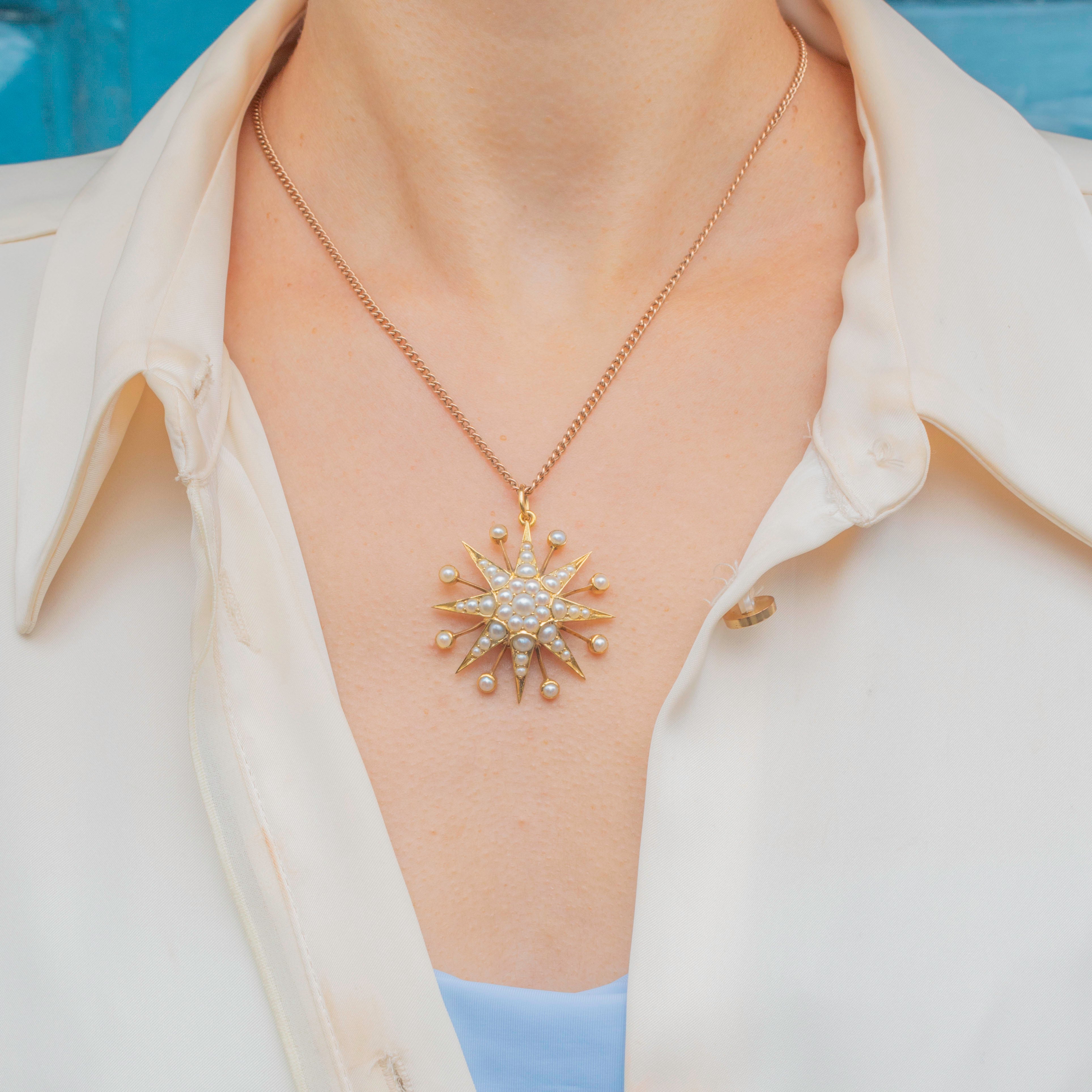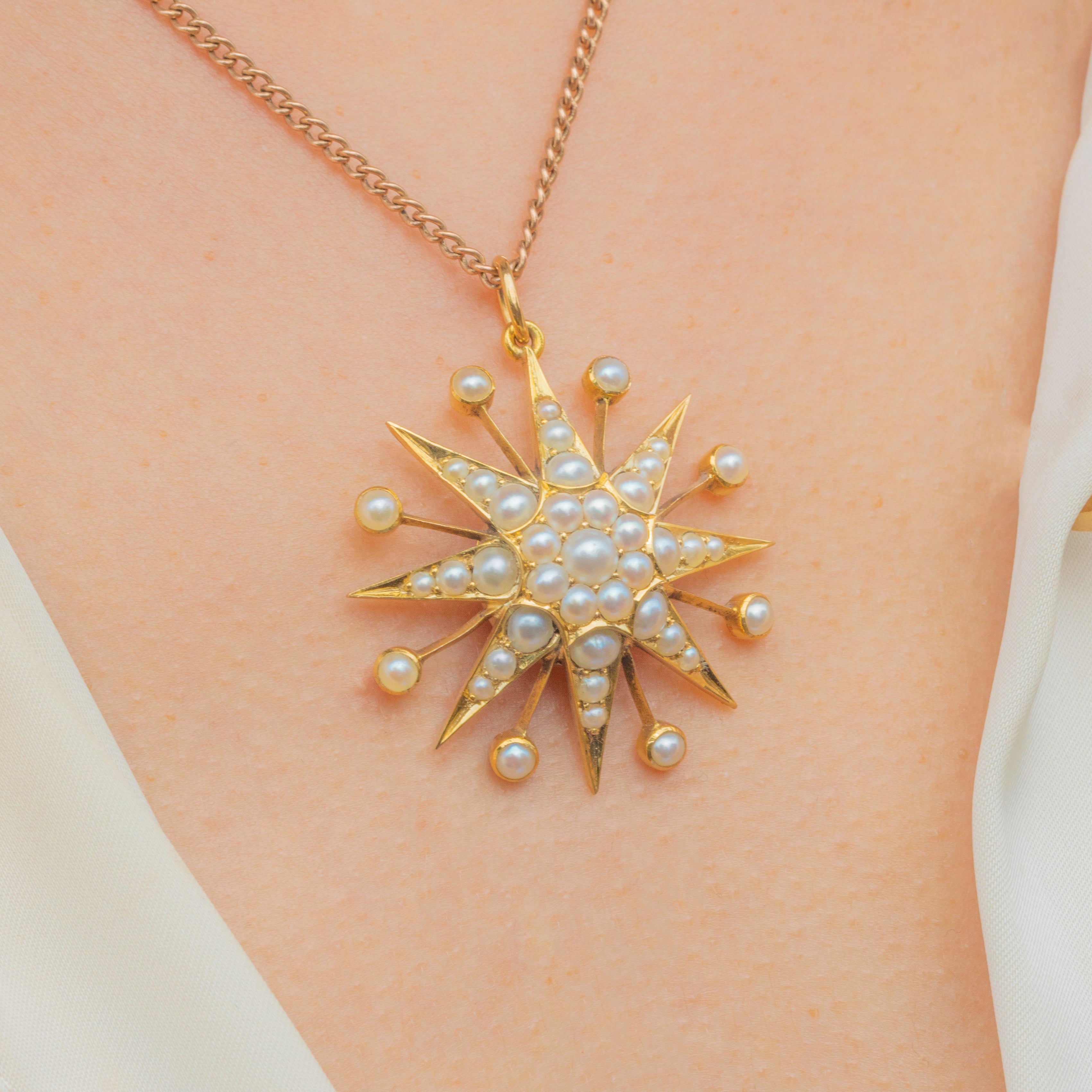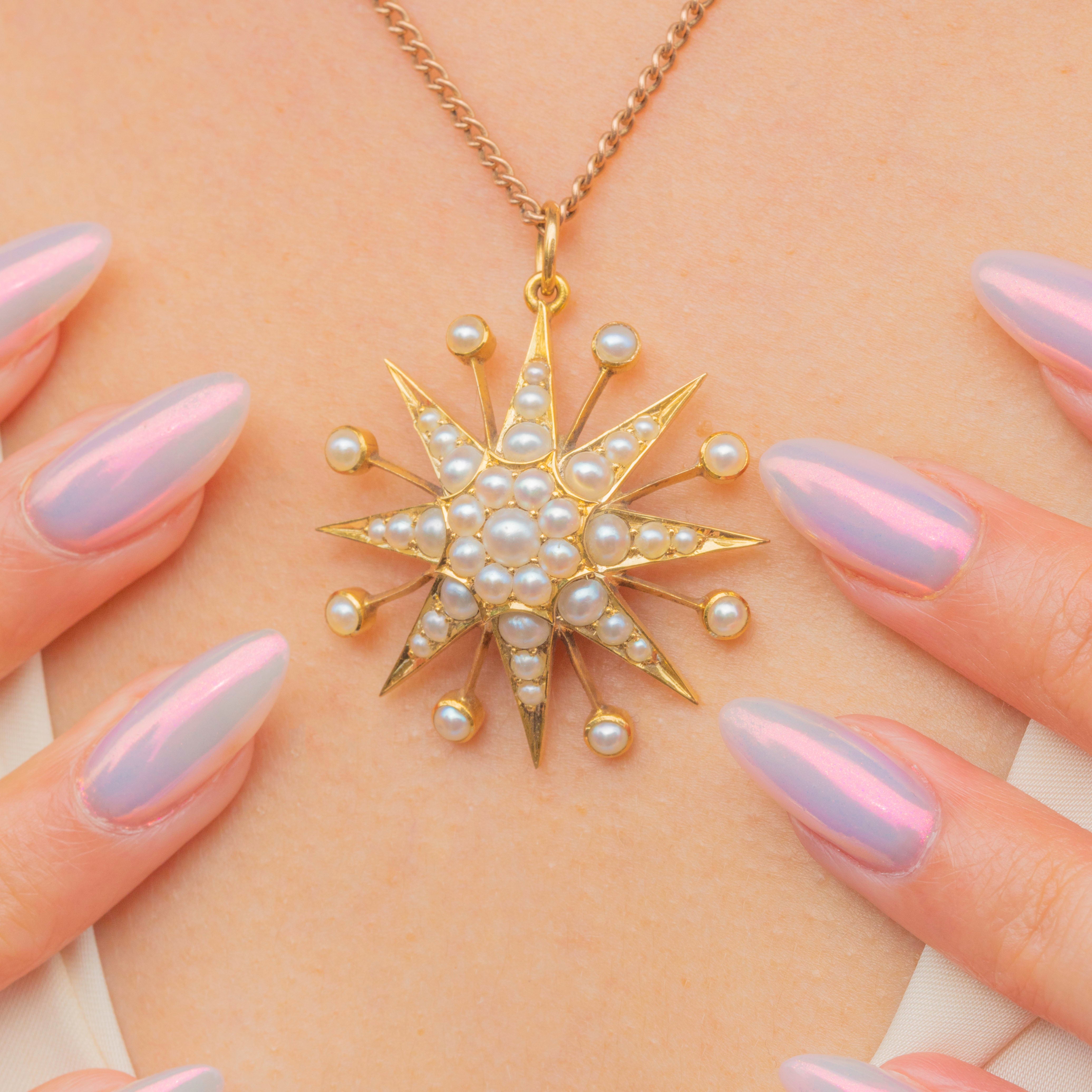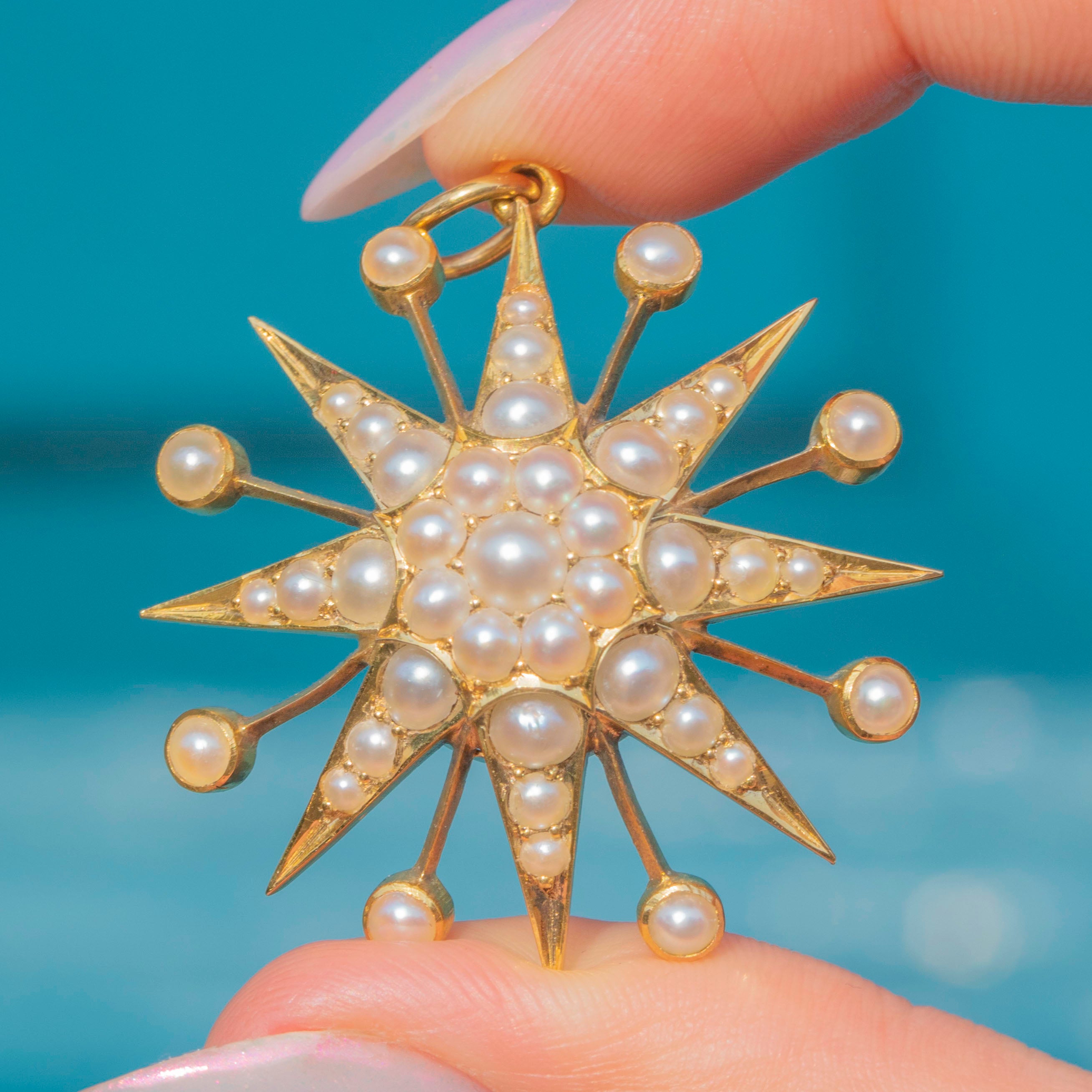This Victorian 18ct Gold Pearl starburst pendant is a glorious antique jewel. Composed of glossy, highly saturated 18ct Gold, this Victorian starburst lives up to its name, bursting with over forty champagne-hued Pearls!