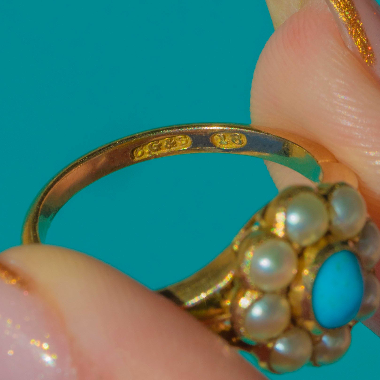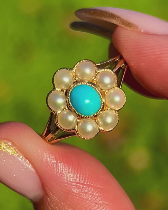 EXCELLENT: The Turquoise and Pearls are all present, with beautiful colour and lustre and securely set. The 18ct Gold band and setting are smooth with only light surface wear commensurate with age. The ring has been well cared for and is ready to wear and enjoy.