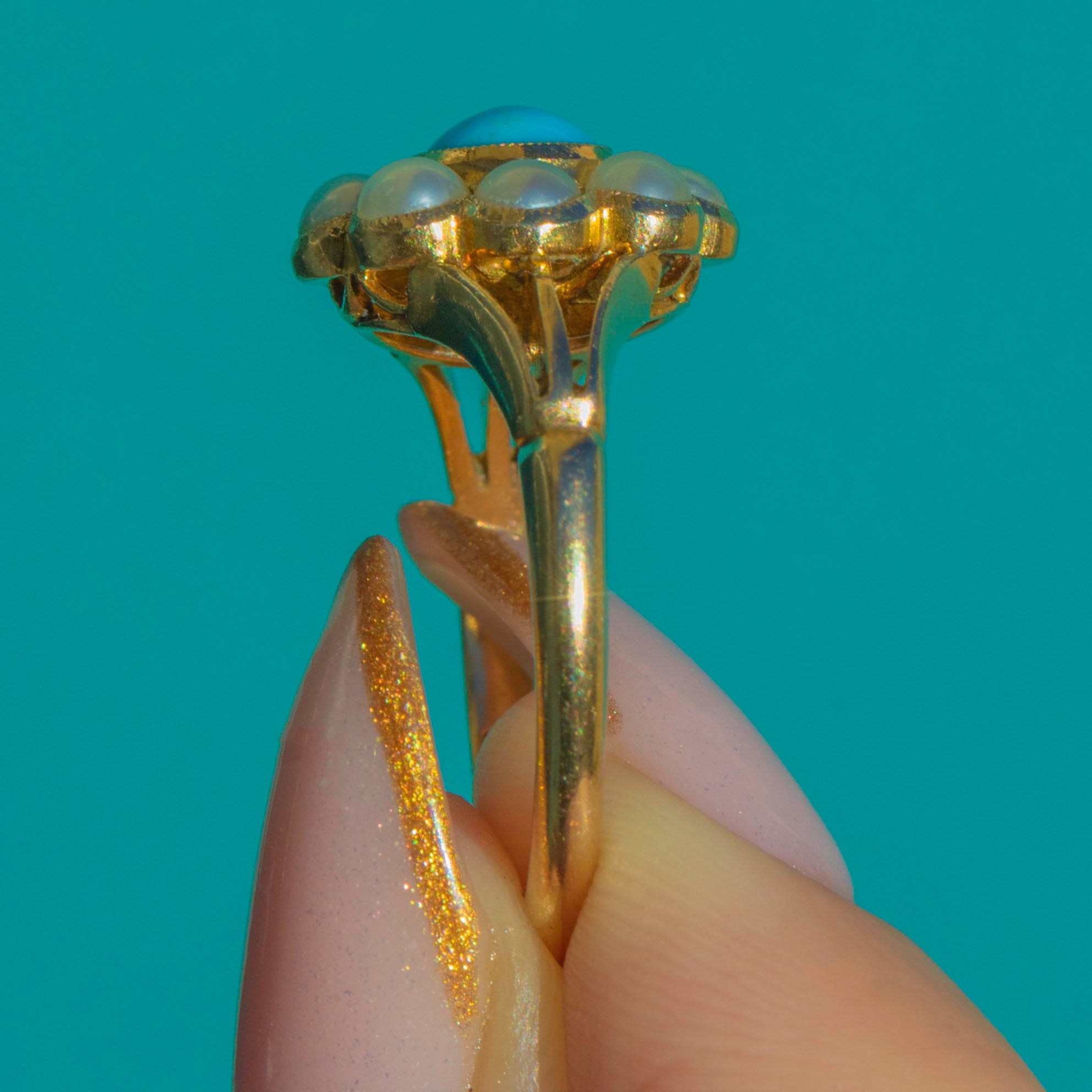 This romantic Victorian cluster ring is all about that joyful pop of colour. A bright oval Turquoise sits at the centre, its saturated blue hue glowing against rich 18ct Gold. Around it, a halo of creamy Pearls forms a charming daisy motif, framed with fine milgrain for a delicate, lacy edge.