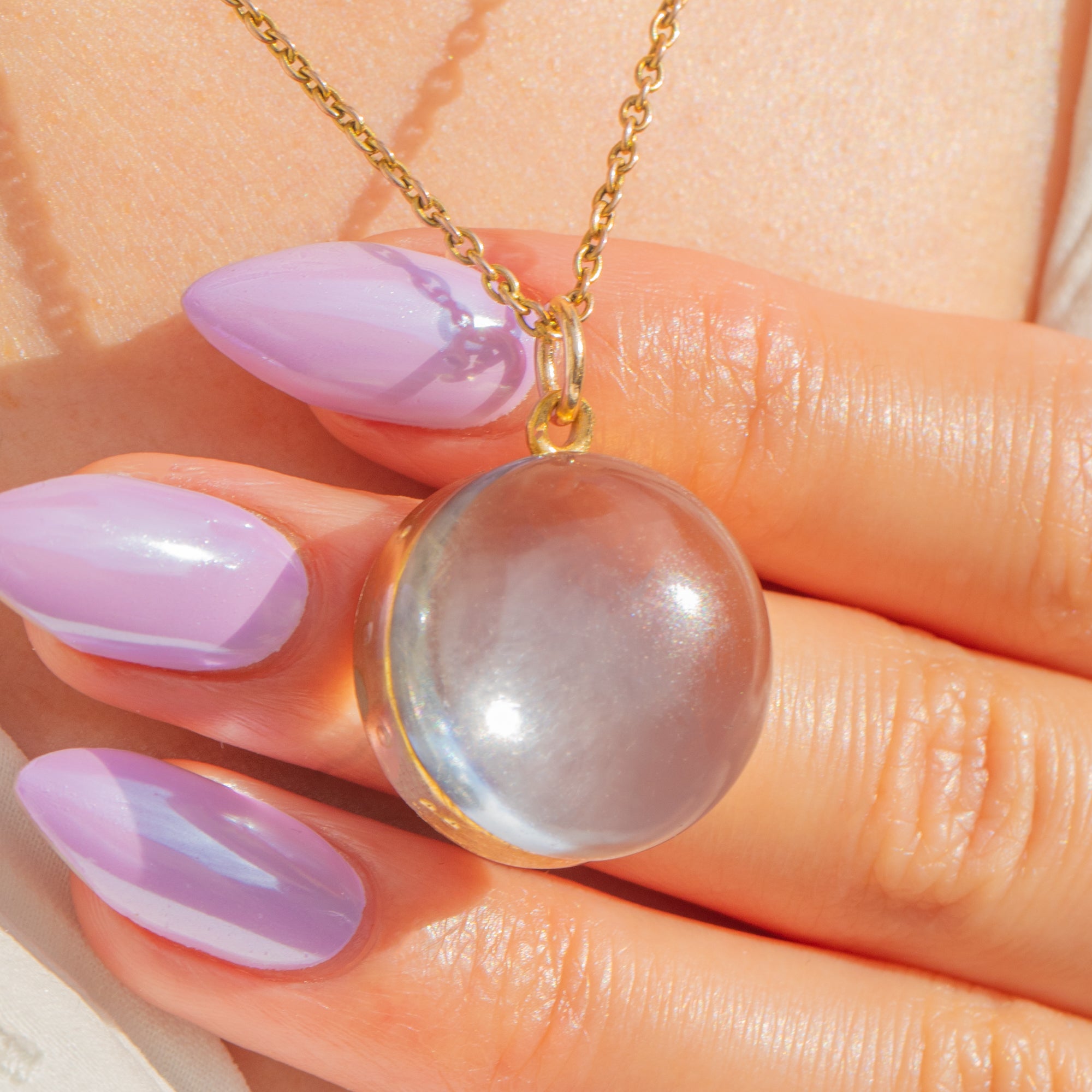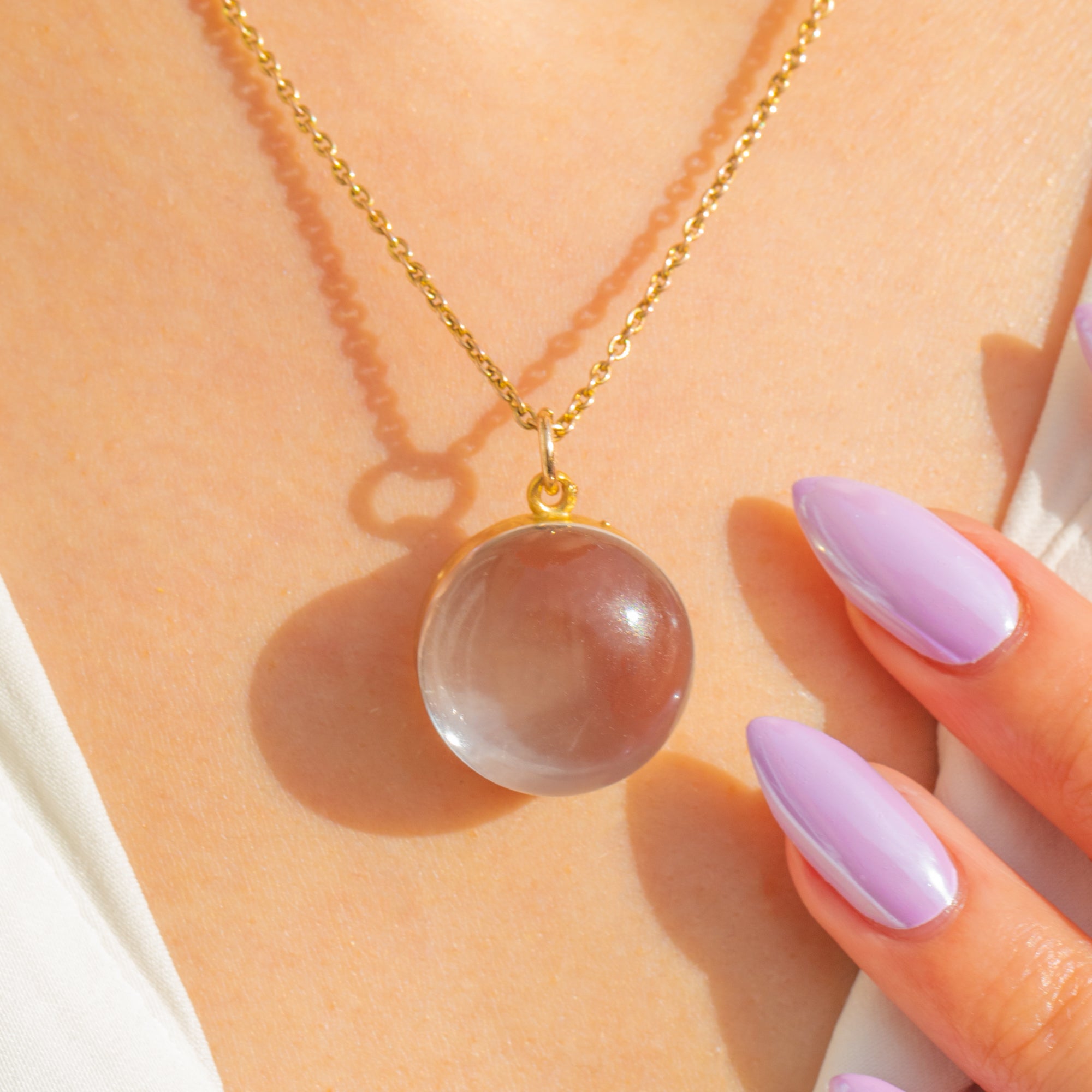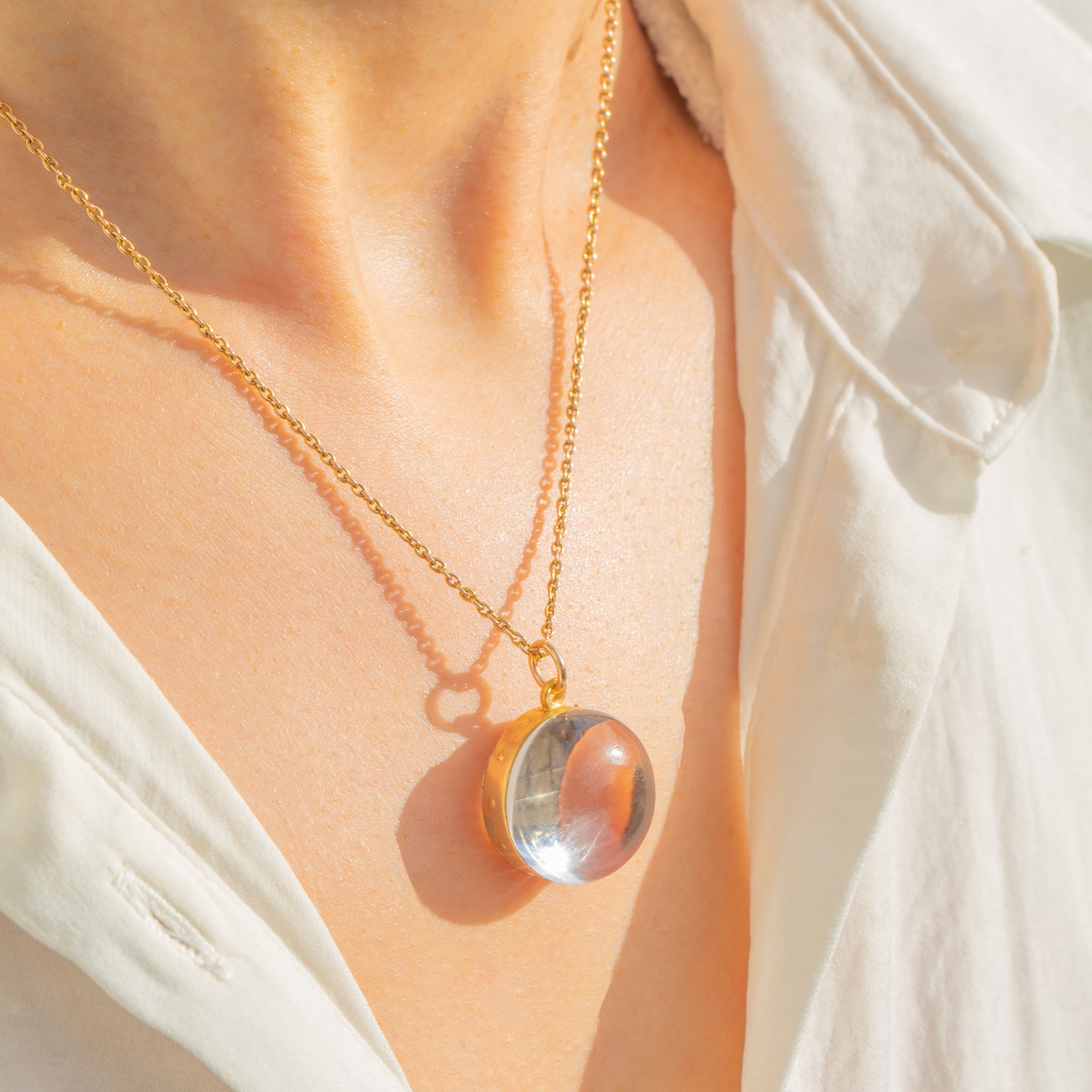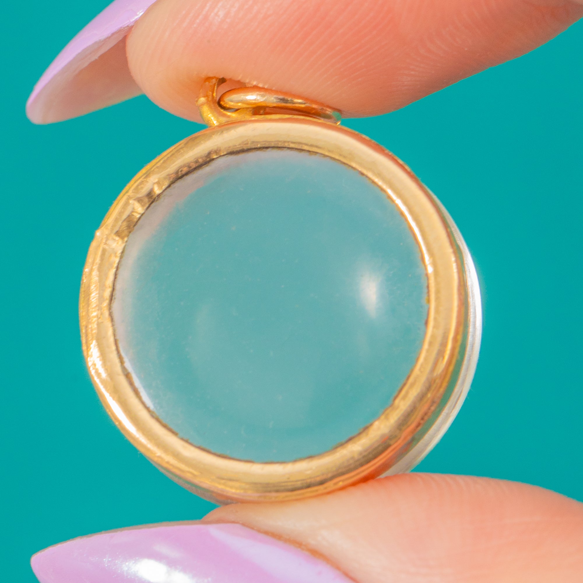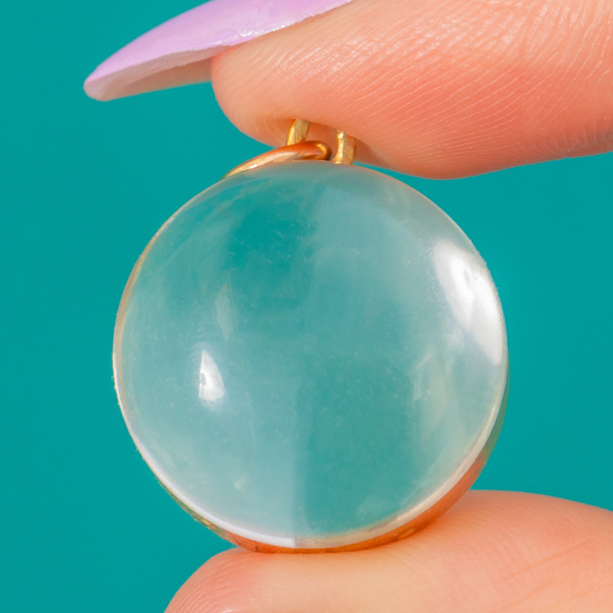 A luminous Victorian “pool of light” porthole locket, crafted in 18ct Gold and set with a domed Rock Crystal that seems to gather and glow with the light. The smooth high dome is beautifully framed by a refined Gold bezel, creating that ethereal, magnifying effect collectors adore.