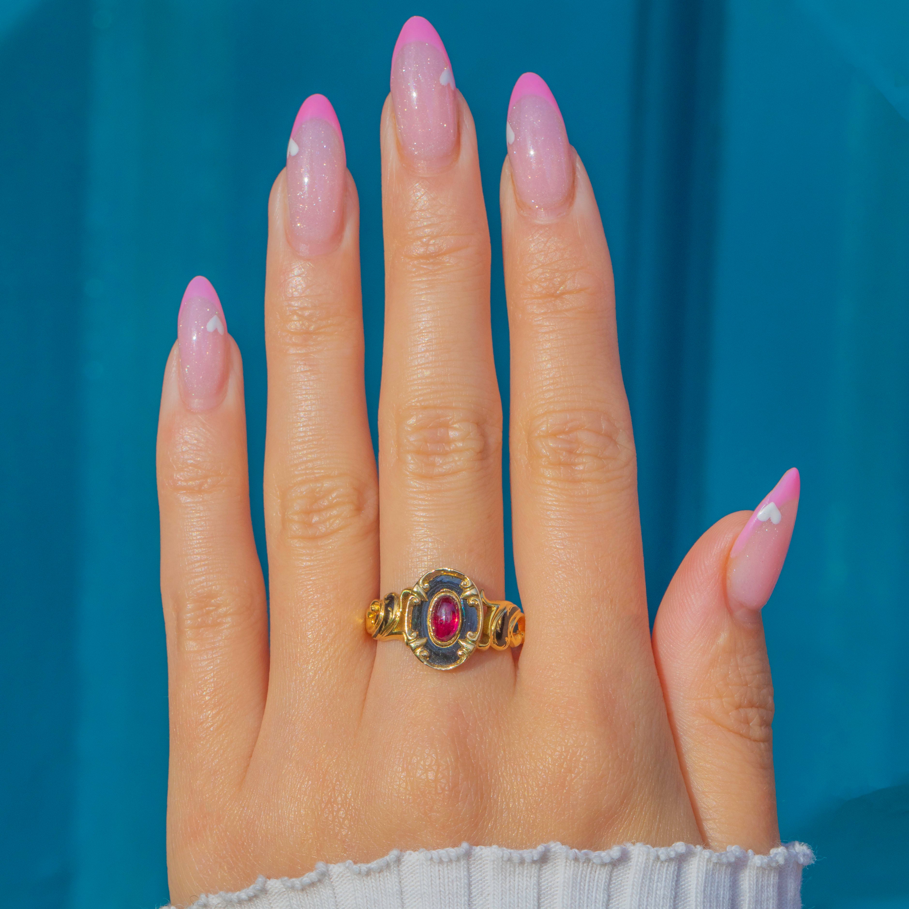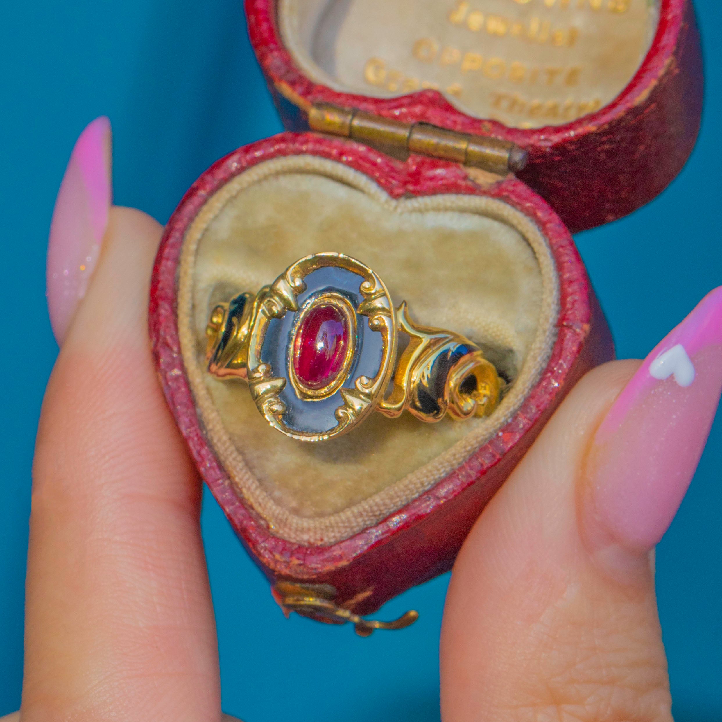A striking Victorian mourning ring crafted in 18ct Gold, featuring a glowing Ruby cabochon framed by rich black Enamel. The bold contrast between the deep glossy black Enamel and the vibrant Ruby perfectly captures the sentiment and style of mid-19th-century mourning jewellery.