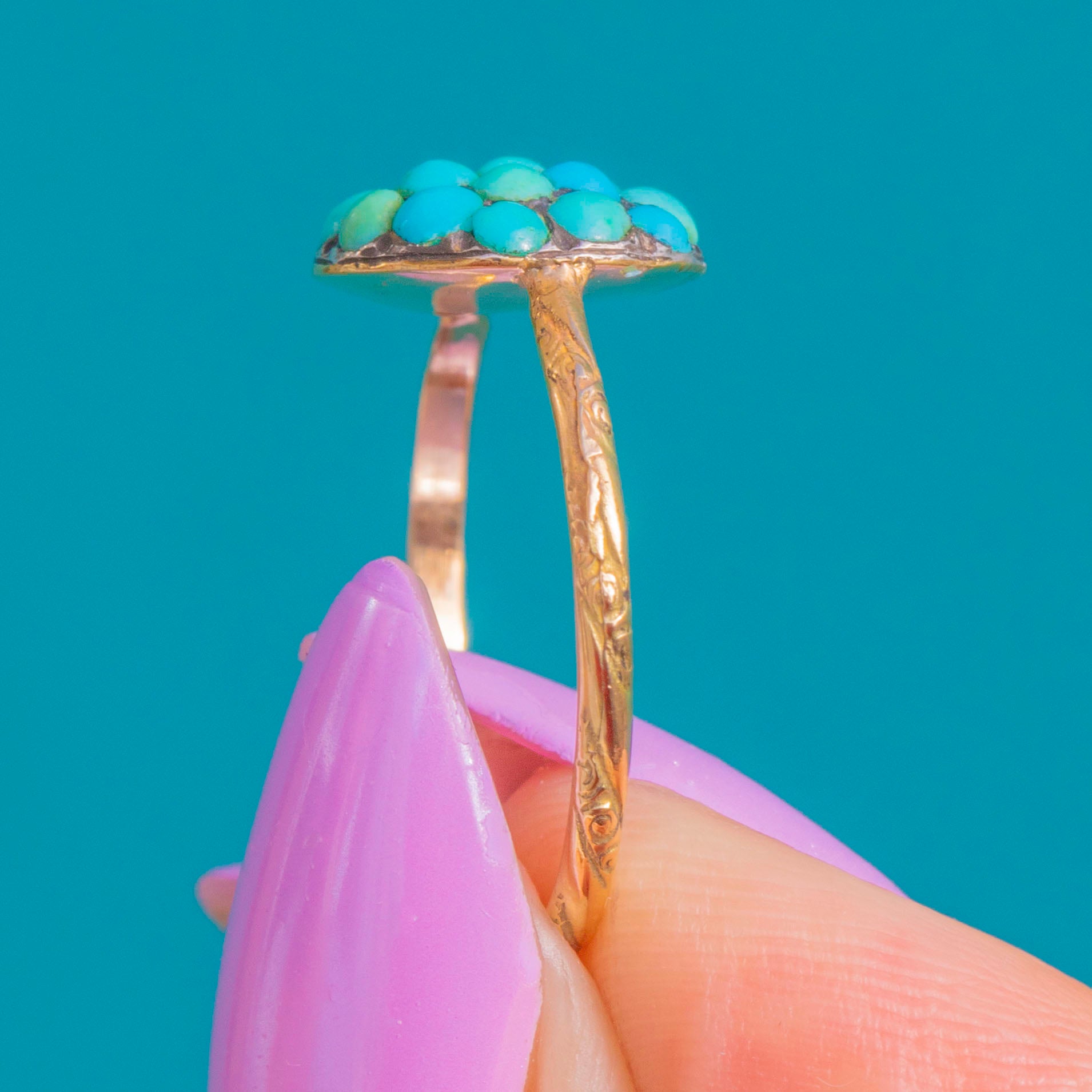 A dainty delight from the Victorian era, this 18ct Gold bombe ring blooms with a circular rosette of Turquoise cabochons. The gently domed cluster creates a pretty pop of blue-green, each cabochon nestled in neat settings for a timeless floral look.