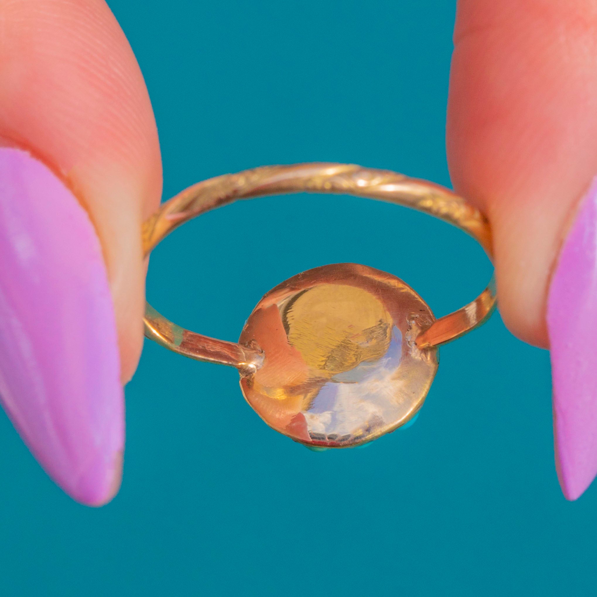 Finely engraved shoulders add a whisper of ornament to the slender shank, while the rich glow of 18ct Gold lends warmth and elegance. Poised, pretty and eminently wearable, it’s a sweet touch of antique colour for every day or a delicate stacking moment.