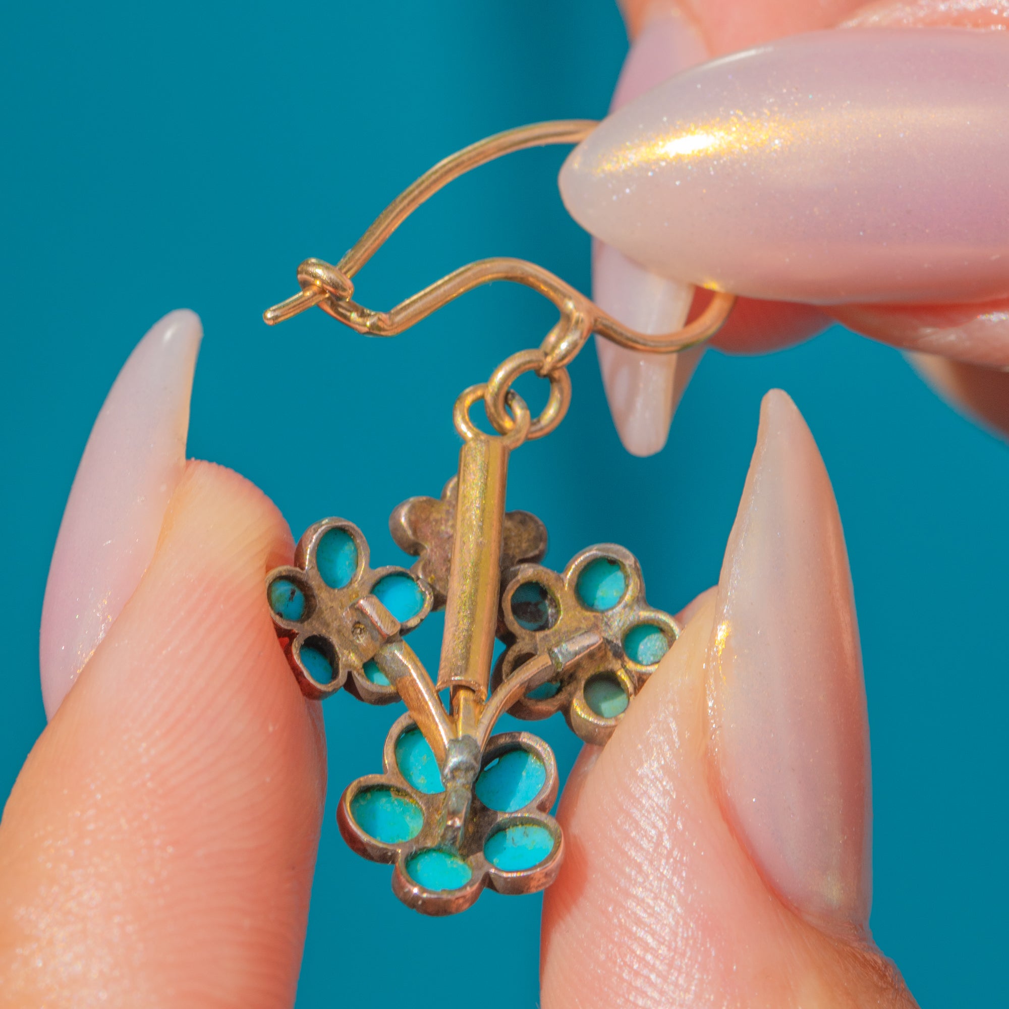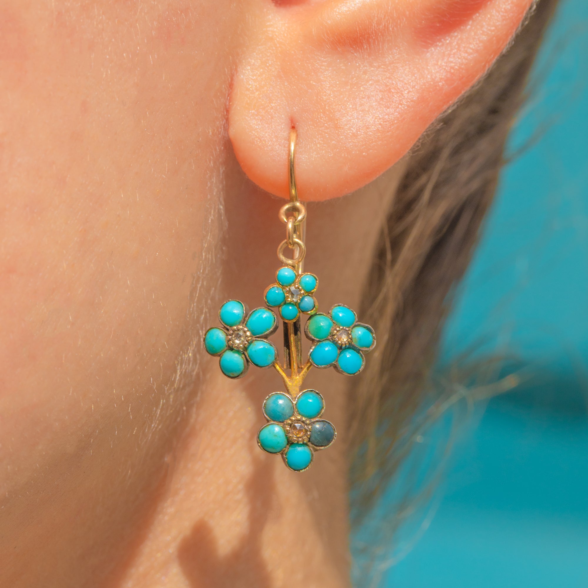 Victorian 18ct Gold Turquoise & Diamond Forget-Me-Not Earrings c.1880