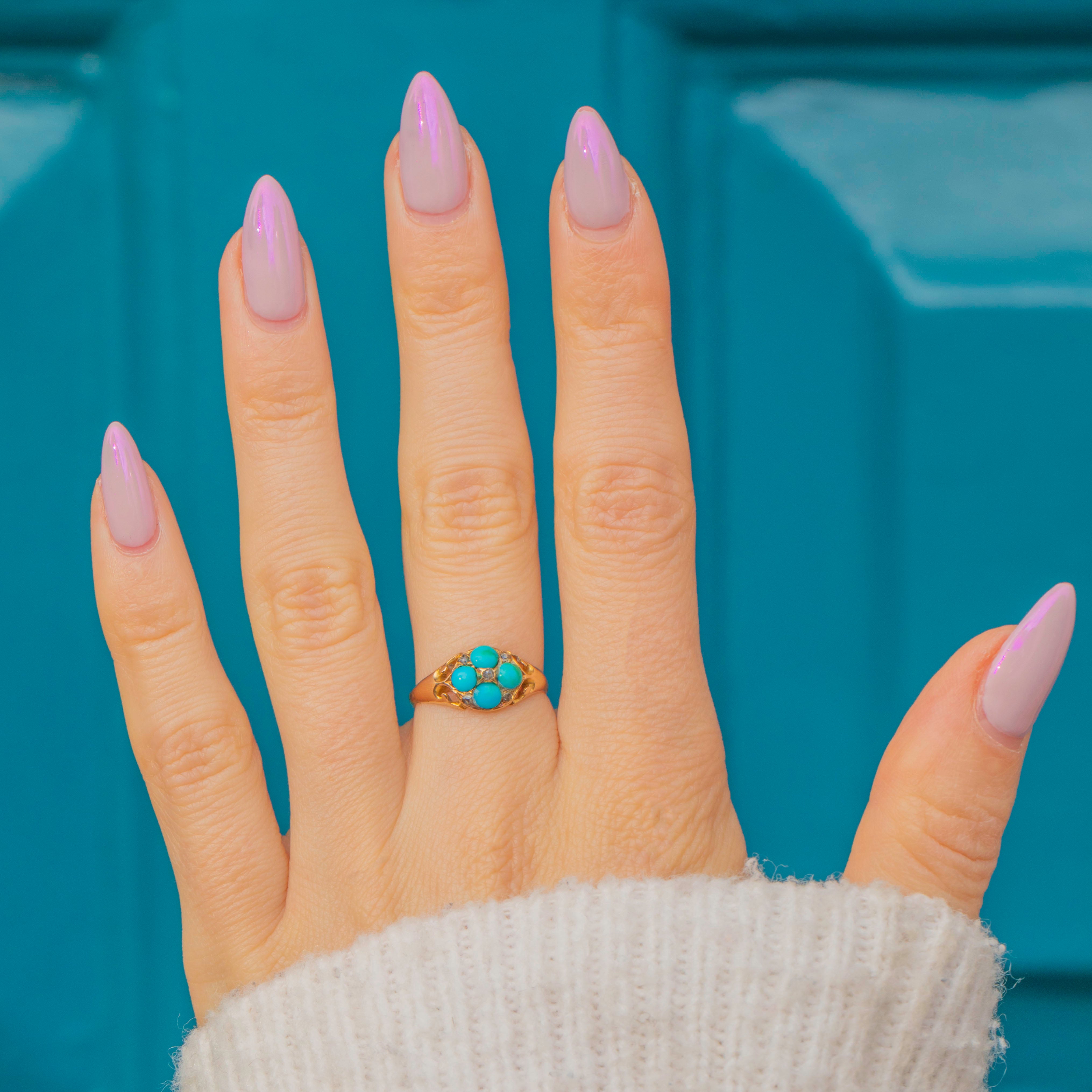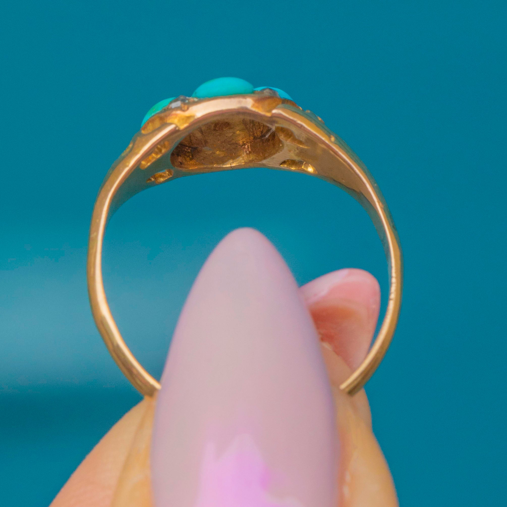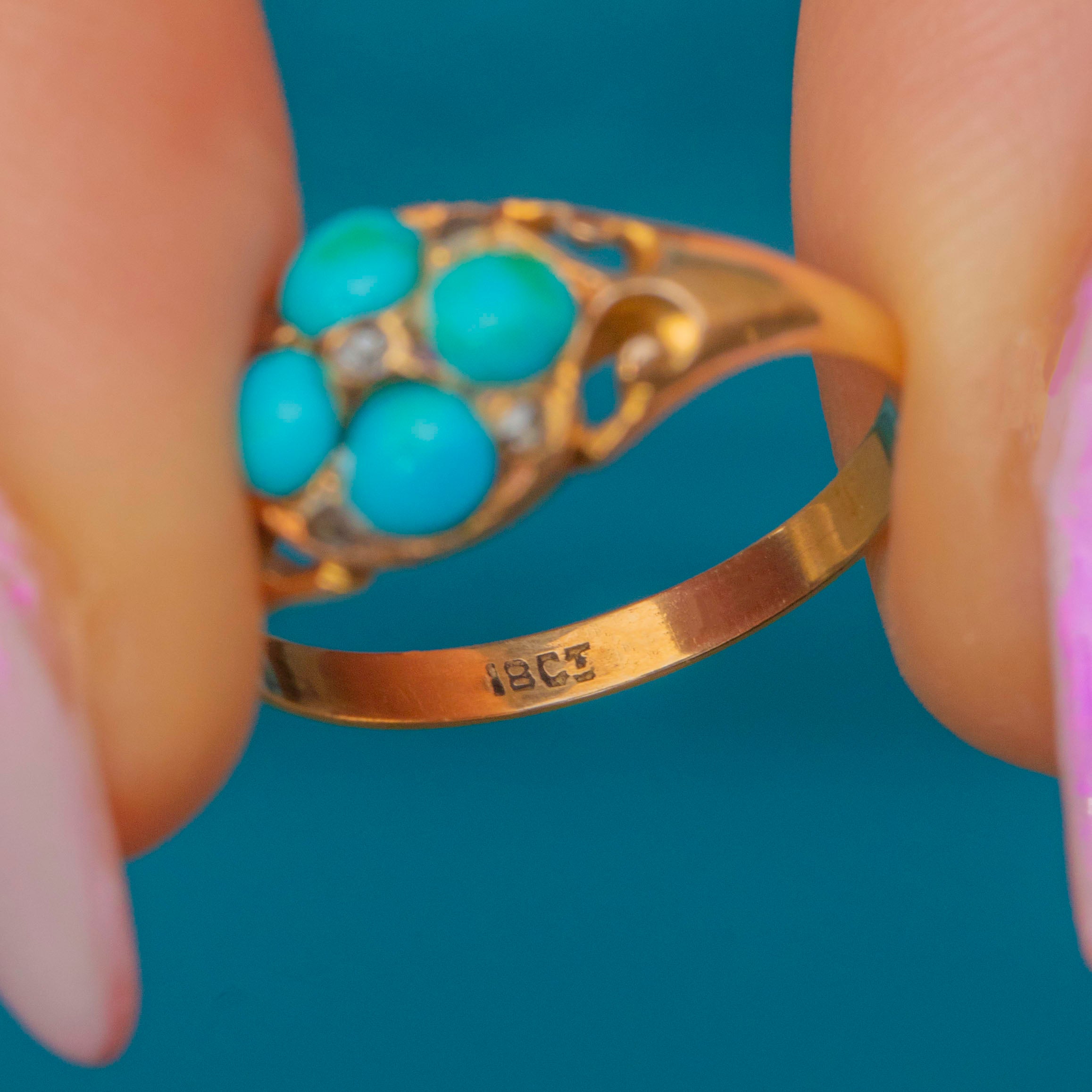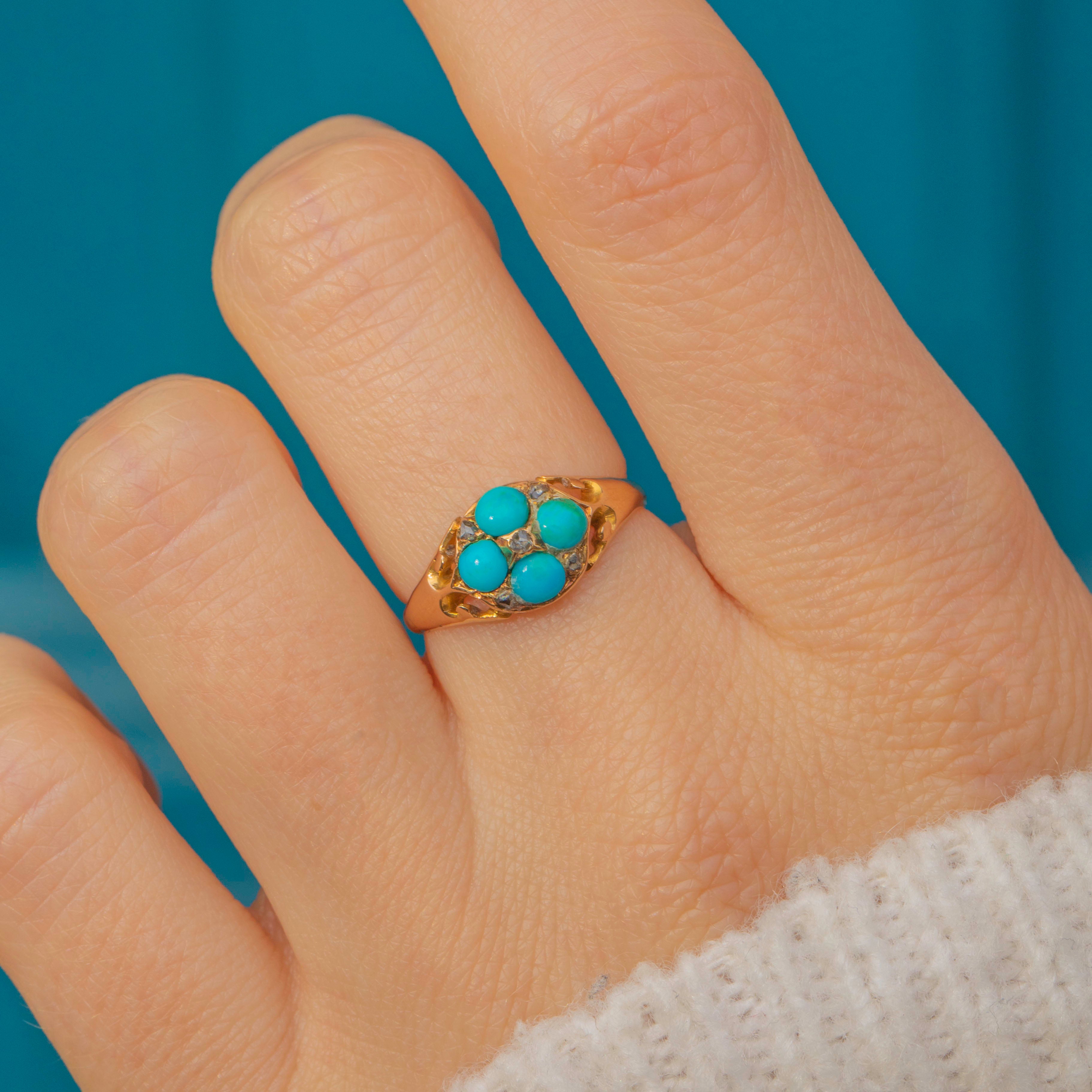 This gorgeous Victorian ring is crafted in glowing 18ct Gold and set with a vibrant quartet of Turquoise cabochons framed by sparkling antique Rose-cut Diamonds. The combination of vivid duck-egg blue Turquoise and warm Gold creates a look that’s both romantic and timeless — a perfect example of late 19th-century elegance.