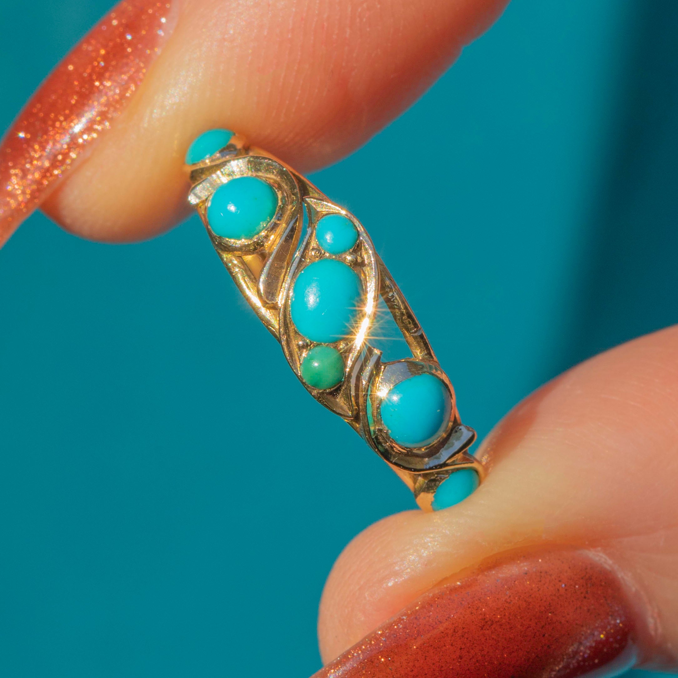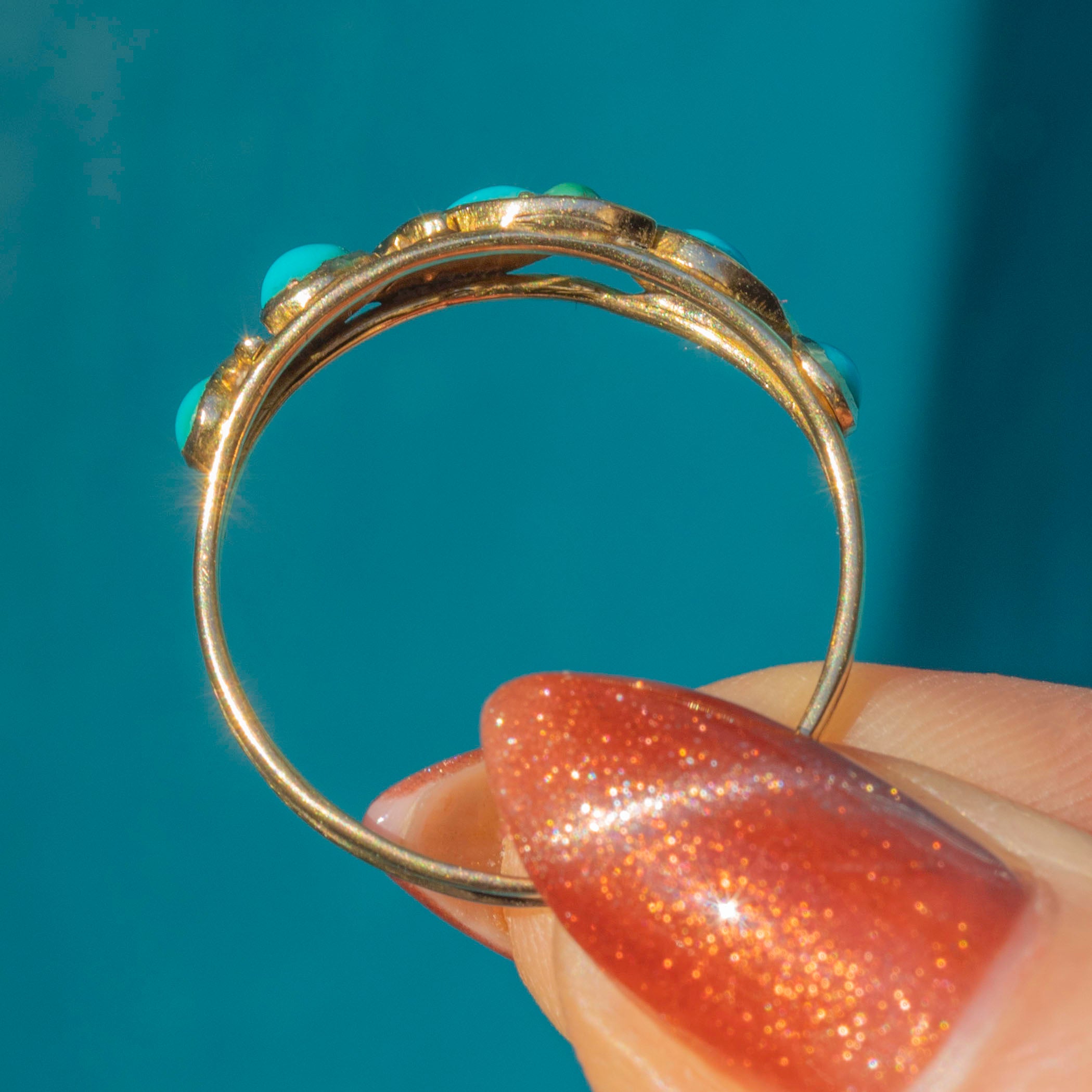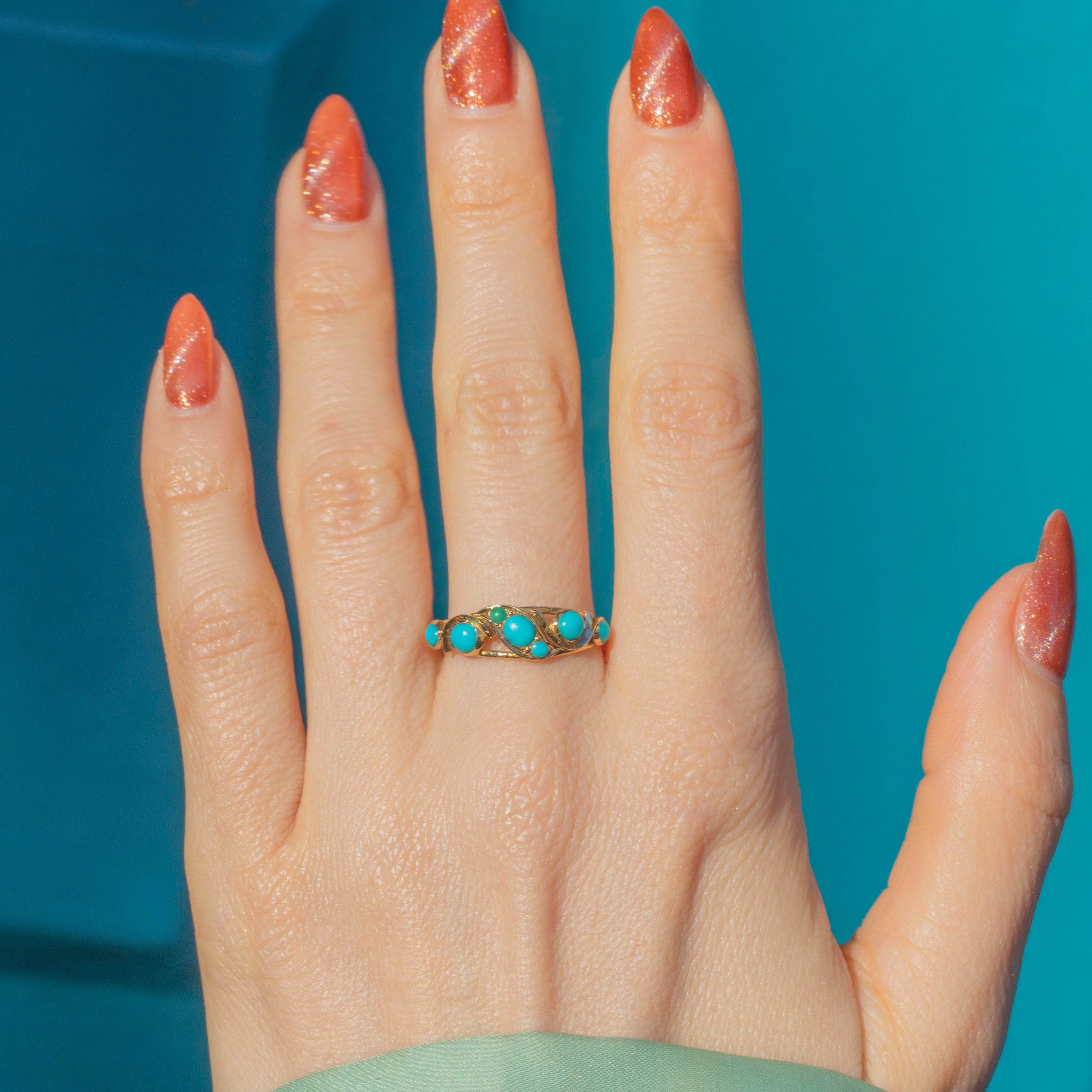 This Georgian 18ct Gold Turquoise ring is a fabulous antique find. Embellished with a gorgeous splattering of vibrant Turquoise stones, this Gold ring is the splash of colour your ring stack is calling out for!