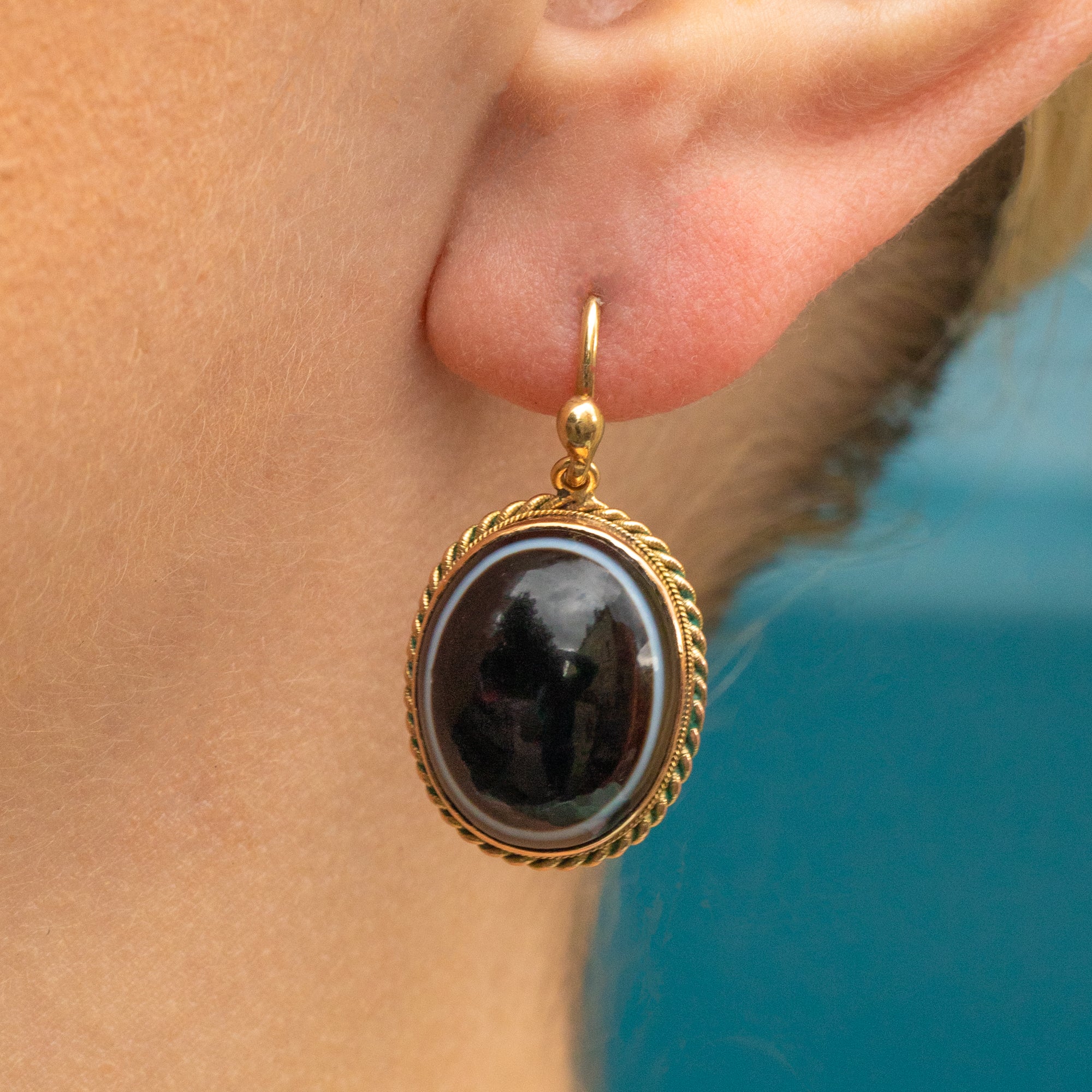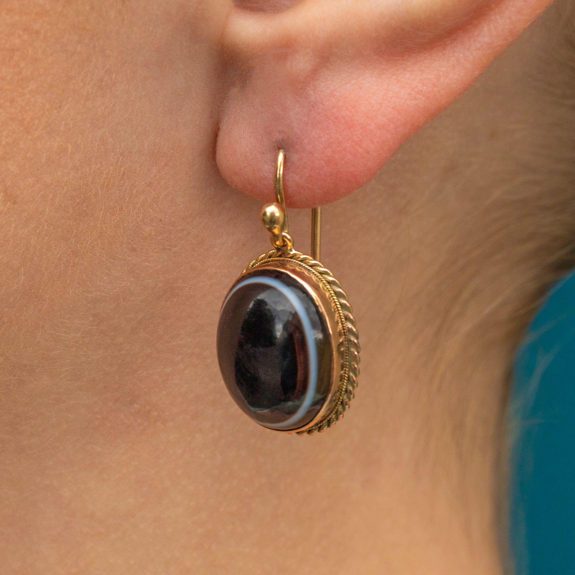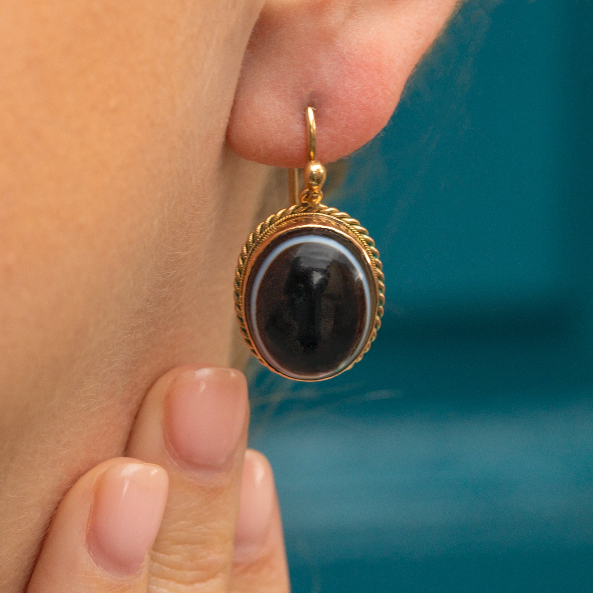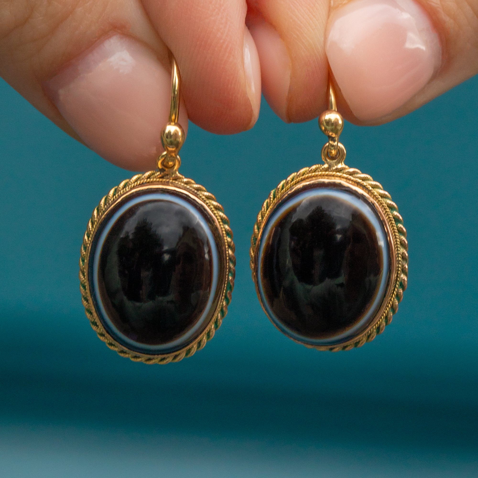 VERY GOOD. These striking Victorian 9ct Gold banded Agate earrings are in great condition! The Agate stones are set securely and are smooth to the touch with no cracks or chips. There is very minor surface wear on the smooth Gold backs, but this is to be expected given their grand age! With 9ct Gold hooks enjoy how these Victorian earrings sway softly as you move.
