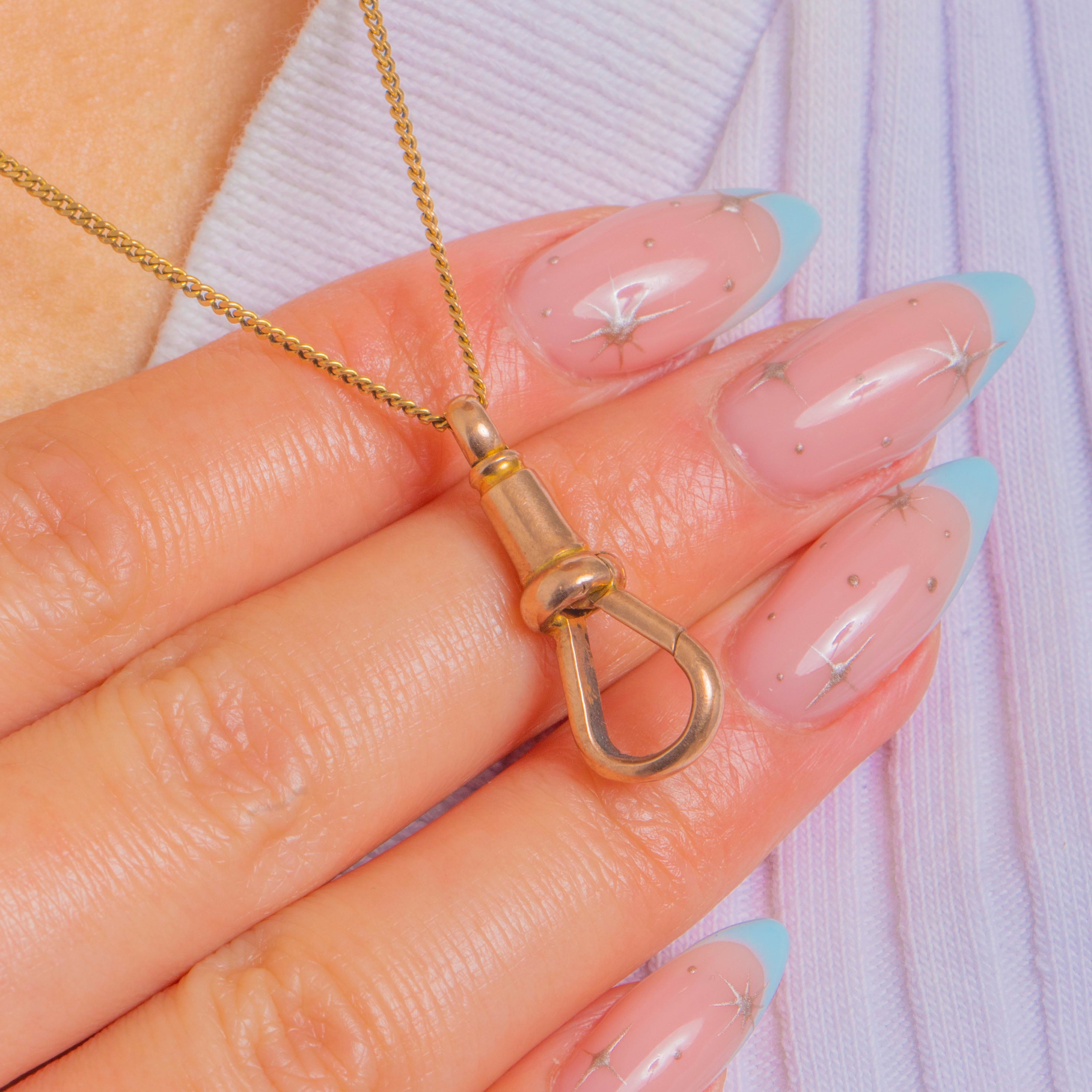 A quintessential Victorian 9ct Gold dog-clip clasp with that timeless blend of elegance and utility. Beautifully engineered, it features a lathe-turned, tapered barrel with a collar, a classic teardrop clip with a spring gate for effortless styling. The warm glow of 9ct Gold and smooth, polished surfaces make it a chic standalone pendant or the perfect charm holder.