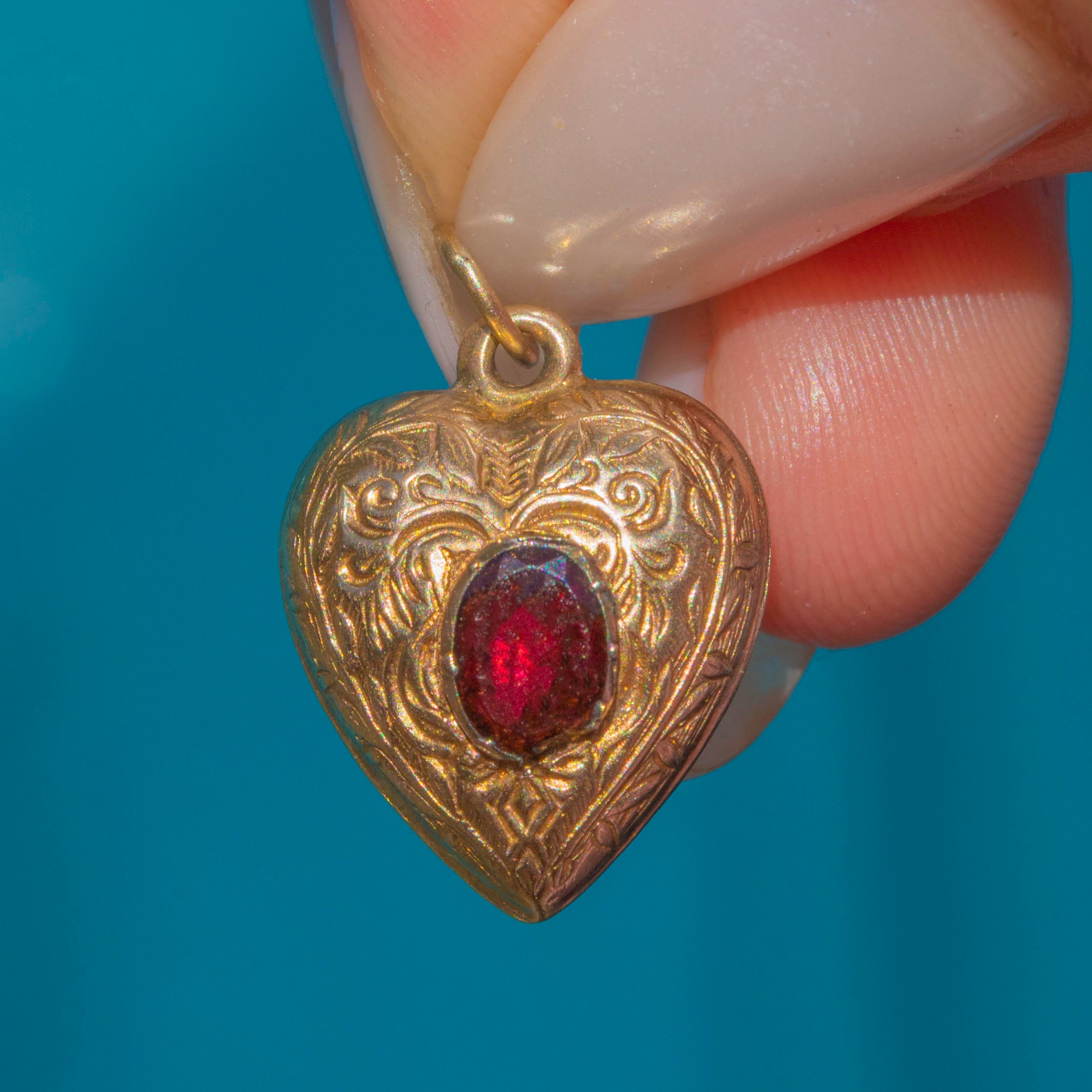 VERY GOOD. The heart has kept its shape well and the engraved details have remained defined. The Garnet has only a small nibble to the edge near the bottom, where some of the setting has worn down, but the gem remains secure. Complete with a soldered jump ring, you can wear this Victorian heart charm with confidence!
