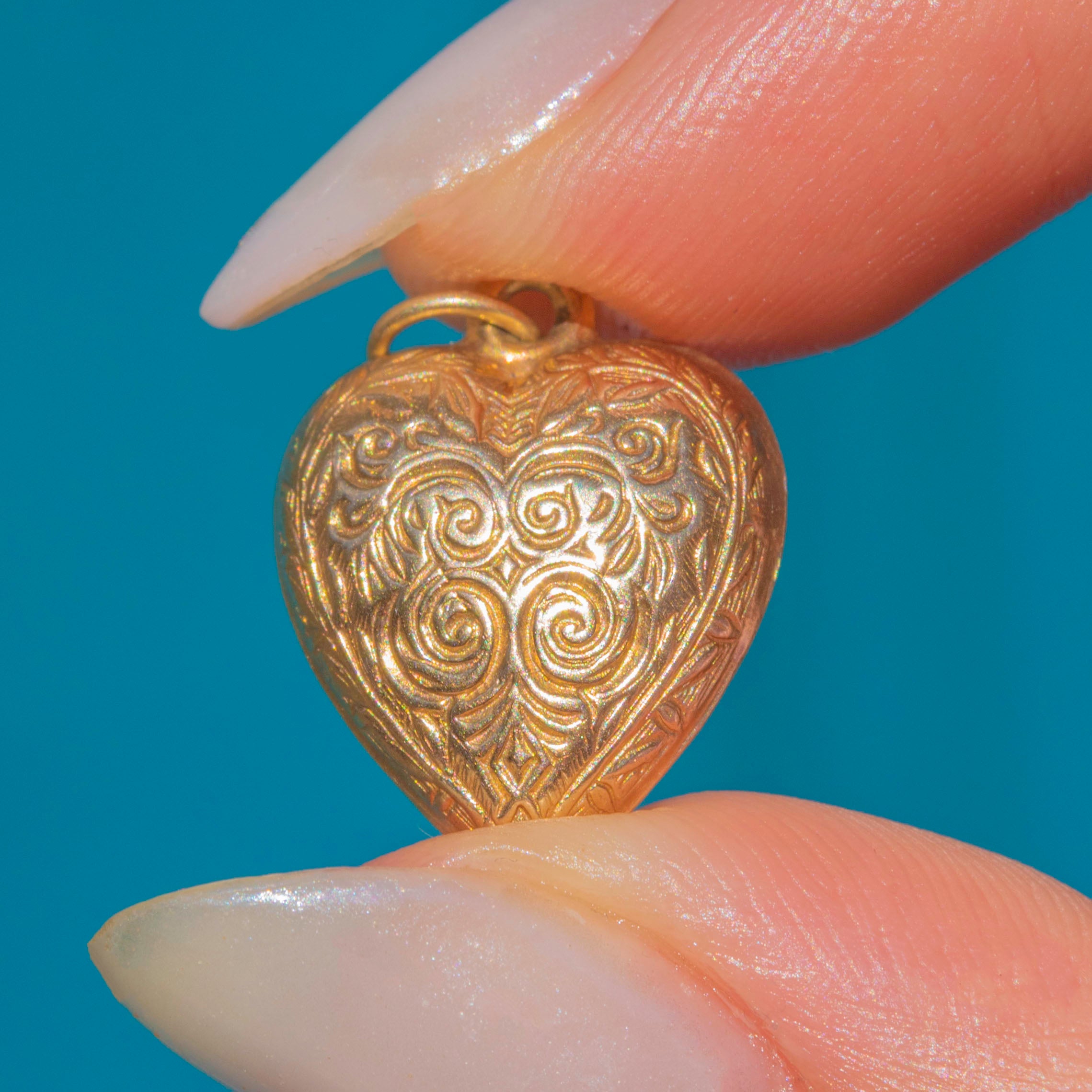 The heart has been engraved with swirls and foliate details, making this antique Gold heart pendant a romantic choice!
