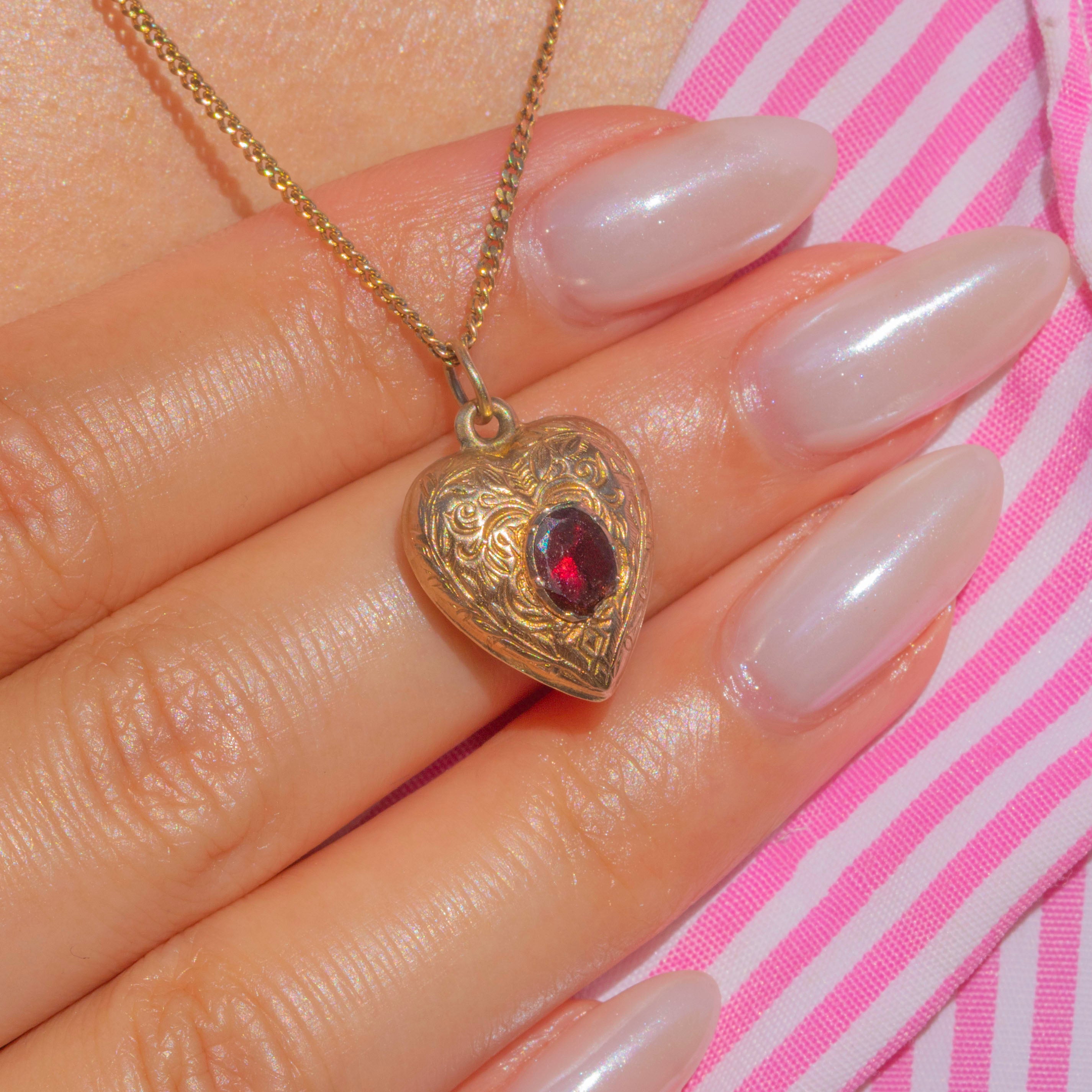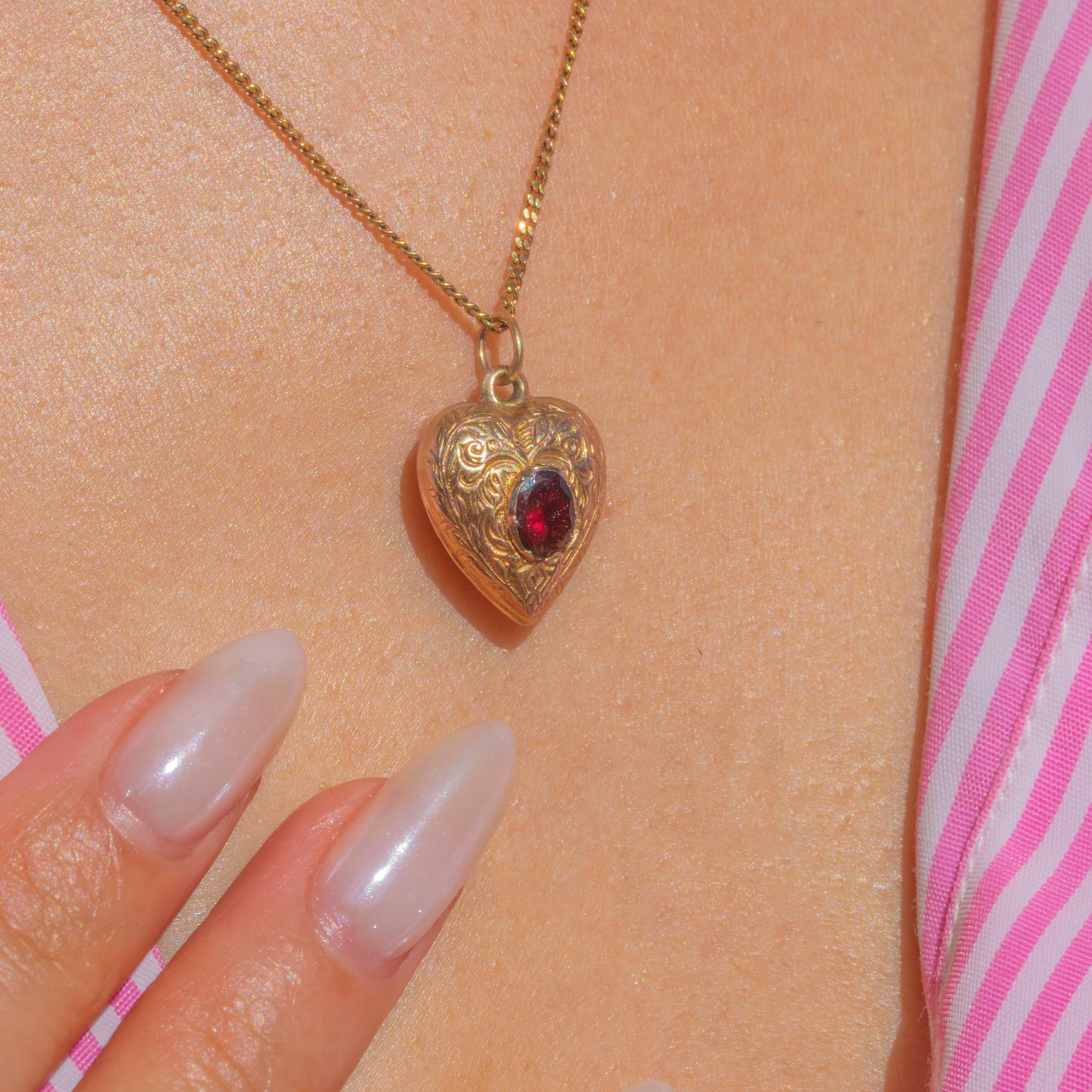The sweetest love token, this Victorian puffy heart is set with a seductive flat-cut Garnet at its centre.