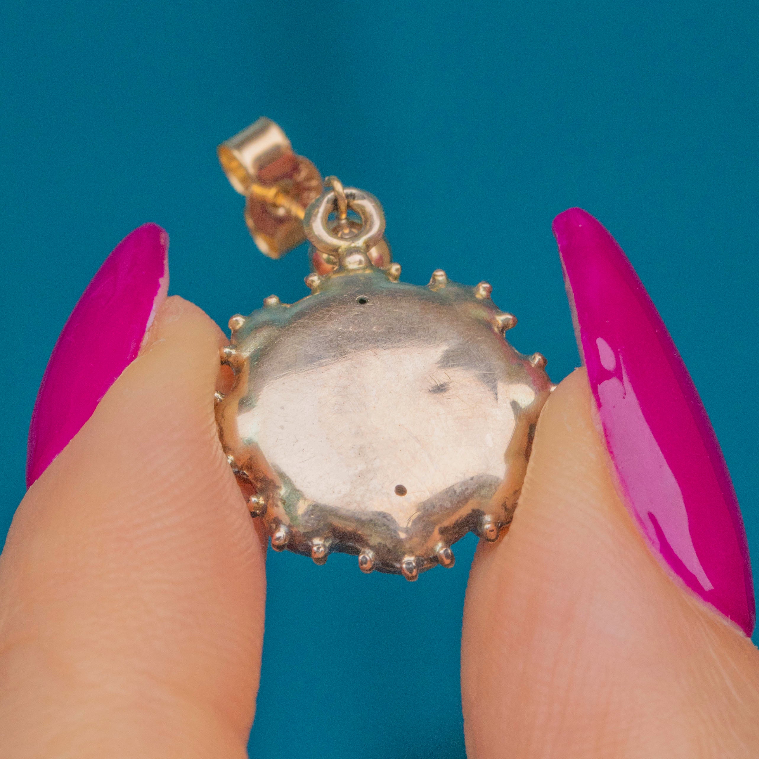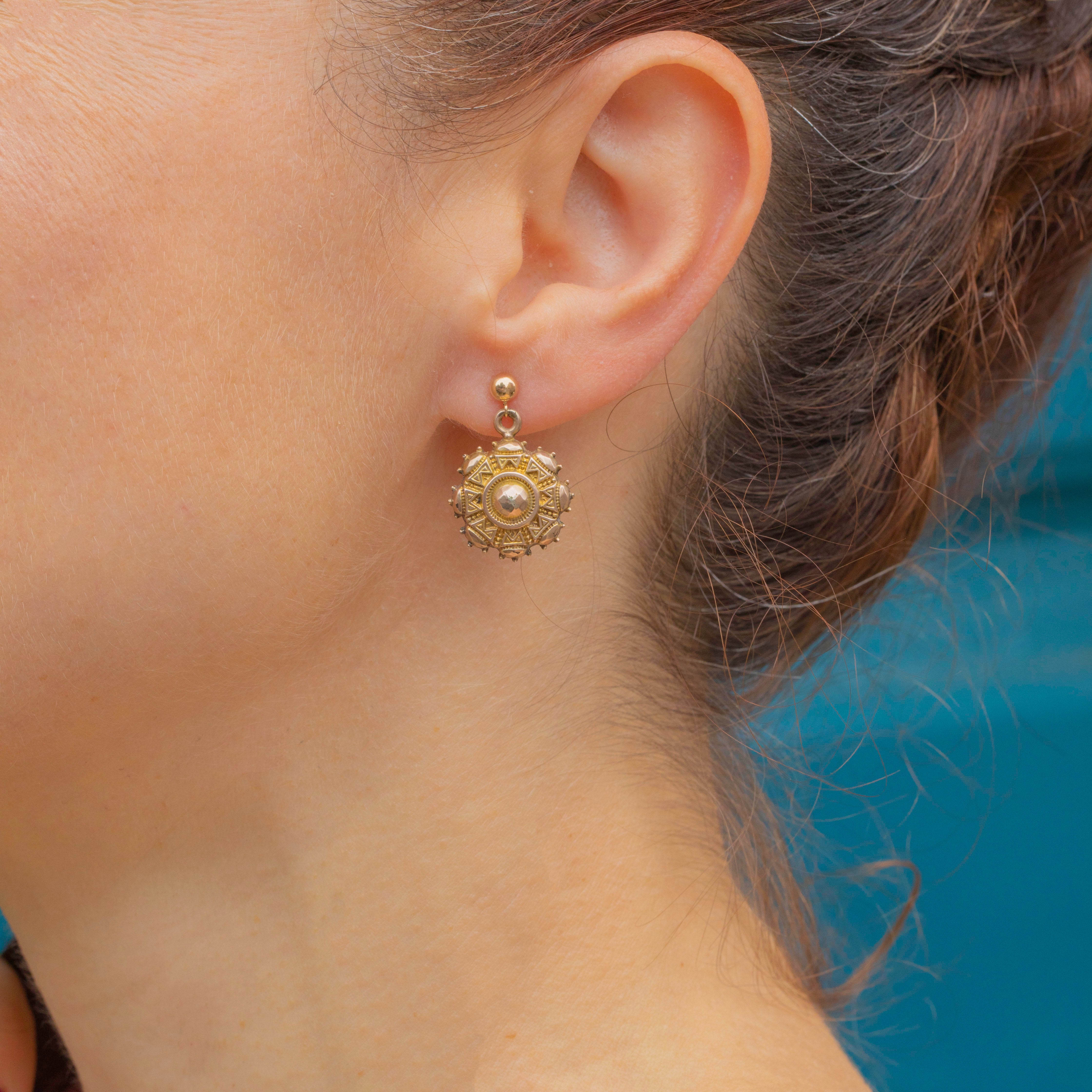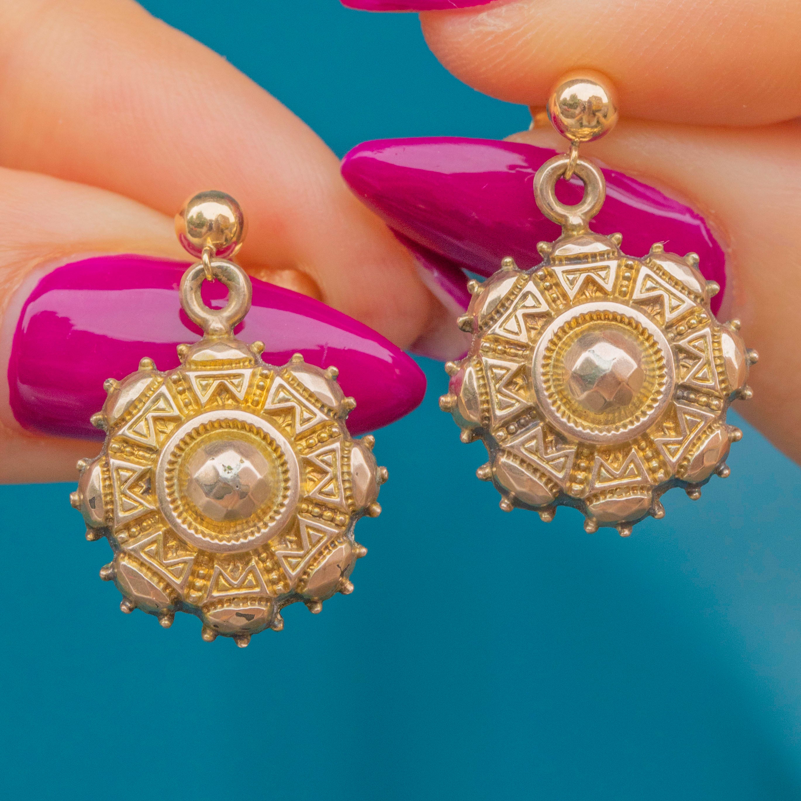 These antique Etruscan earrings feature round drops composed of brightly textured 9ct Gold attached to beaming 9ct Gold studs, they are a glossy treat to grace your lobes with!