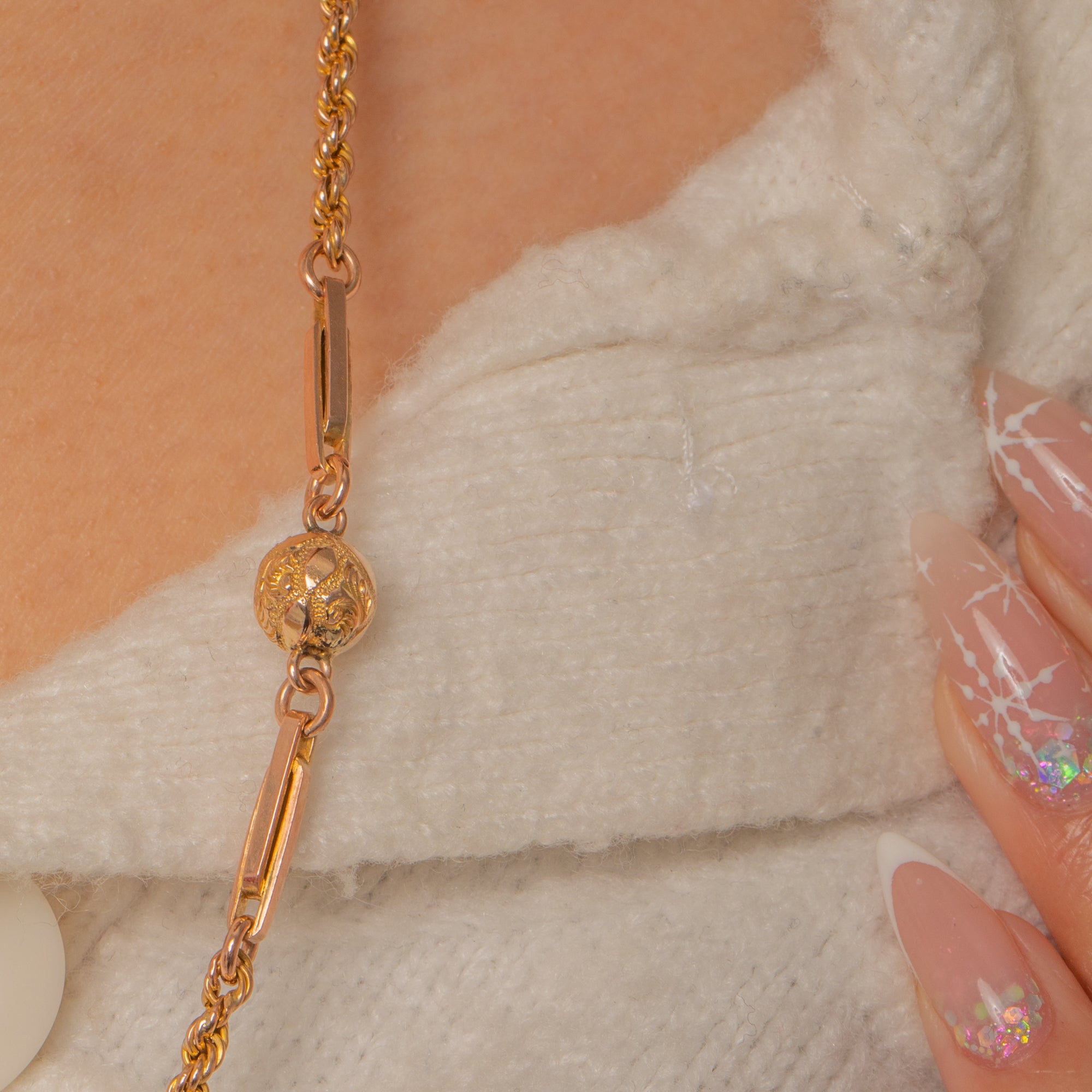 An elegant Victorian fancy link chain in glowing 9ct Gold. This long beauty flows with twisted rope links with ball and fetter sections formed of chased beads flanked by chunky paperclip links. The interplay of textures and the subtle rosy‑to‑yellow hues give it that unmistakable antique allure—ornate yet refined, with a graceful drape.