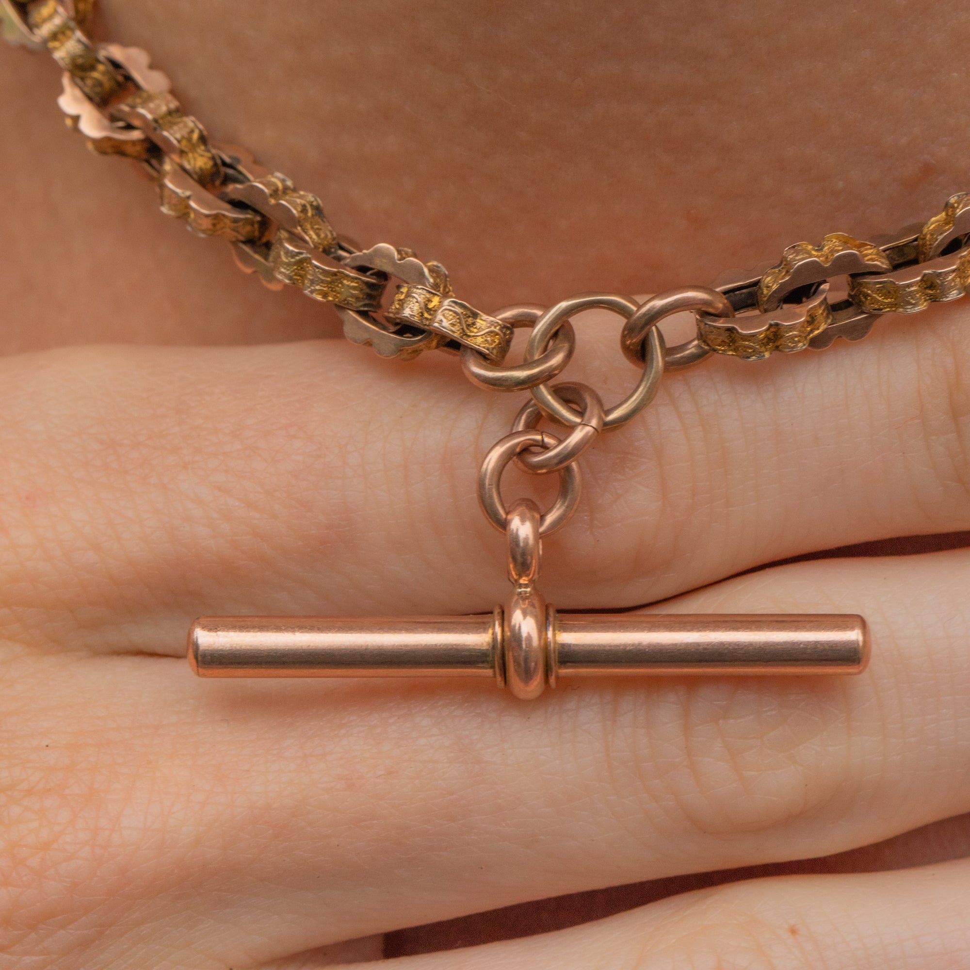 We adore this Victorian 9ct Gold fancy link Albert chain, complete with two dog-clips & a T-bar! The links on this rosy-hued chain are gorgeous, chunky and beautifully engraved, making this a unique treasure to enjoy for a lifetime.