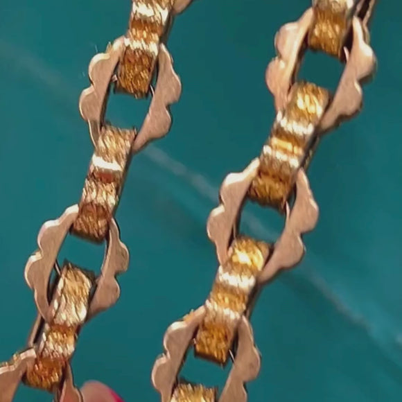VERY GOOD. This Victorian 9ct Gold fancy link Albert chain is in very good condition. This treasure has wonderful engravings and all links are securely connected. There are also two additional connecting links that can be used to extend the necklace by 1/2". There is some discolouration visible on the links, near the dog-clip clasps, which is not visible when you wear this treasure. With two fully functional dog clips, you can wear this unique antique treasure securely and enjoy her for decades to come!