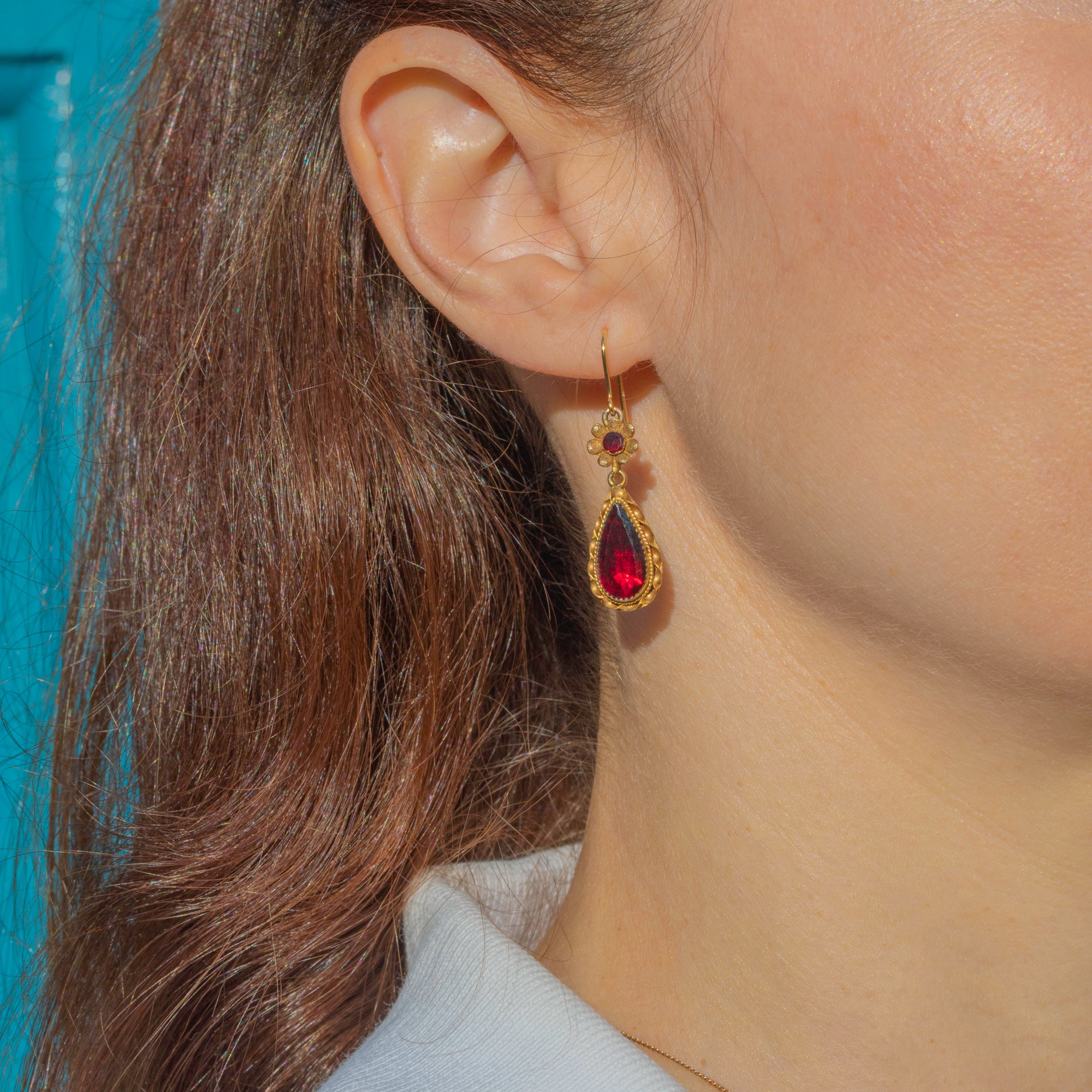These stunning Victorian earrings are crafted in 9ct Gold and set with richly coloured Garnets. Each earring features a dainty Garnet flower at the top, suspending a vibrant teardrop Garnet framed in Gold. The combination of the glowing red stones and ornate settings gives them a beautiful period elegance.