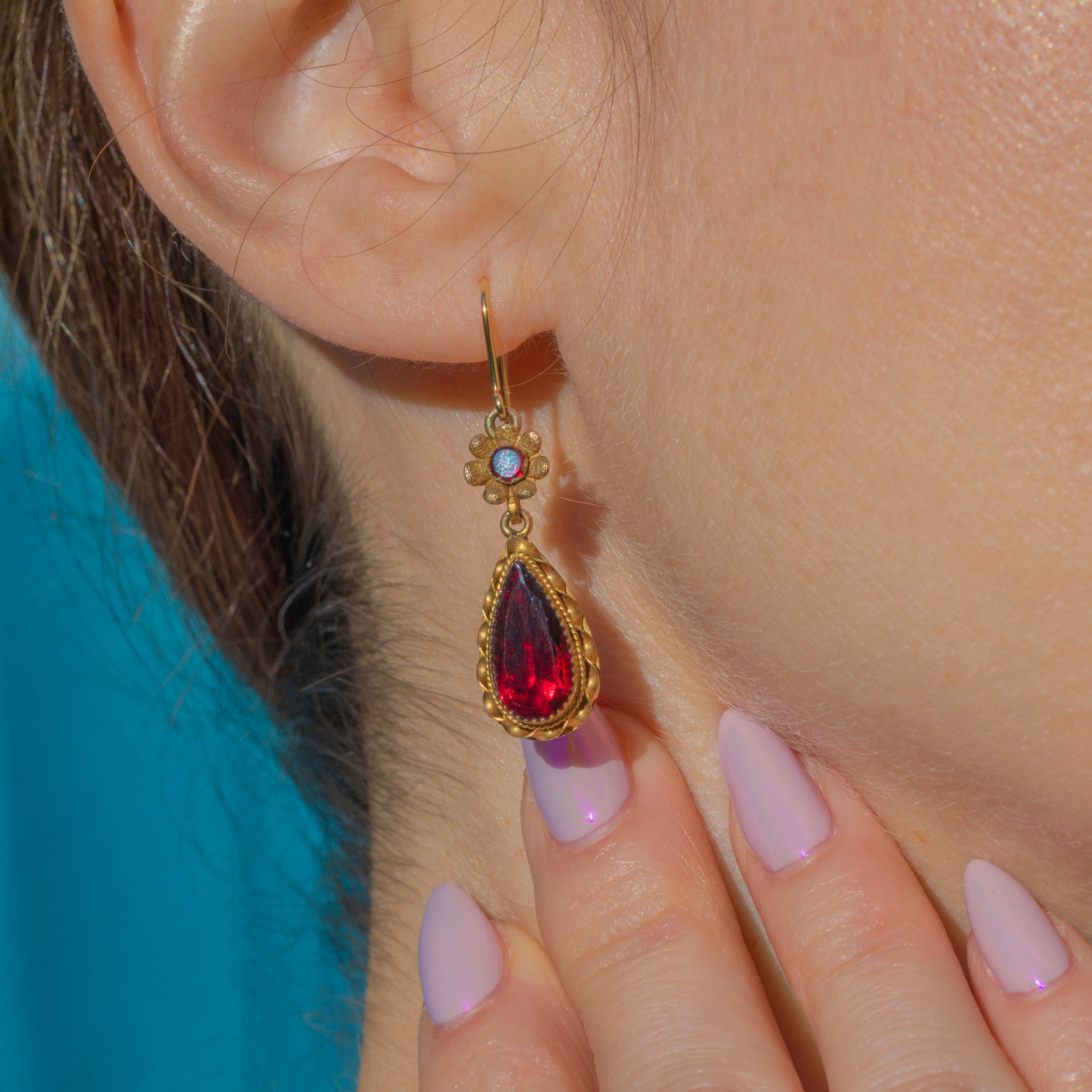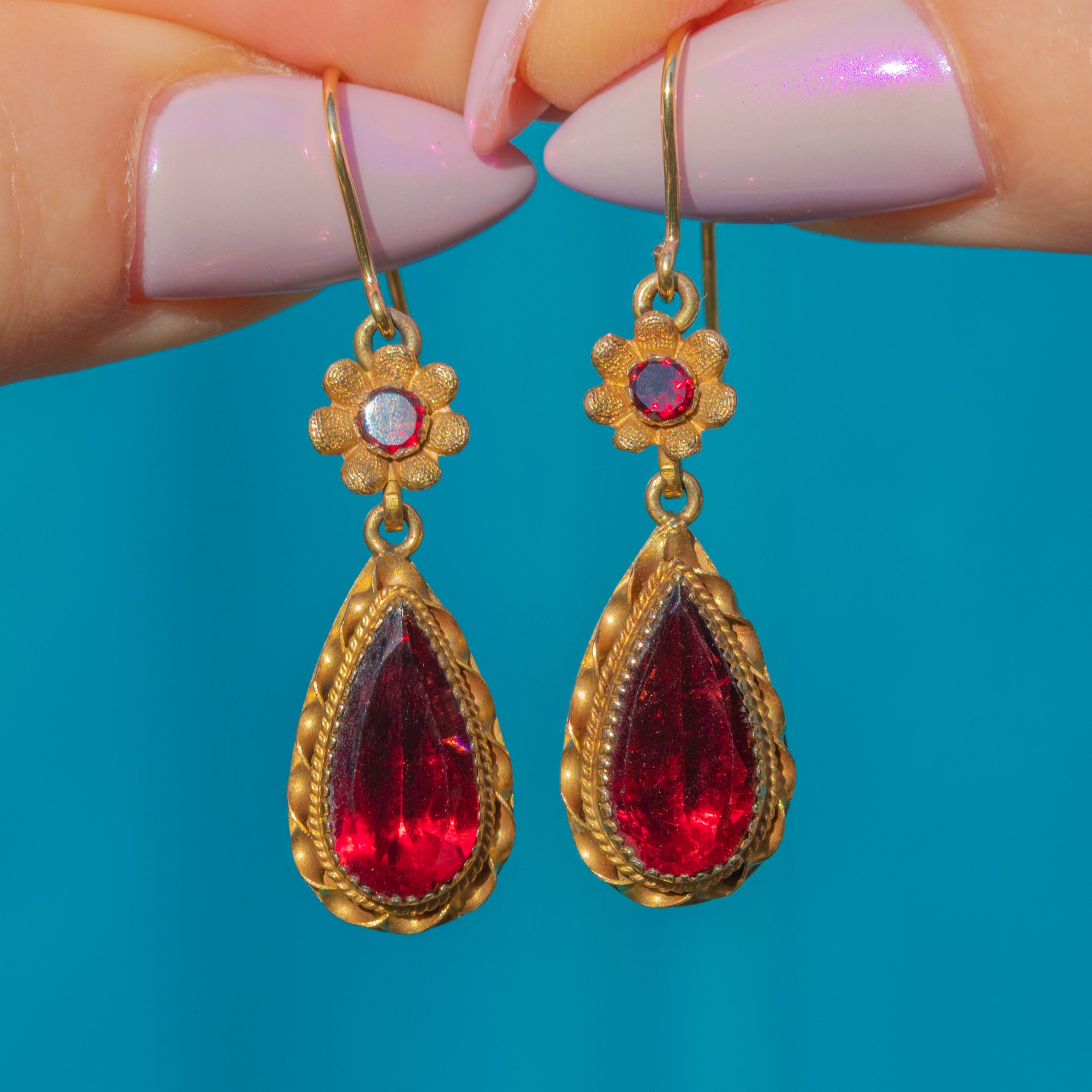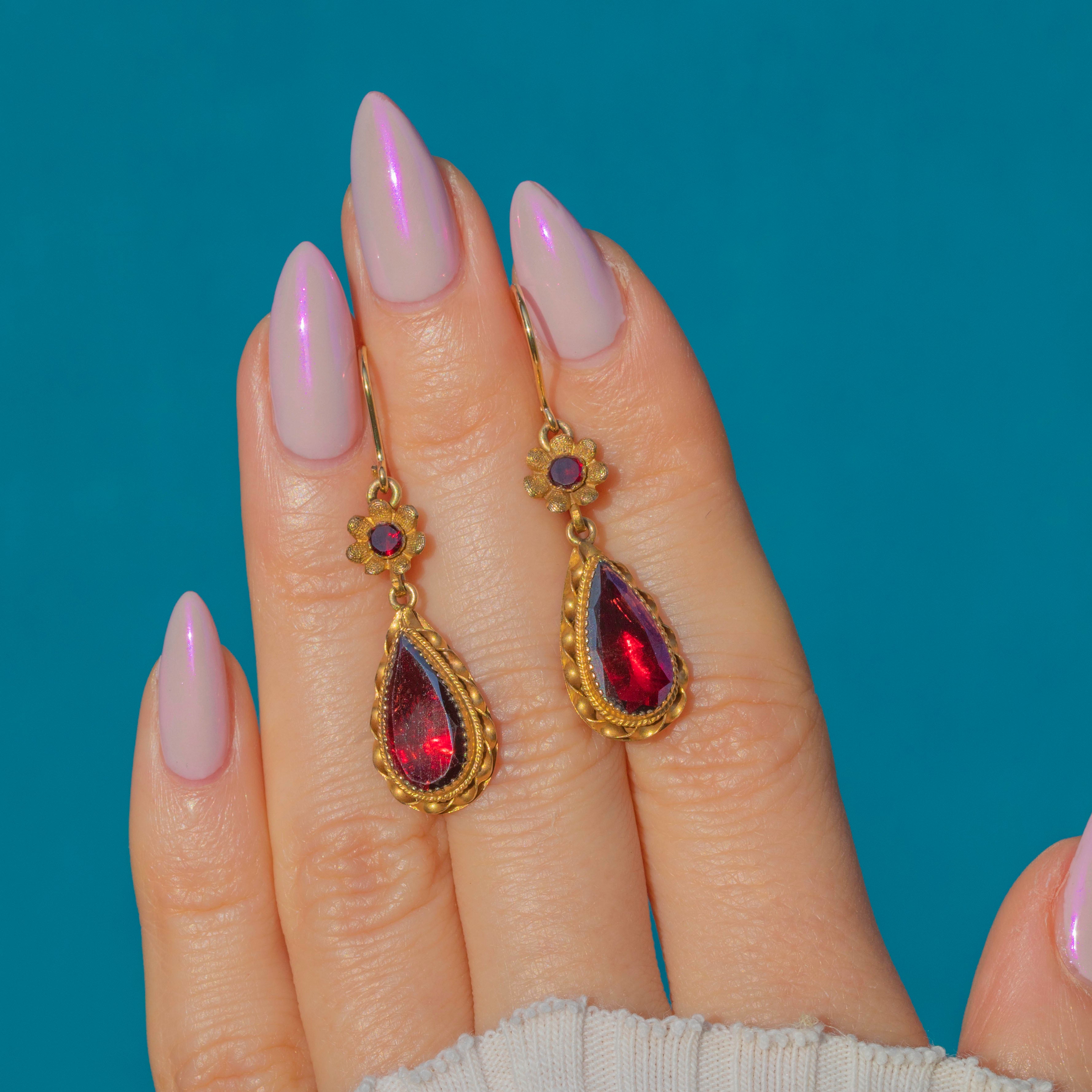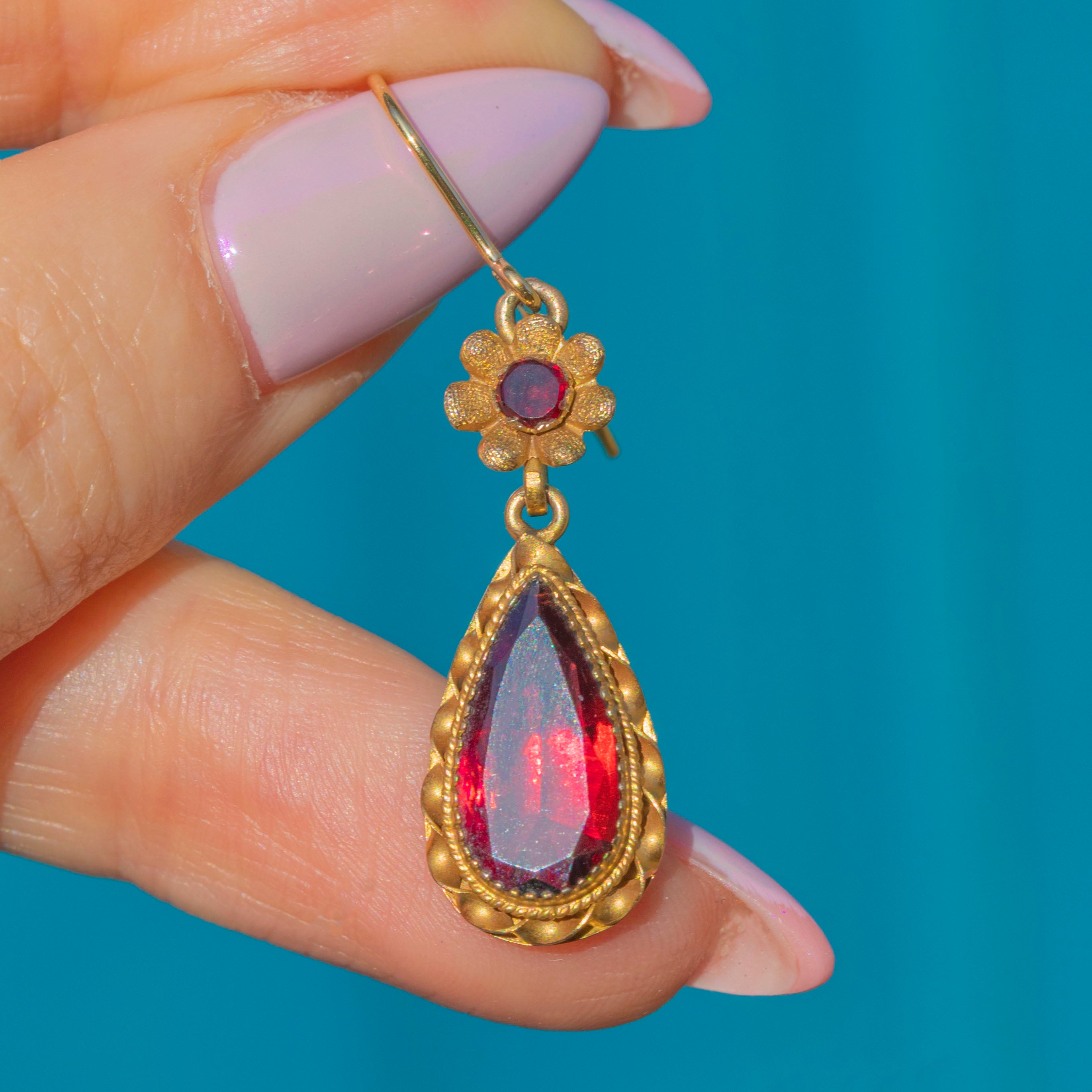 Victorian 9ct Gold Flat-Cut Garnet Flower & Teardrop Earrings