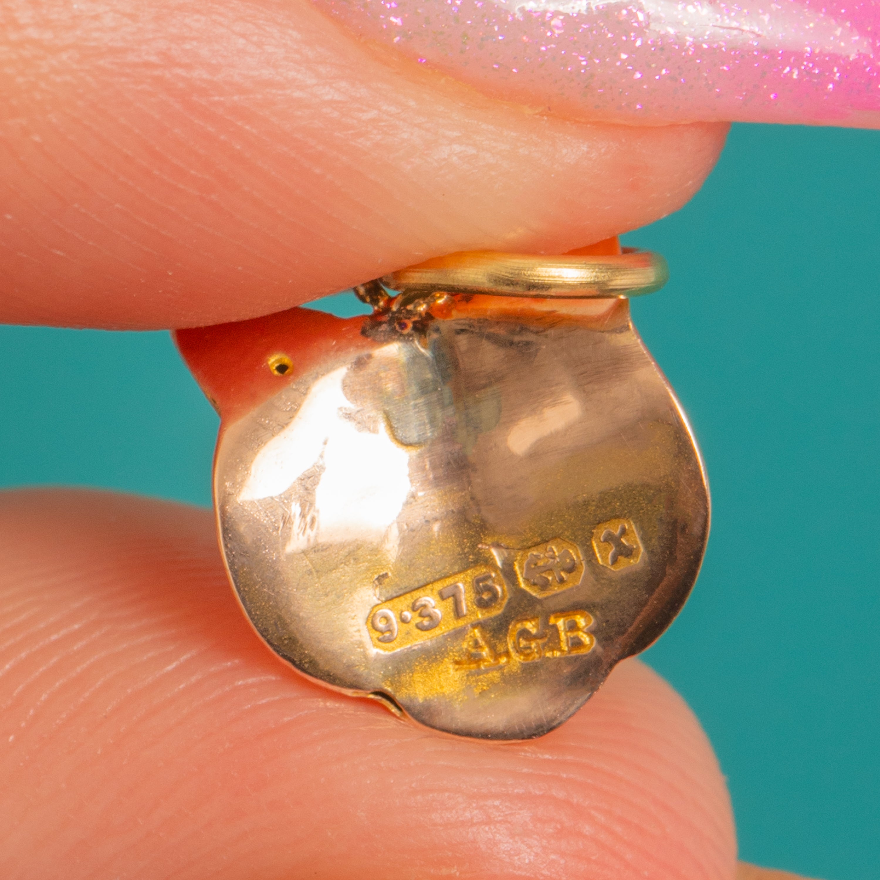 HALLMARKS: 9, .375, Birmingham Anchor, date letter “x” for 1897, maker’s mark A·G·B.