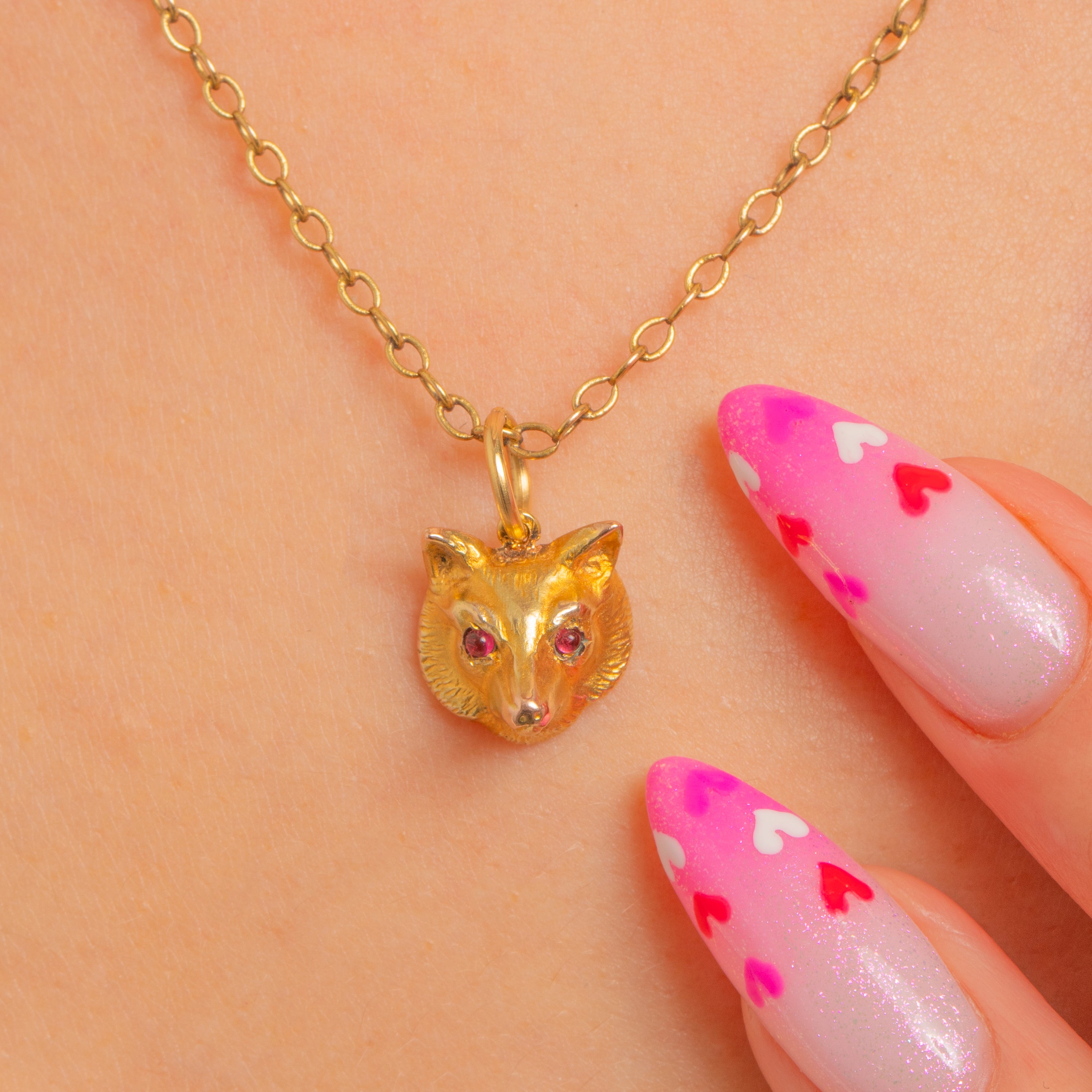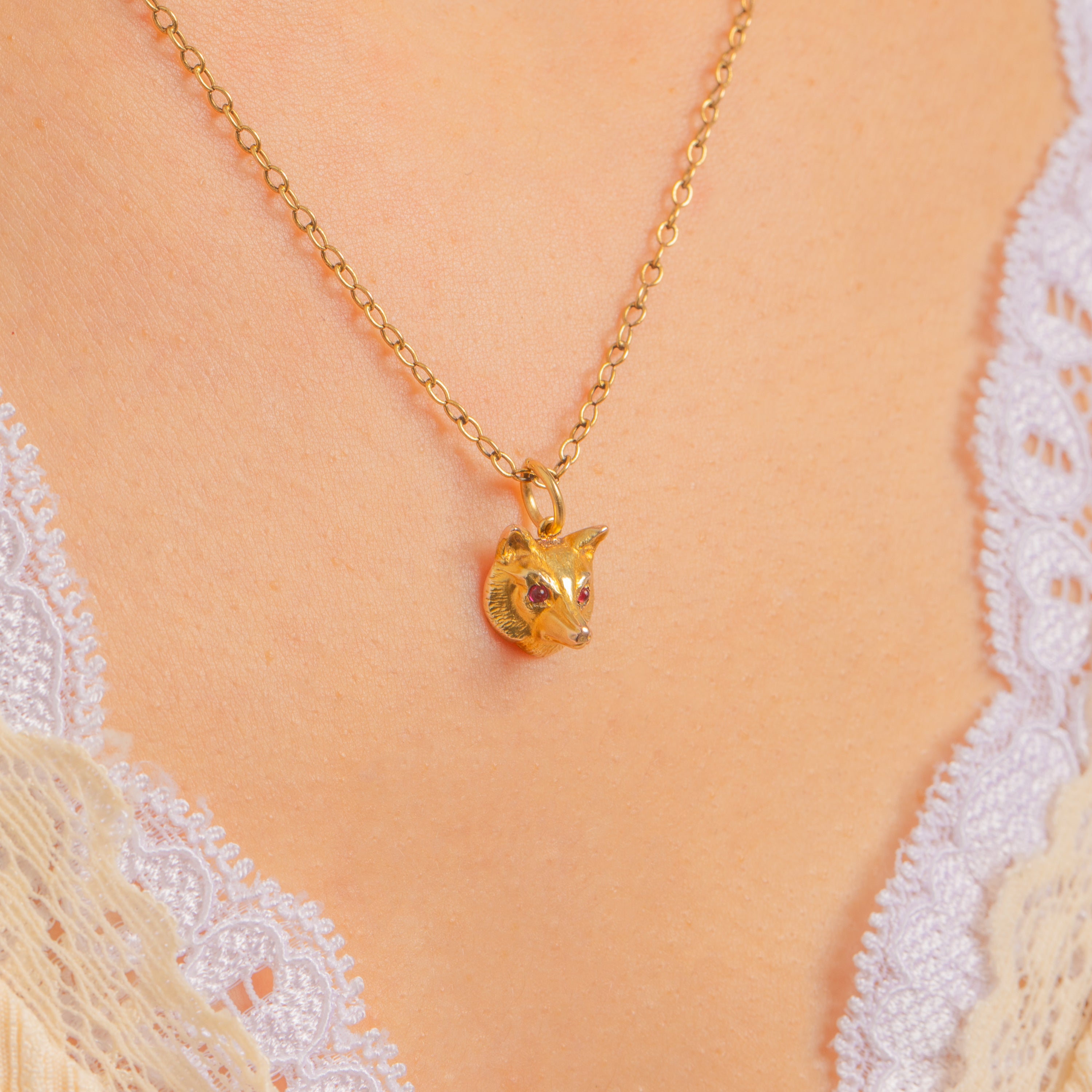 A delightful Victorian fox charm rendered in warm 9ct Gold, its sculptural three‑dimensional head finely textured to suggest soft fur. Two vivid red Spinel eyes bring this characterful creature to life, lending a subtle flash of colour to a petite, wearable piece that layers beautifully and feels wonderfully talismanic.
