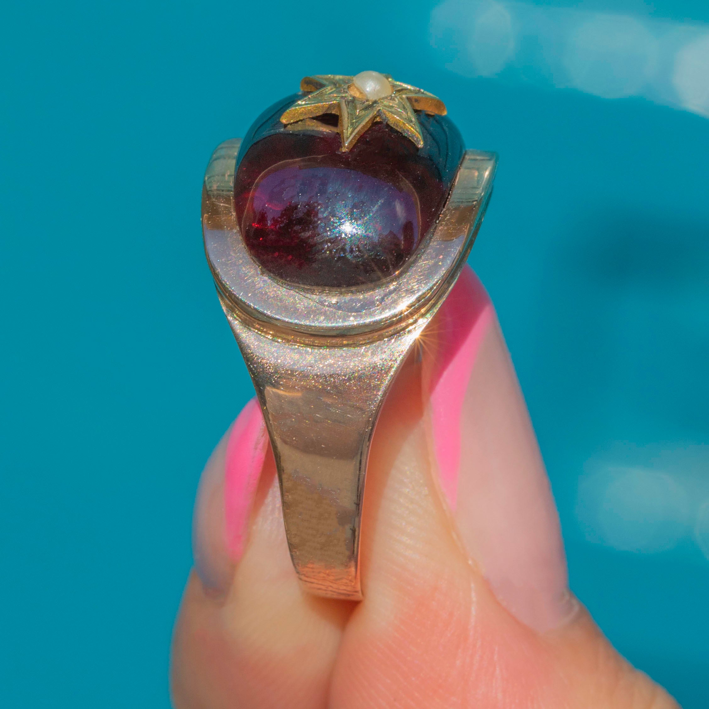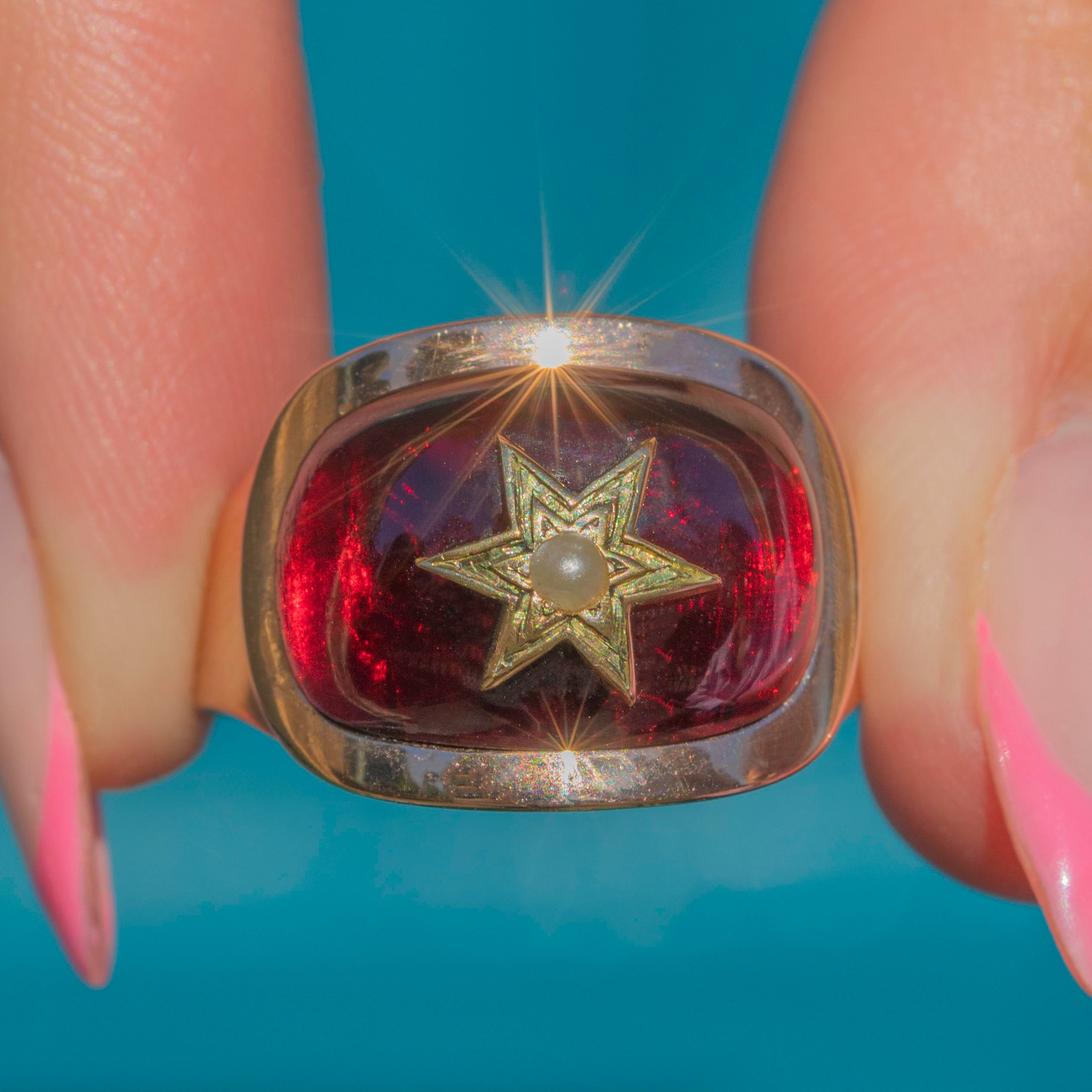 VERY GOOD: This Georgian 9ct Gold Garnet cabochon Pearl star ring is in very good condition. The Garnet has a delicious berry red hue, without any fleabites or scuffs, which is really remarkable for its size and age! The 9ct Gold is a lovely soft yellow antique tone, with no major scratches and only a minor dent to the back of the band. She has been resized, as evidenced by the back of the ring, which cannot be seen while the ring is worn and does not impact its structural integrity. The band is smooth and comfortable to wear; she's ready to be enjoyed for years to come!