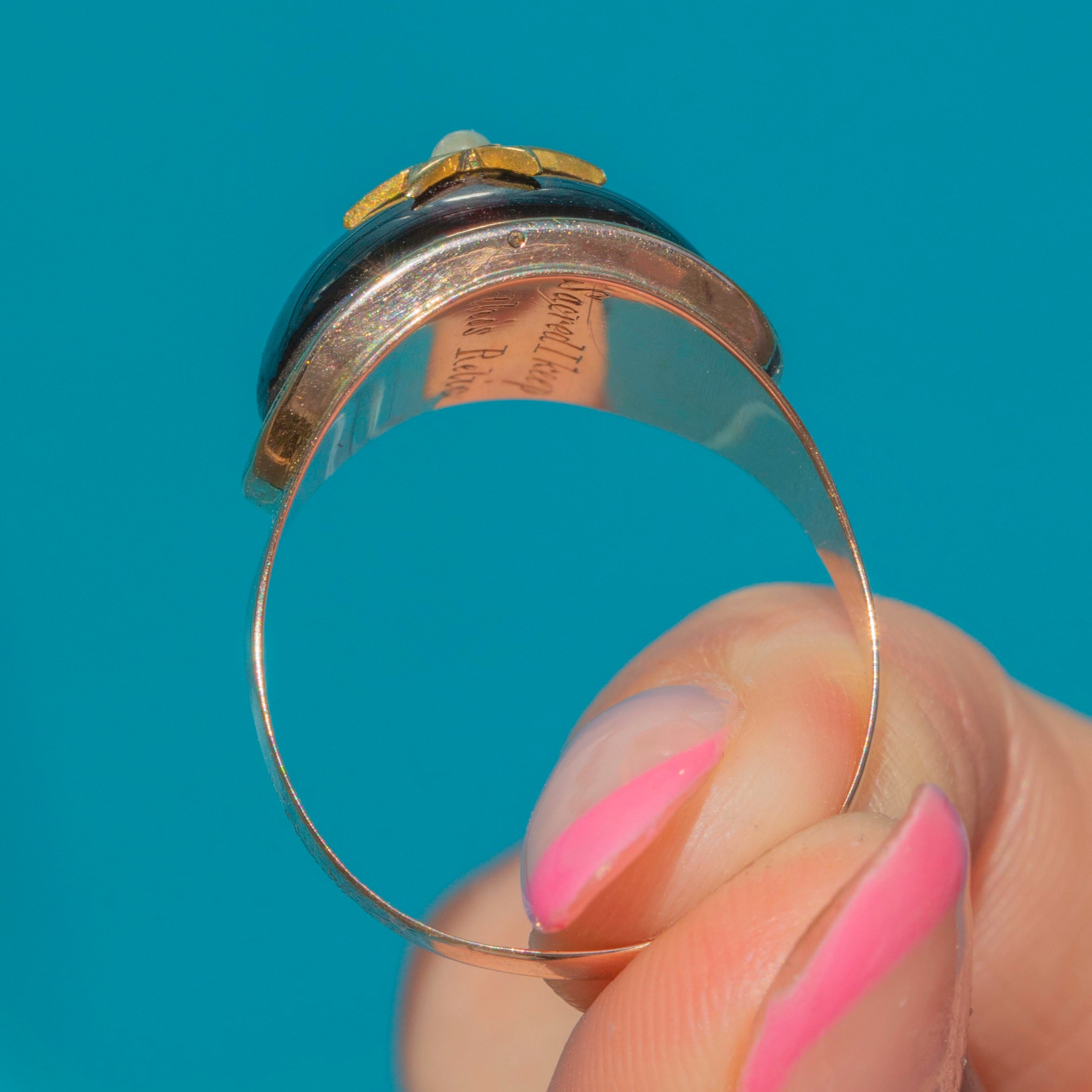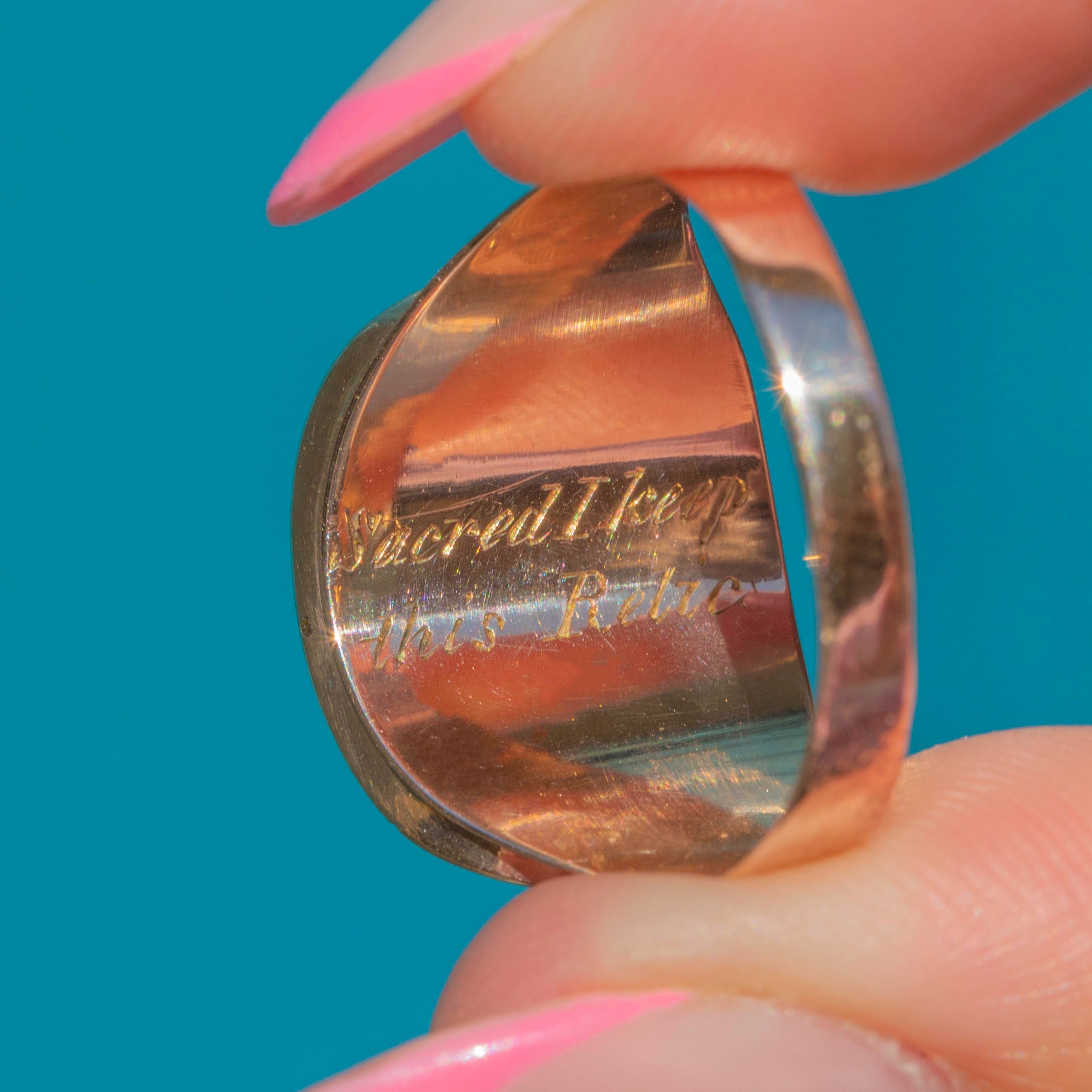 A true celebration of Georgian craftsmanship, this chunky Gold ring boasts a vibrant Garnet cabochon inlaid with a bold star, set with shimmering Pearl. The inside of the band has been intricately engraved with the words "Sacred I Keep This Relic", adding intrigue to this magnificent piece.