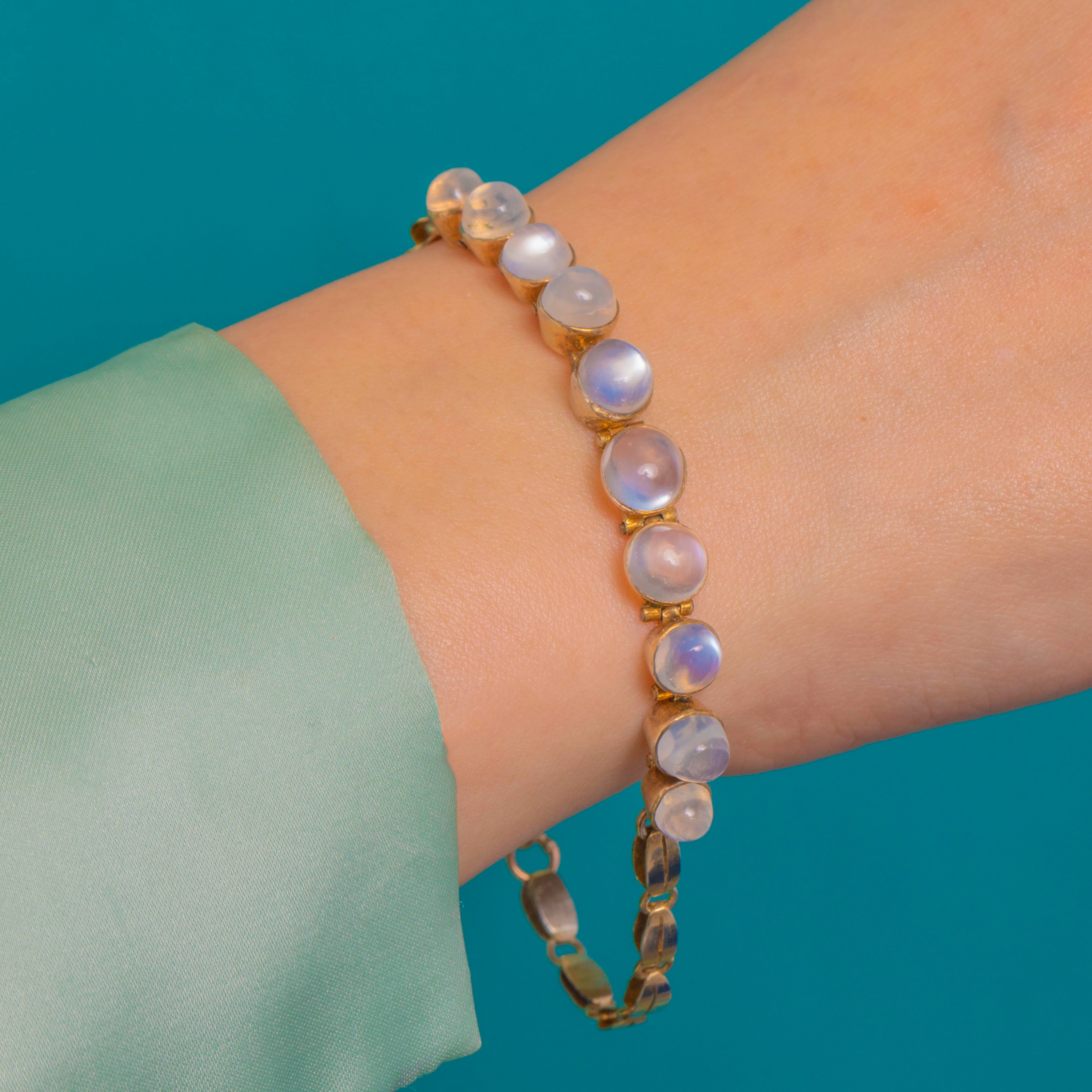 VERY GOOD-EXCELLENT: Moonstones are bright with a soft adularescence, showing only light surface abrasions commensurate with age. The collet settings are secure with gentle wear and occasional tiny nicks/softening to some rims; articulation is smooth and links are sound. Overall well cared for and ready to wear.