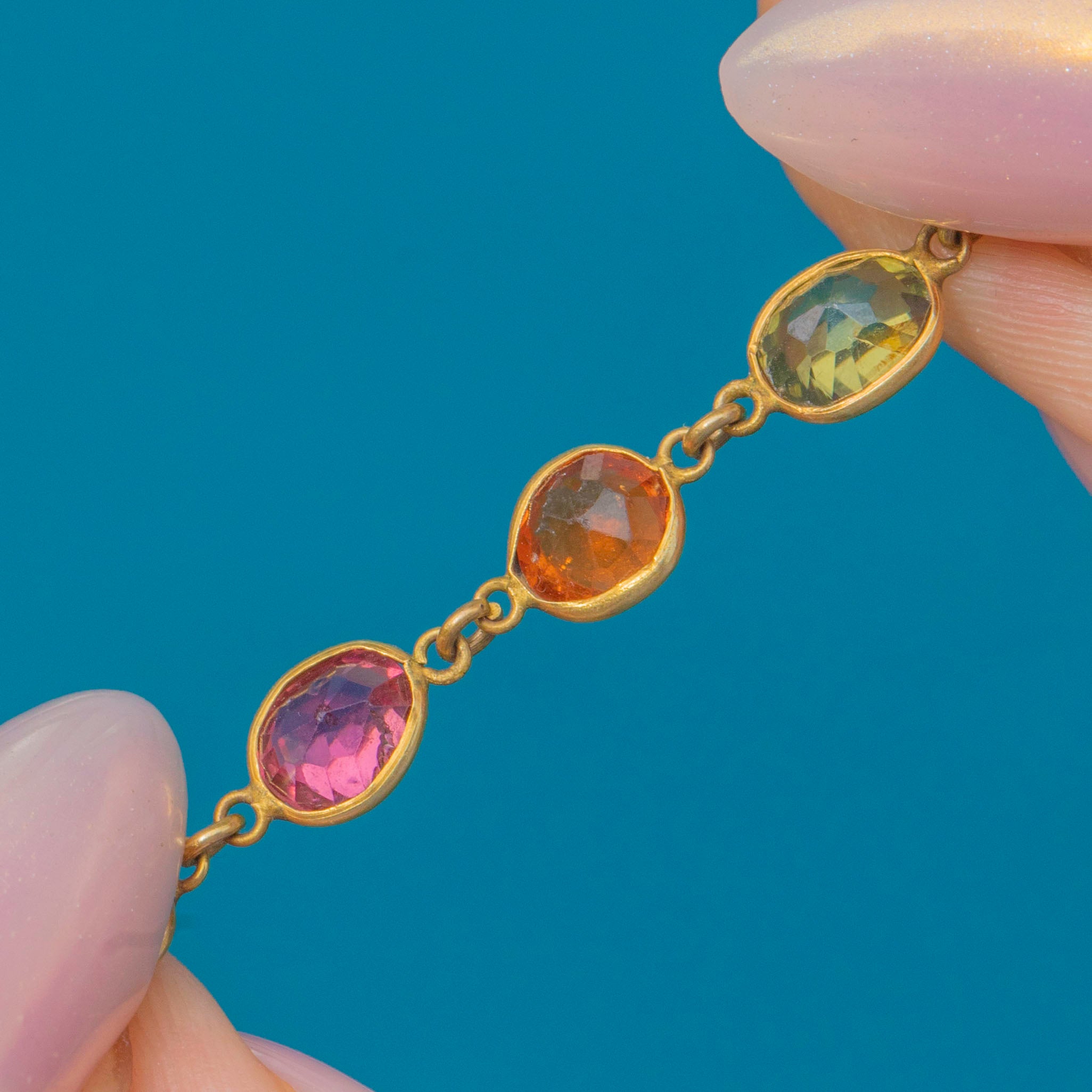 This delightful Victorian harlequin bracelet is crafted in 9ct Gold and set with a lively array of colourful gemstones. The design displays soft cornflower Blue Sapphires and Blue Topaz, complemented by Pink Garnets, Spinel, Citrine, Rock Crystal, and Orange Paste, creating a playful rainbow of colour across the wrist.