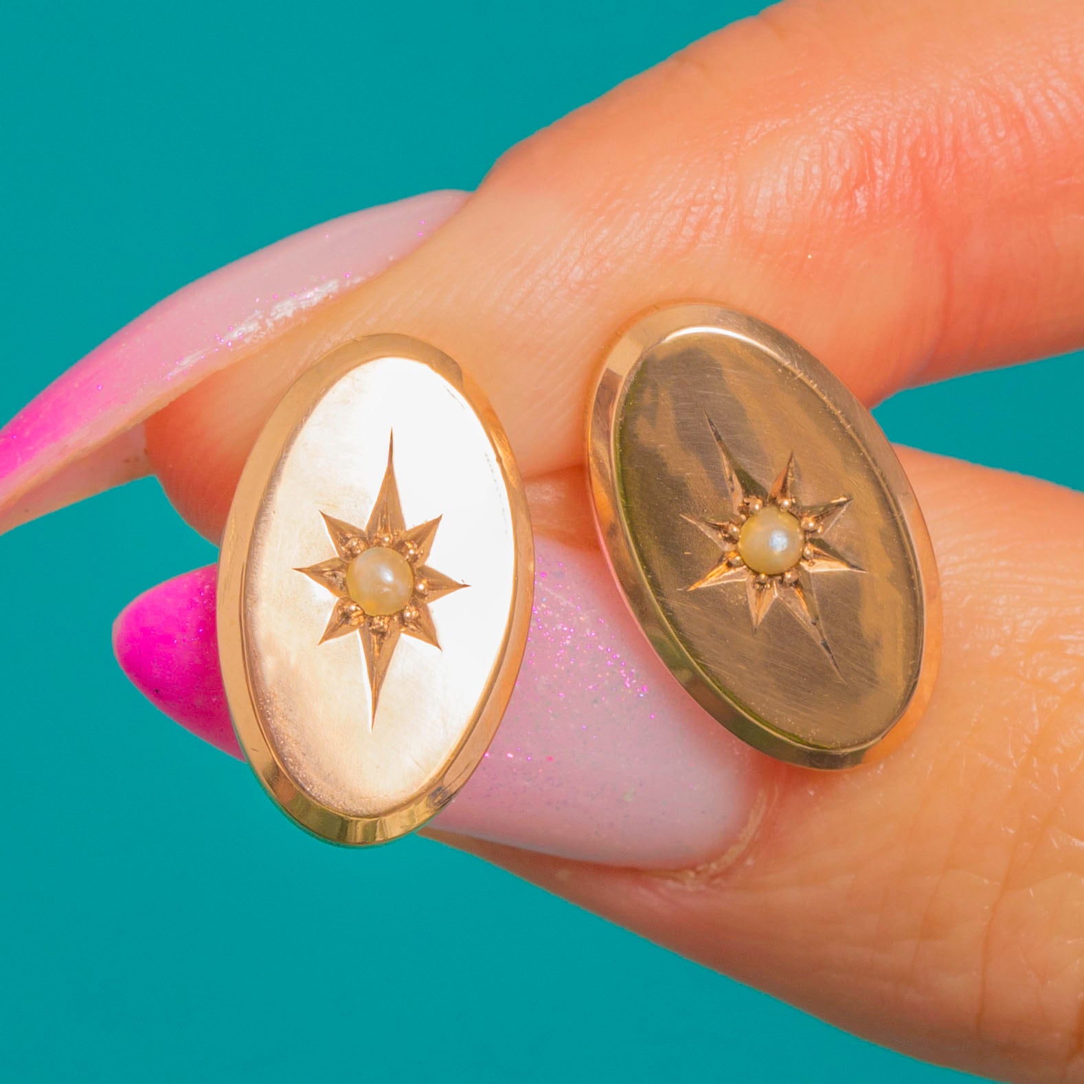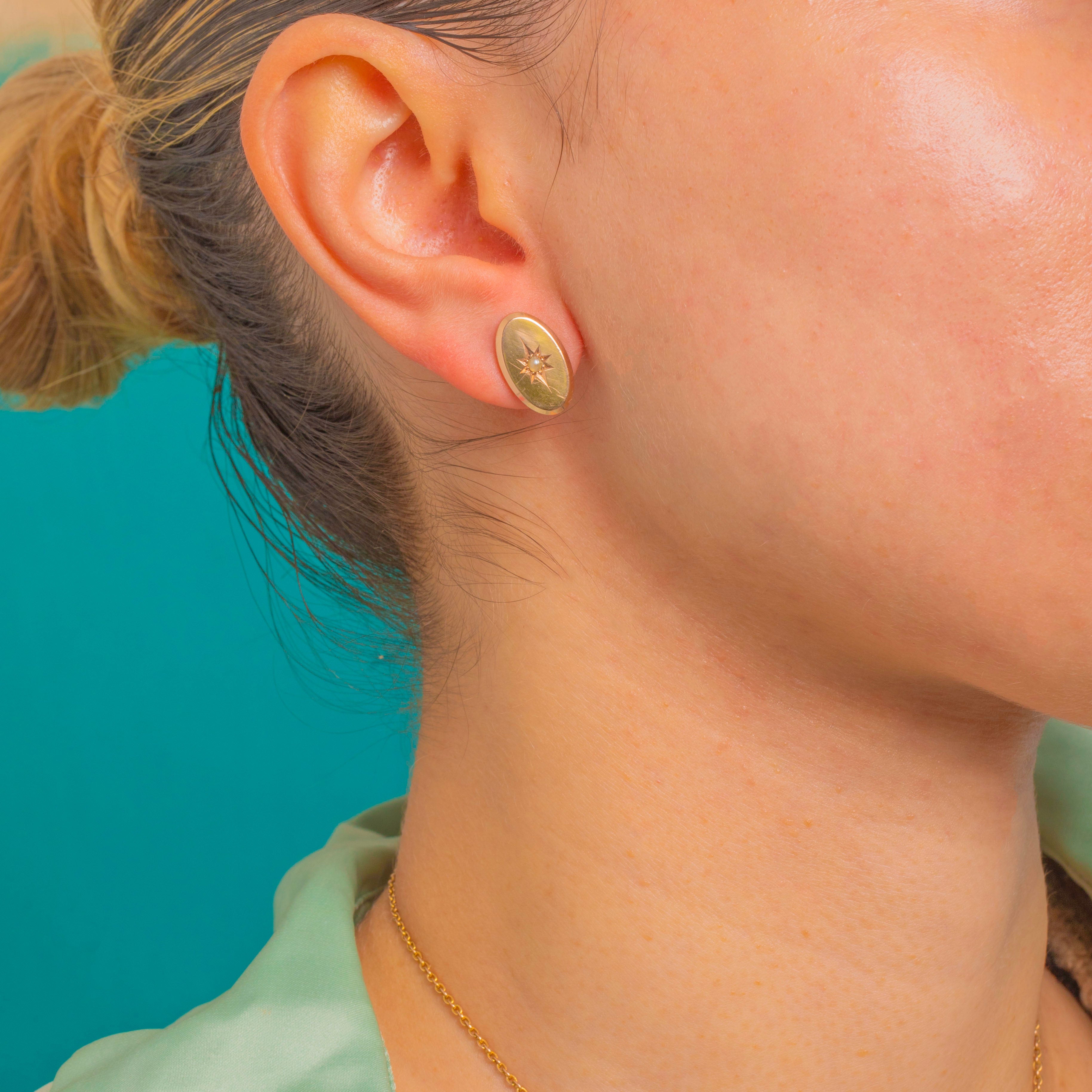 These charming Victorian 9ct Gold stud earrings capture the era’s love of celestial symbolism. Each low-profile oval plaque is crisply engraved with an eight-point star and set at the heart with a petite Pearl, creating a delicate glow against the warm Gold.