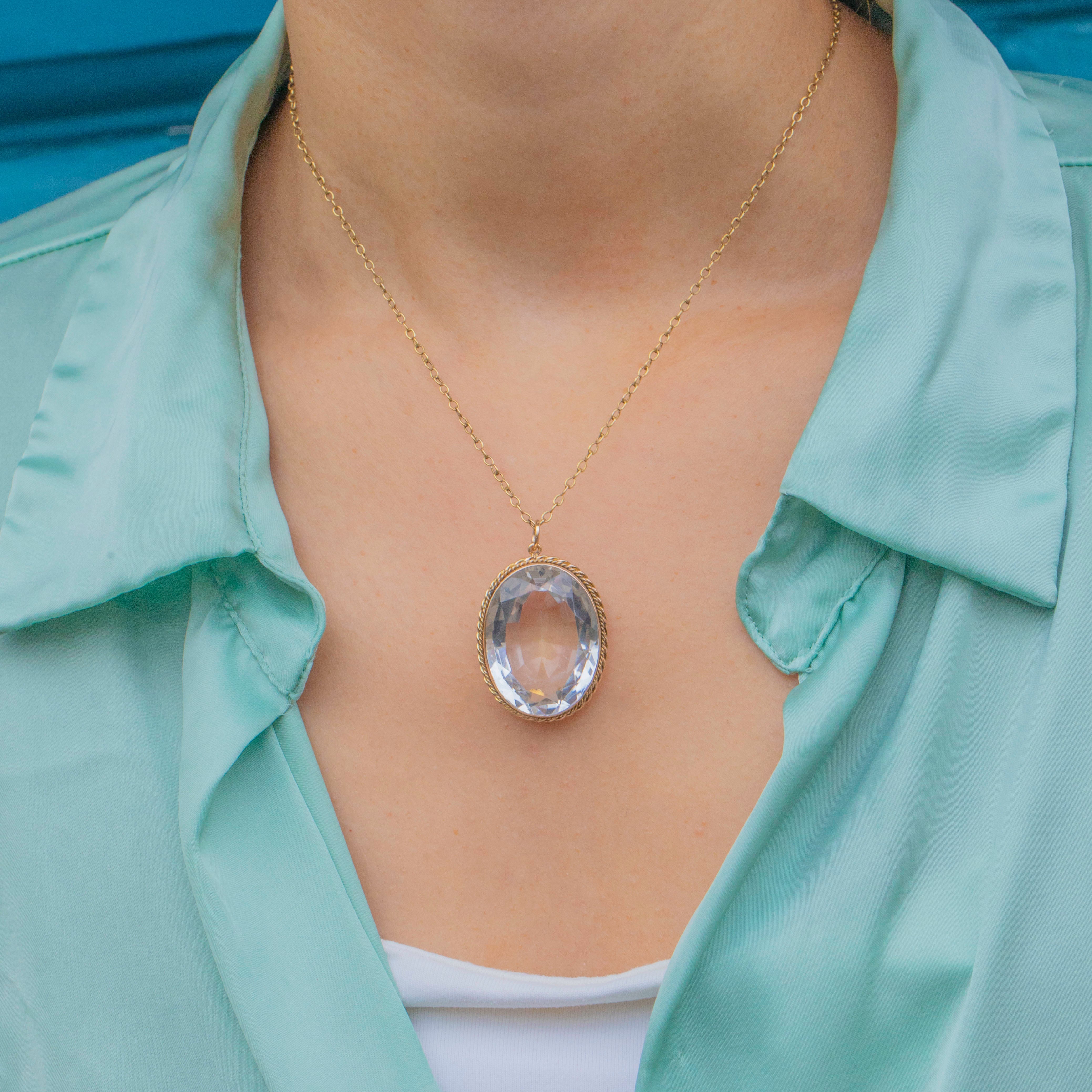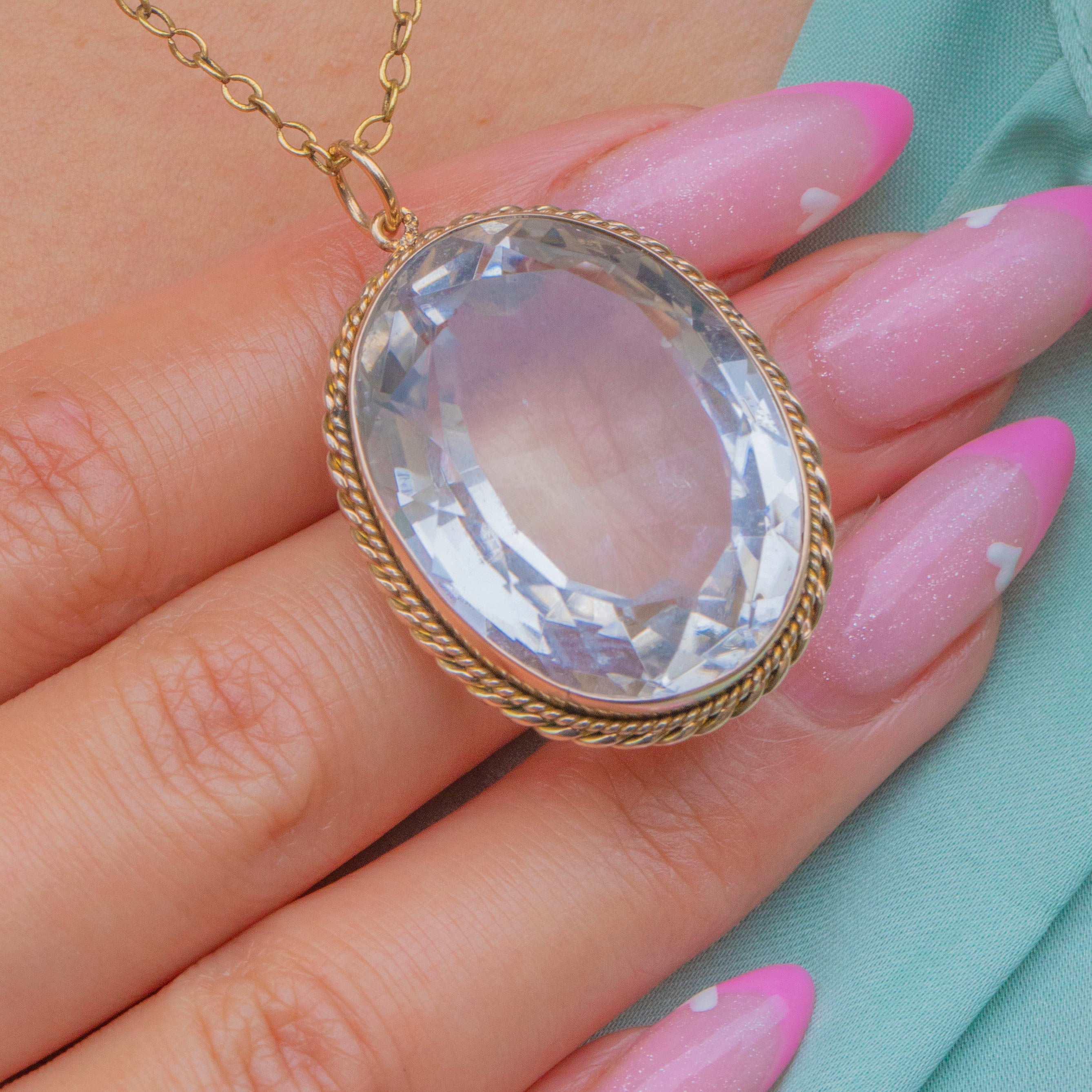 This impressive Victorian pendant features a beautifully clear 26.00ct Rock Crystal, expertly cut to catch and reflect the light with striking brilliance. The gemstone is securely set in a warm 9ct Gold mount, its clarity and precision faceting creating a captivating play of light from every angle.