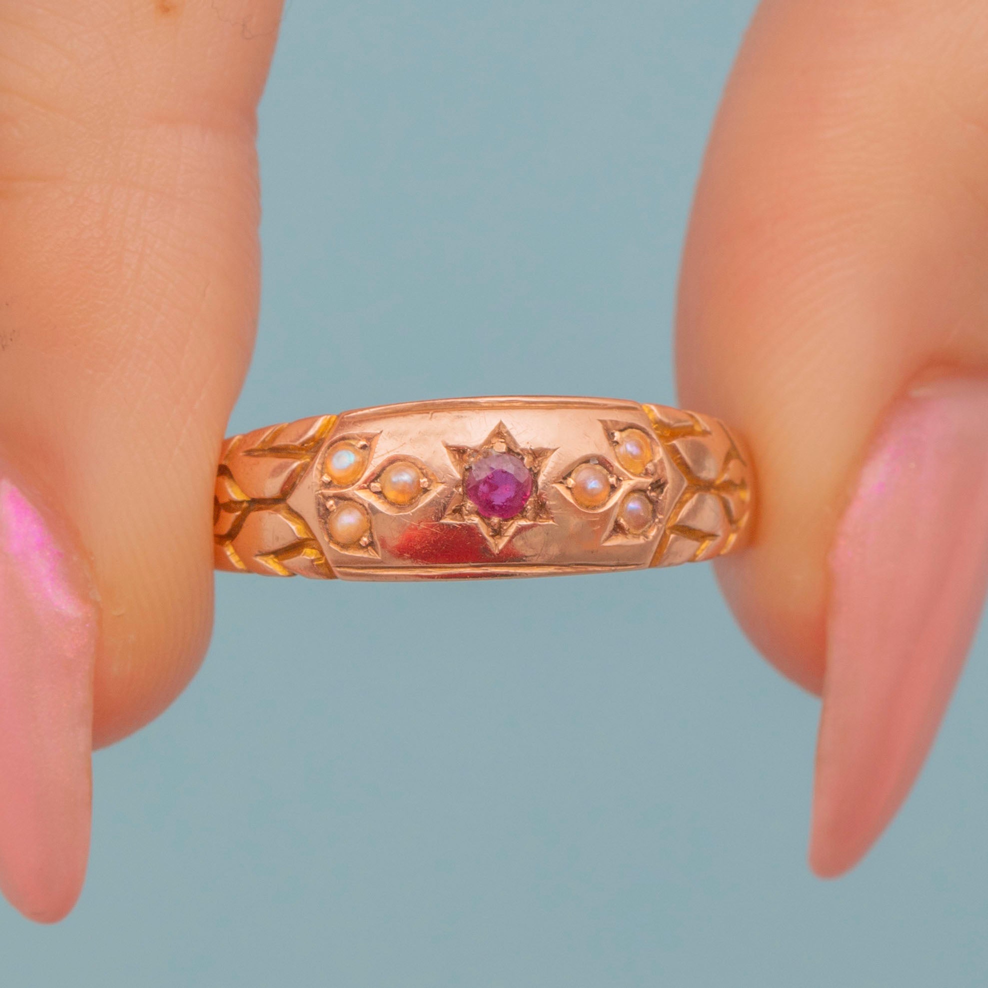 Victorian 9ct Gold Ruby Pearl Gypsy Ring, Floral Motifs