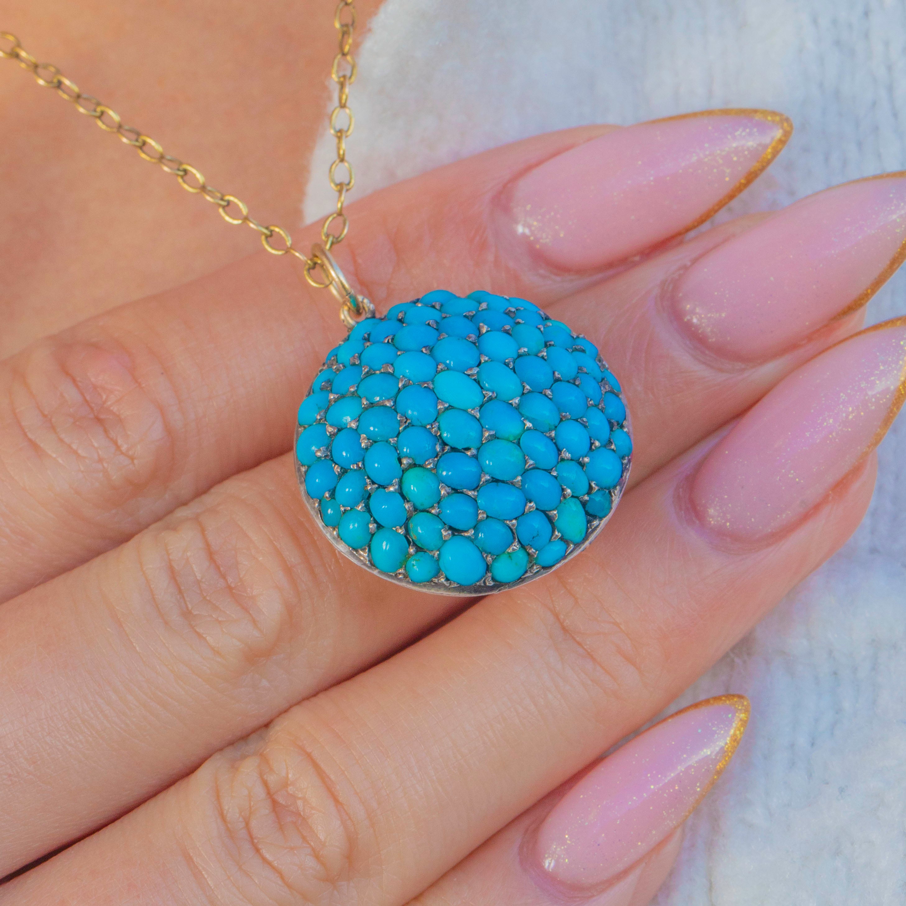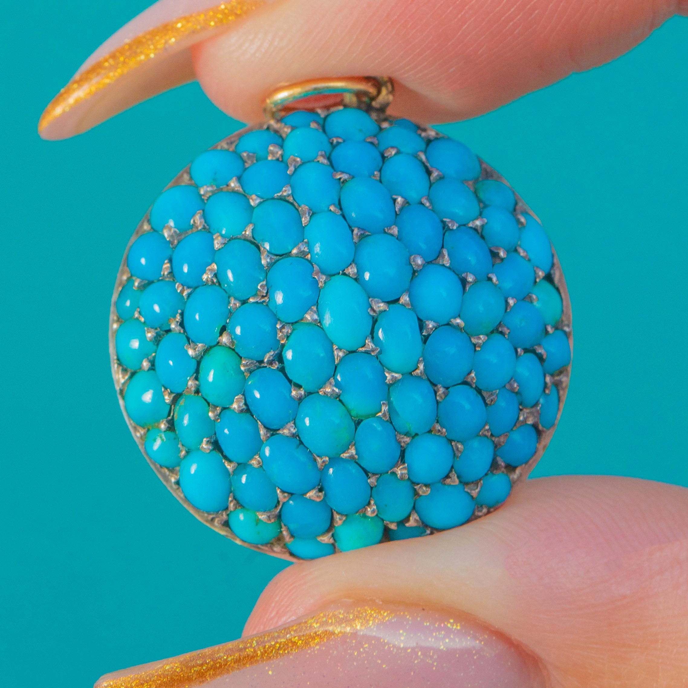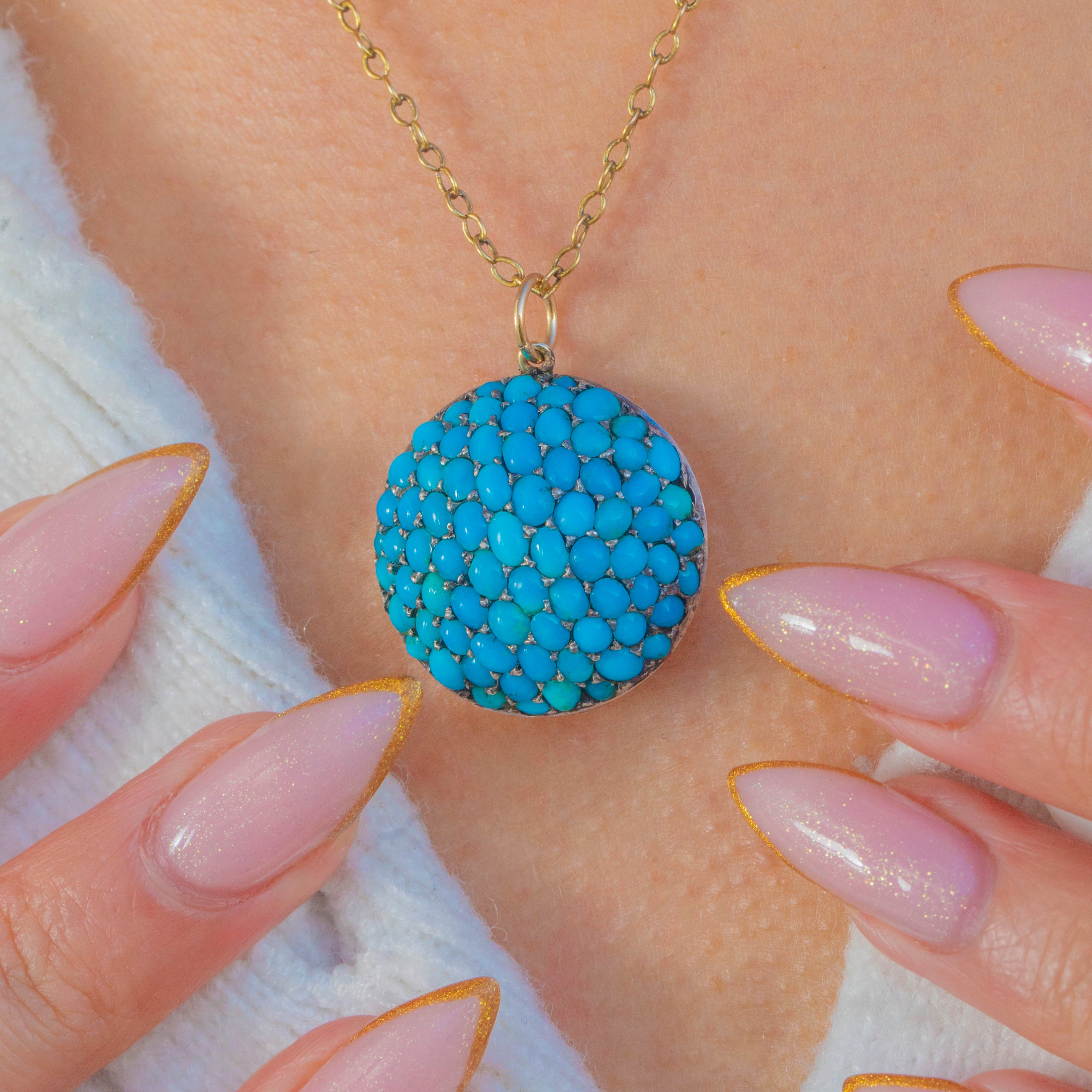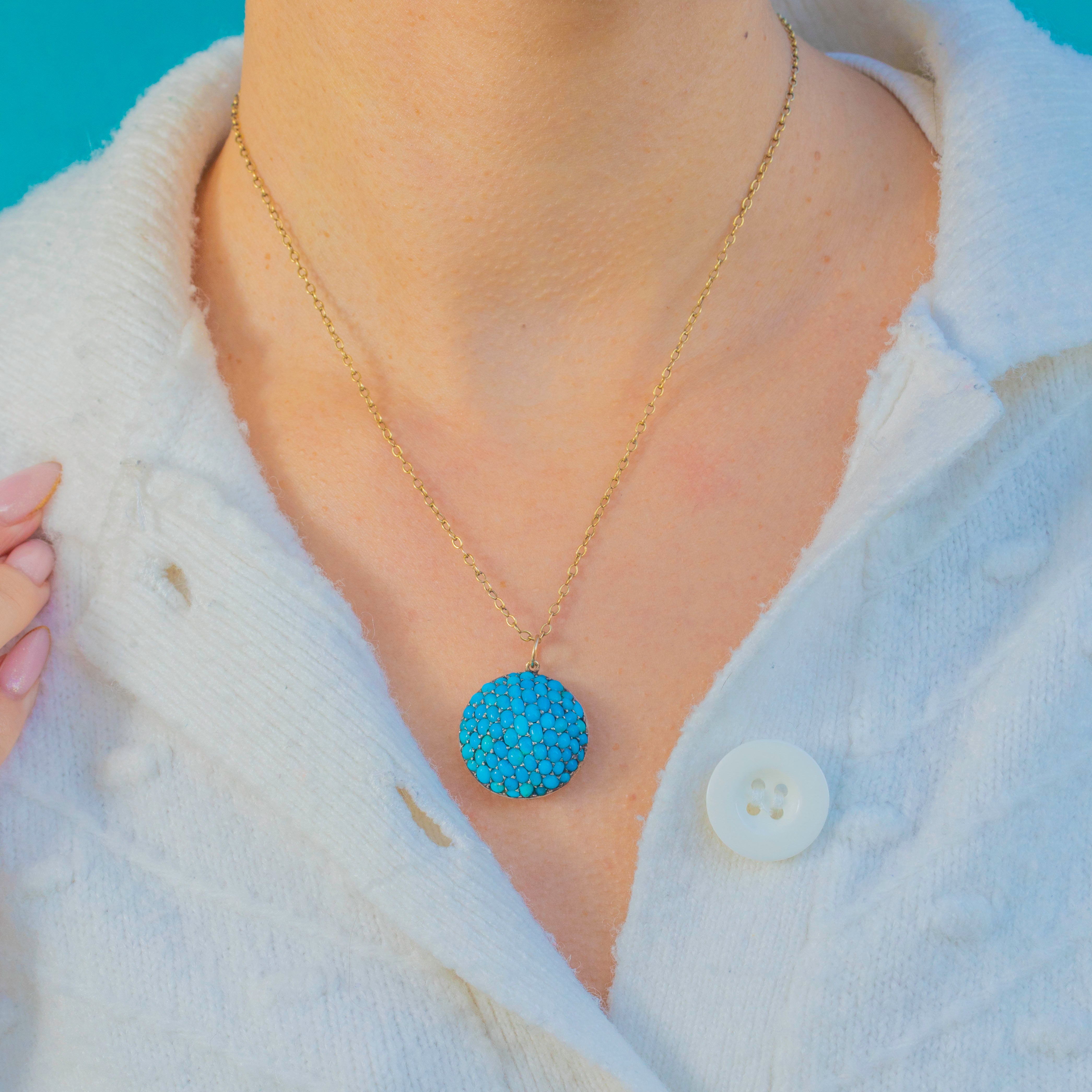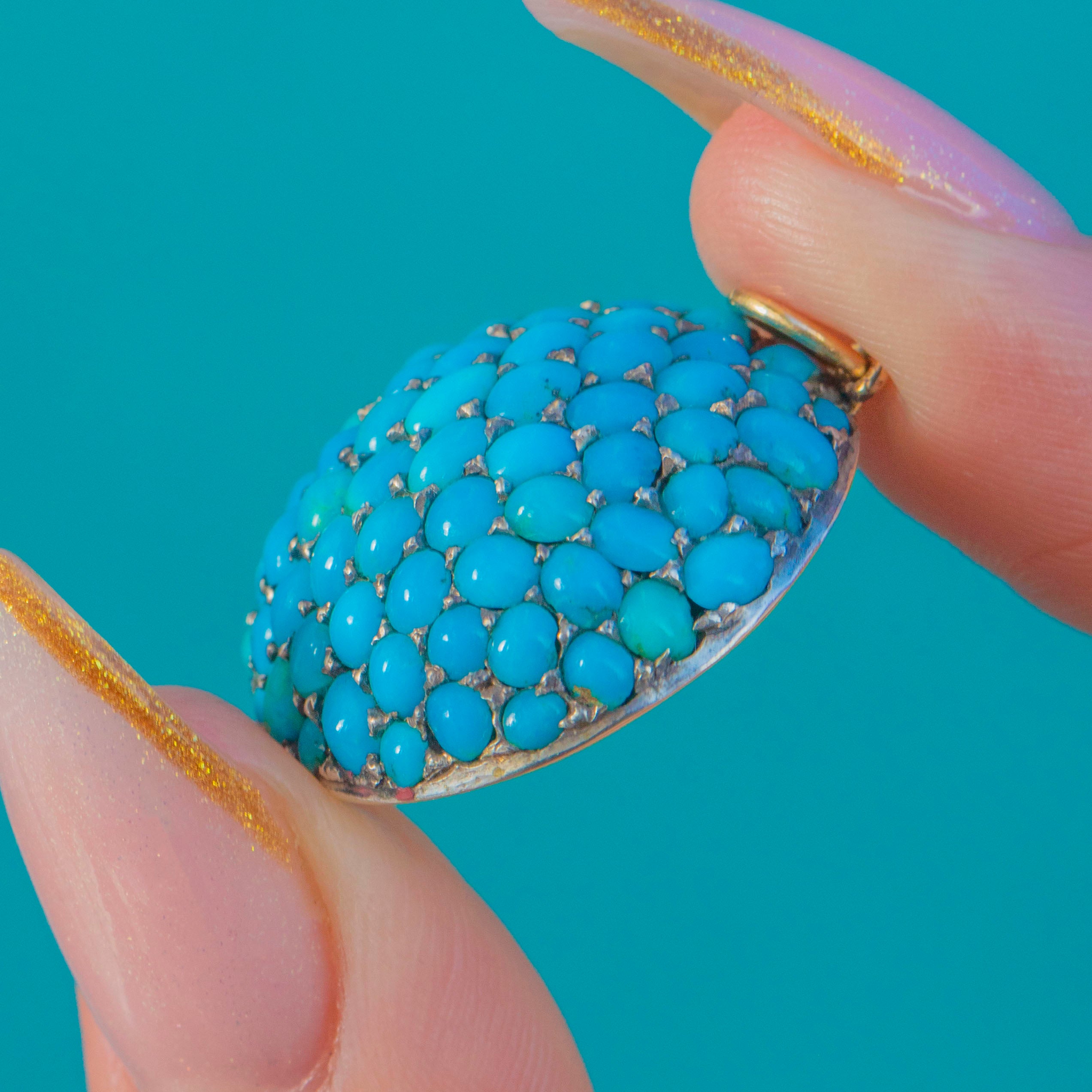 Bold, sculptural and beautifully Victorian, this pavé Turquoise bombé pendant is a scene-stealer in every sense. The entire domed face is set with tightly packed Turquoise cabochons, displaying that highly prized, vibrant Persian-blue colour so adored in 19th-century jewellery. The effect is wonderfully opulent—a sea of saturated turquoise tones reflecting softly from every angle.