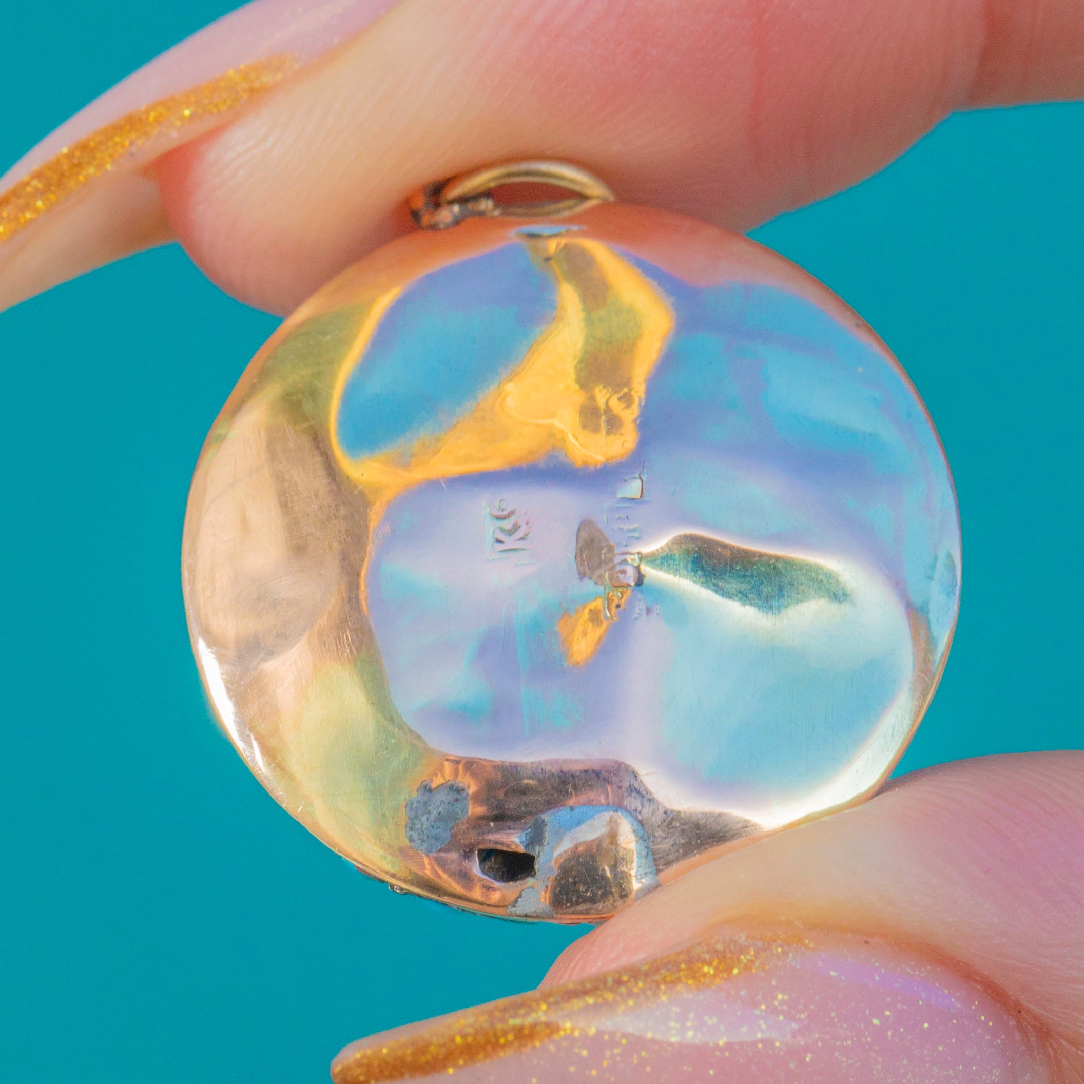 The piece is crafted with a 9ct Gold back and jump-ring, while the Turquoise is set in Sterling Silver, a classic Victorian two-tone construction. Its dramatic bombé profile offers incredible presence on the neckline, making it a striking focal point whether worn alone or layered. Originally converted from antique components—perhaps a brooch or button—the pendant retains all the charm of its early craftsmanship, complete with original stamps on the reverse.