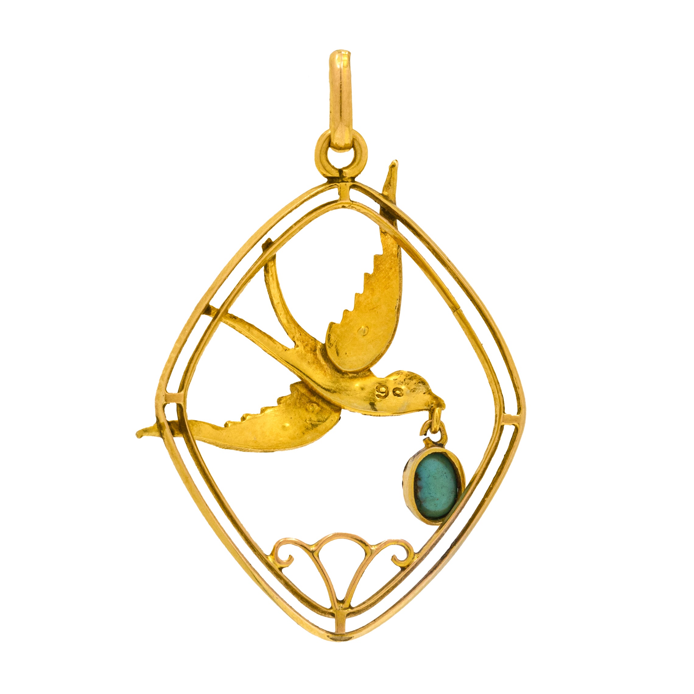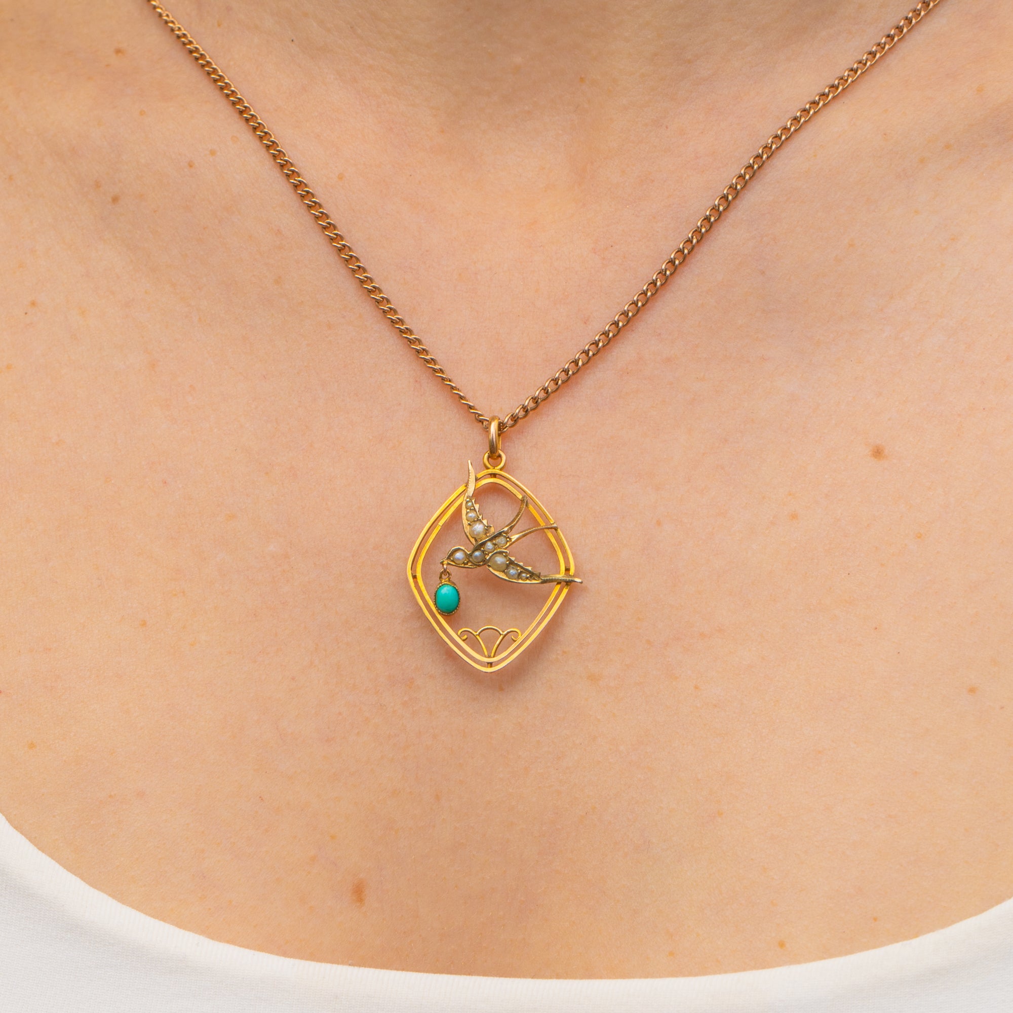 A sweet and emblematic treasure, this Victorian 9ct Gold swallow pendant features delicately curved lines crafted entirely from buttery 9ct Gold with a Pearl-encrusted swallow in flight carrying a vibrant Turquoise cabochon.