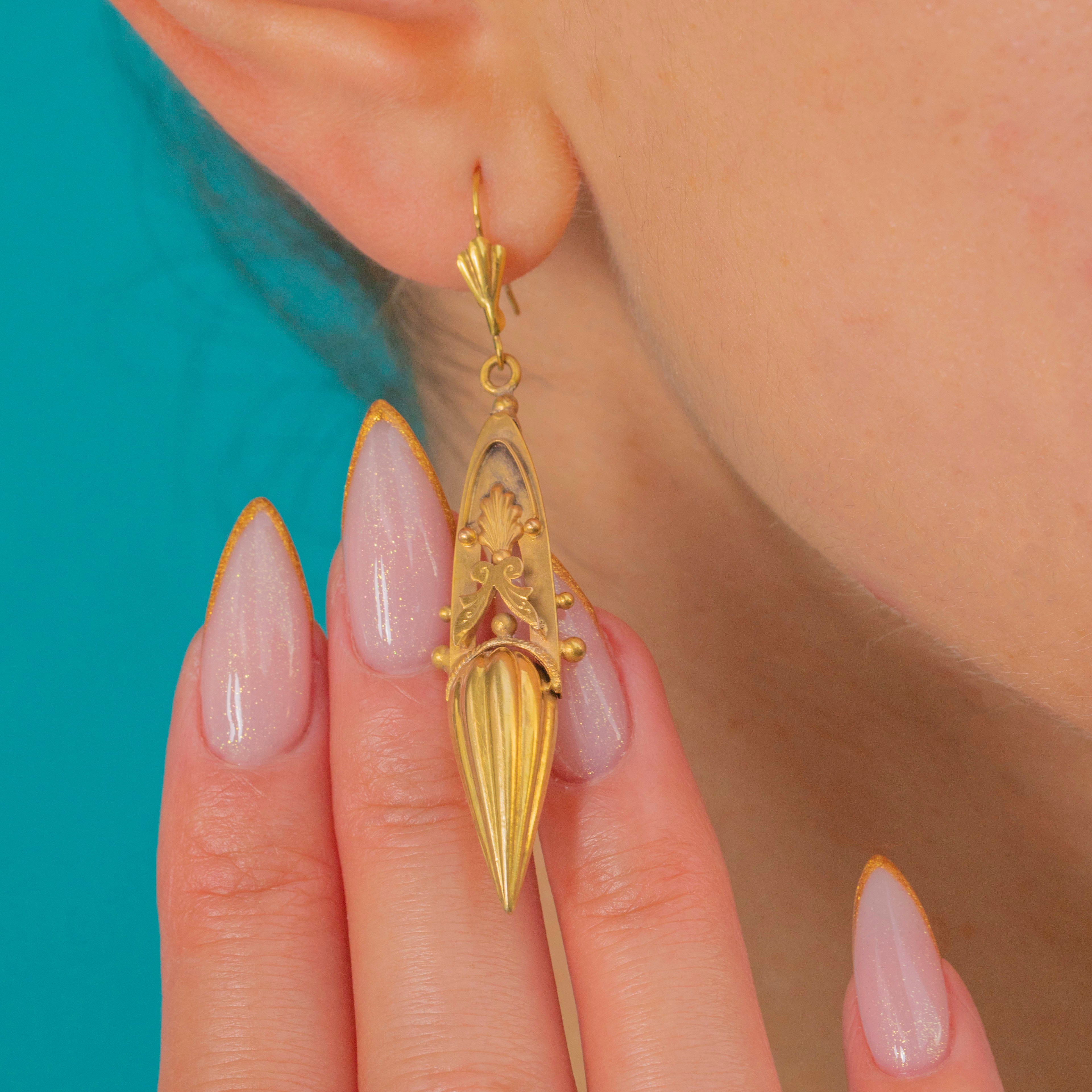 These striking Victorian torpedo earrings are a perfect example of the bold and sculptural style of the 19th century. Crafted entirely in rich 9ct Gold, their elongated drops feature classical motifs including shells, scrolls, and applied bead detailing, a true celebration of Victorian design.