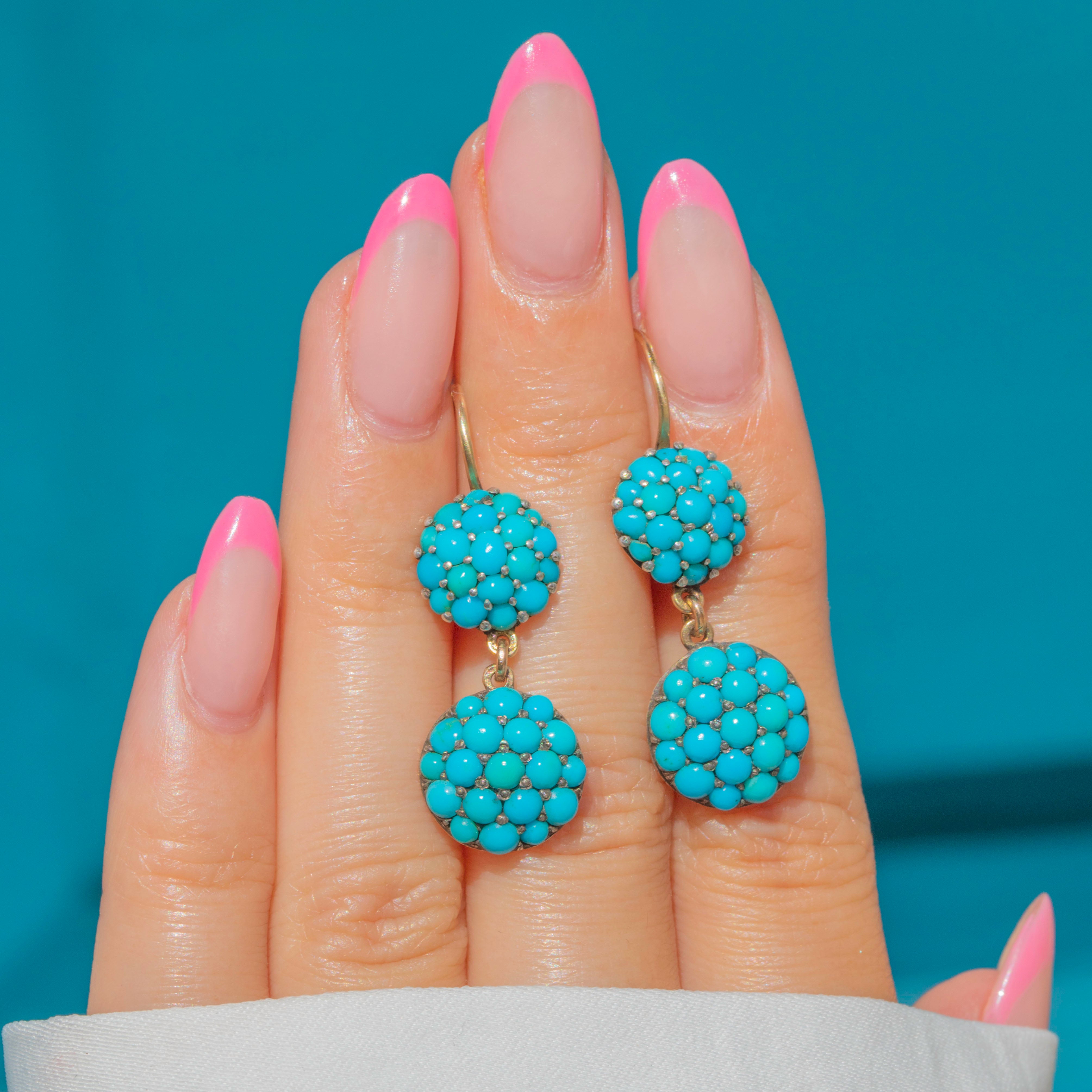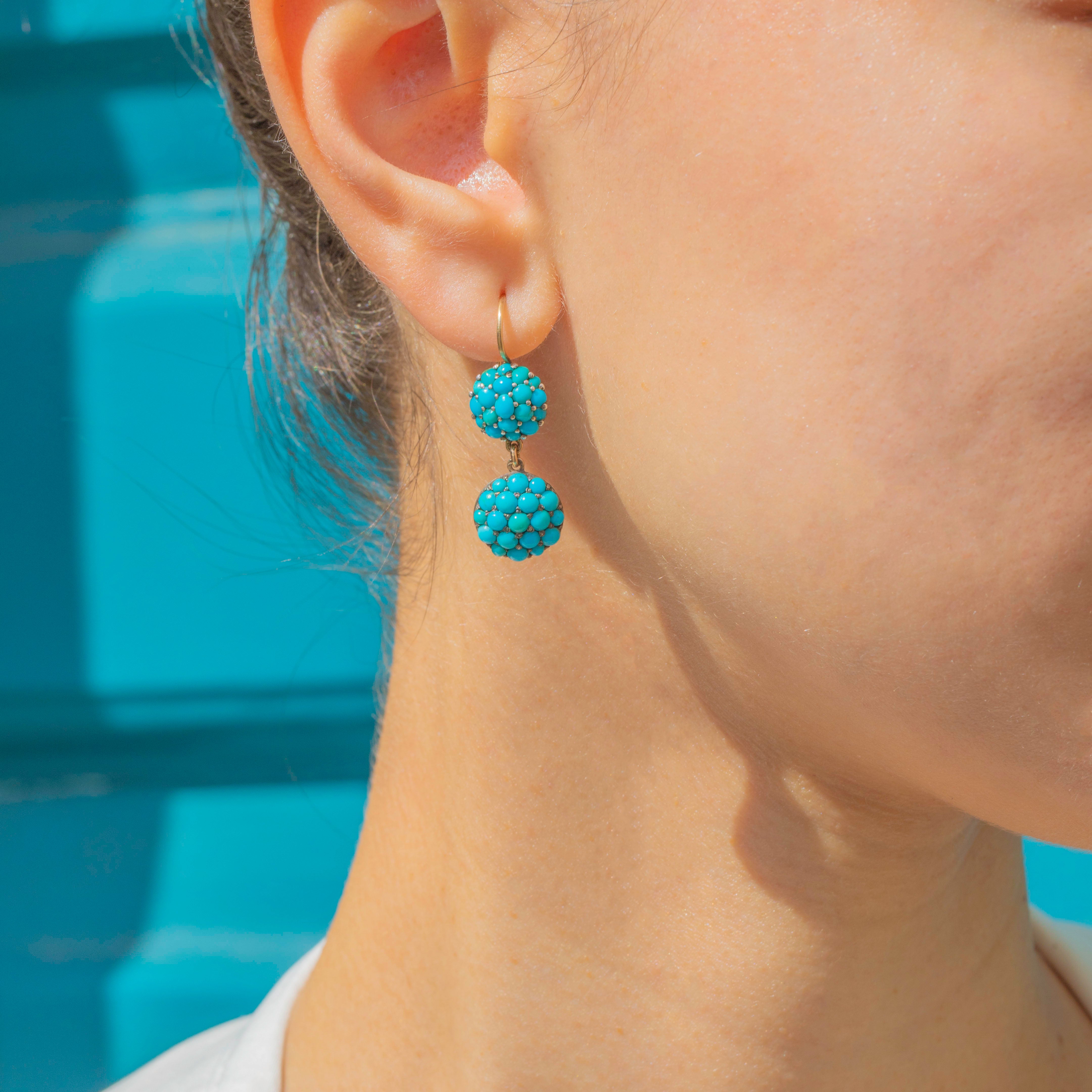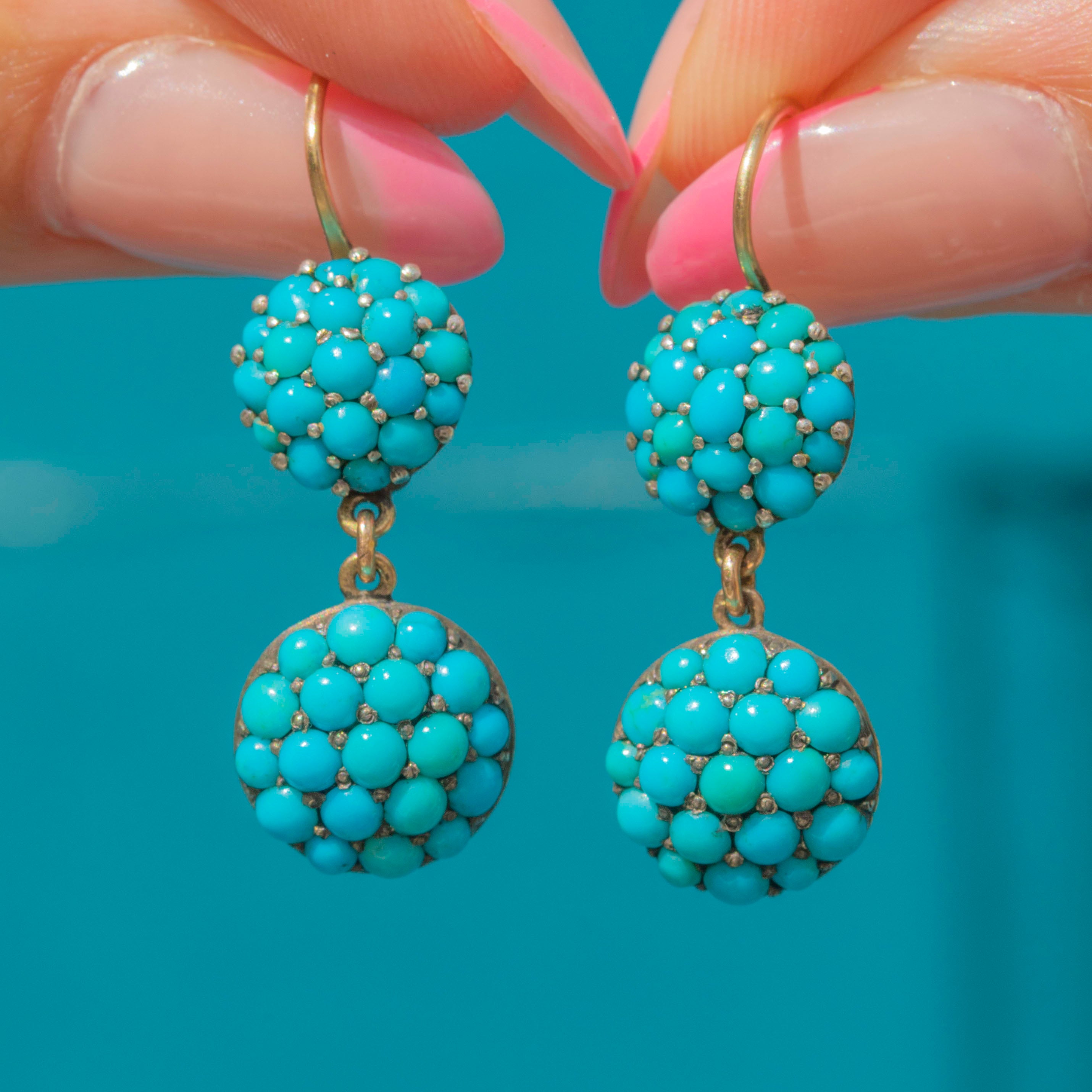 VERY GOOD: These Victorian 9ct Gold Turquoise bombé drop earrings are in remarkably good condition for their age. The Turquoise stones are securely set and display a vibrant colour that enhances their classic bombé design, with only mild wear commensurate with age. There is only minimal wear to note, just a few light surface marks and wear to the Gold on the back of the earring, entirely in keeping with their antique nature. Complete with 9ct Gold hooks, they’re comfortable to wear and effortlessly elegant!